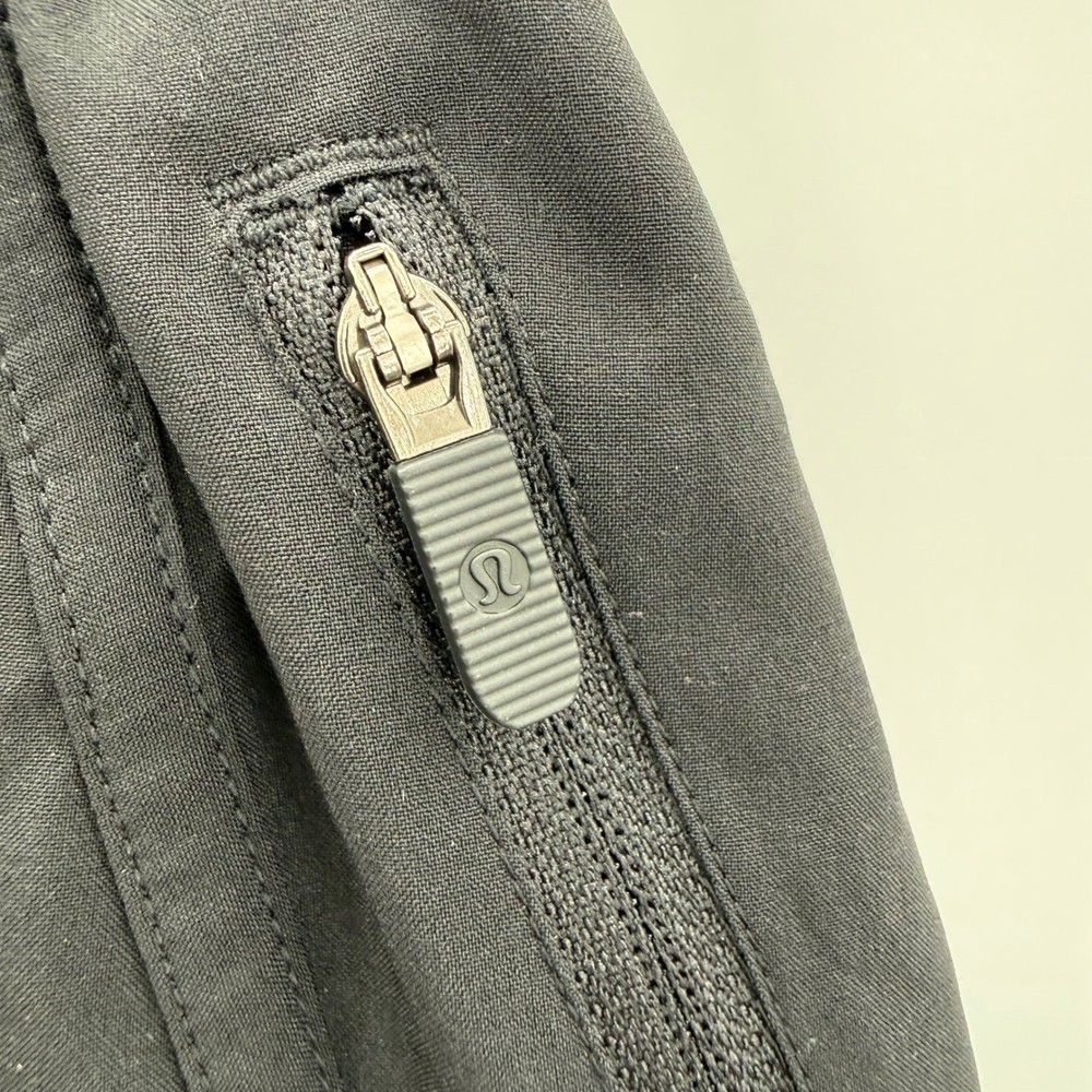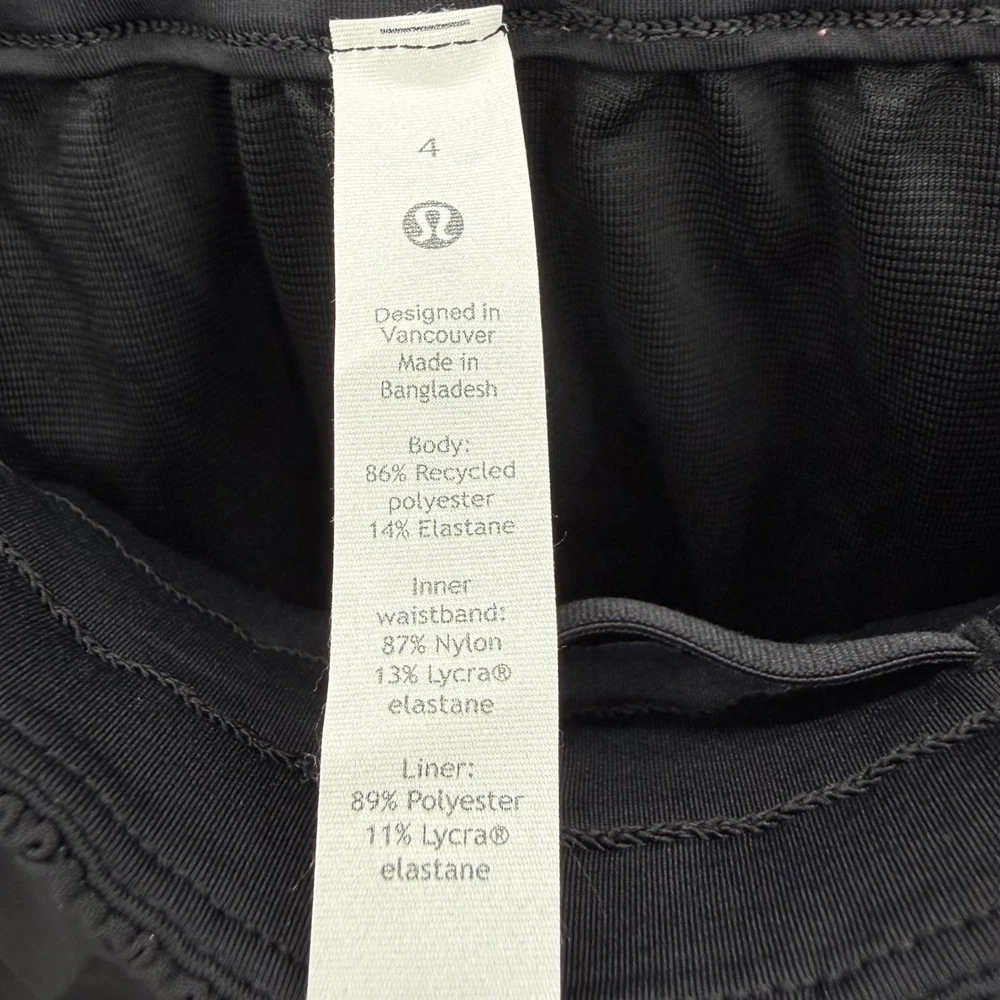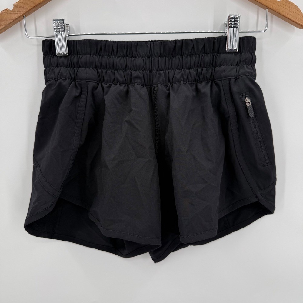 Lululemon Speed Up shorts in black. These athletic shorts feature a high-rise waistband with a comfortable elastic gathering and a drawstring. A zippered pocket on the back right hip provides secure storage for essentials. The Lululemon logo is visible on the left hem. Measurements: • Waist: 23 in • Rise: 8.5 in • Inseam: 4 in Department: Women Style: Athletic Performance/Activity: Running & Jogging, Gym & Training, Cross Training, Dance, Walking Inseam: 4 in Fit: Athletic Material: Polyester Blend, 100% Polyester, 100% Nylon, Elastomultiester, Lycra® elastane Fabric Type: Microfiber Keywords: Lululemon shorts, athletic shorts, running shorts, training shorts, high rise, zipper pocket, quick dry, breathable, performance, athleisure, sporty, active shorts, fitness shorts
