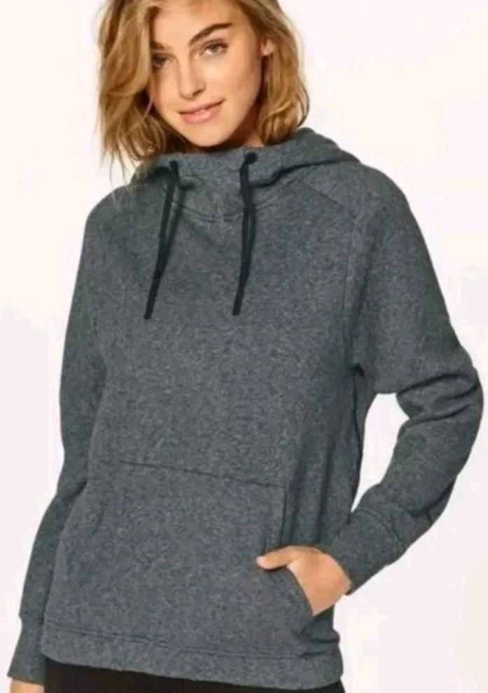 Light Cotton Terry fabric is lightweight, naturally breathable, and soft against your skin For: Office Travel Commute Ventilation: Bonded eyelets for airflow Kangaroo pocket : For easy access to your essentials High neck helps keep you warm Hidden pocket to stash your cards and key In good condition! Pit to pit 22" Length 24"