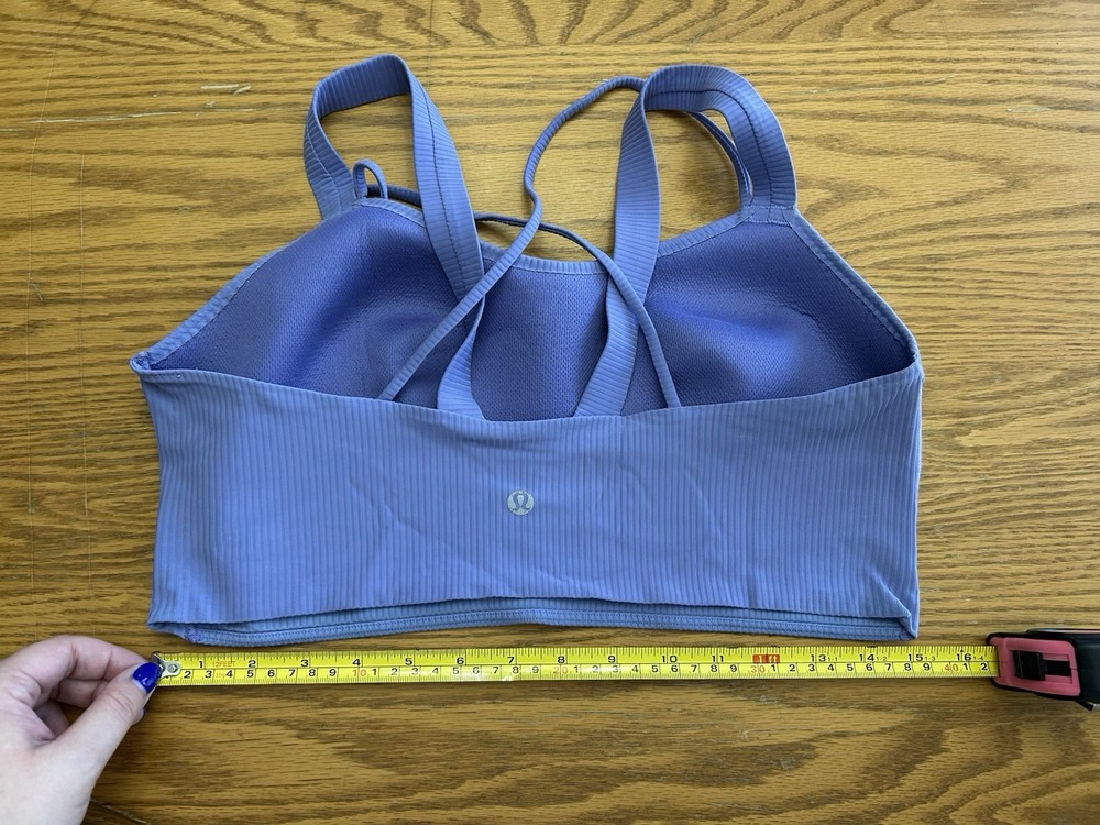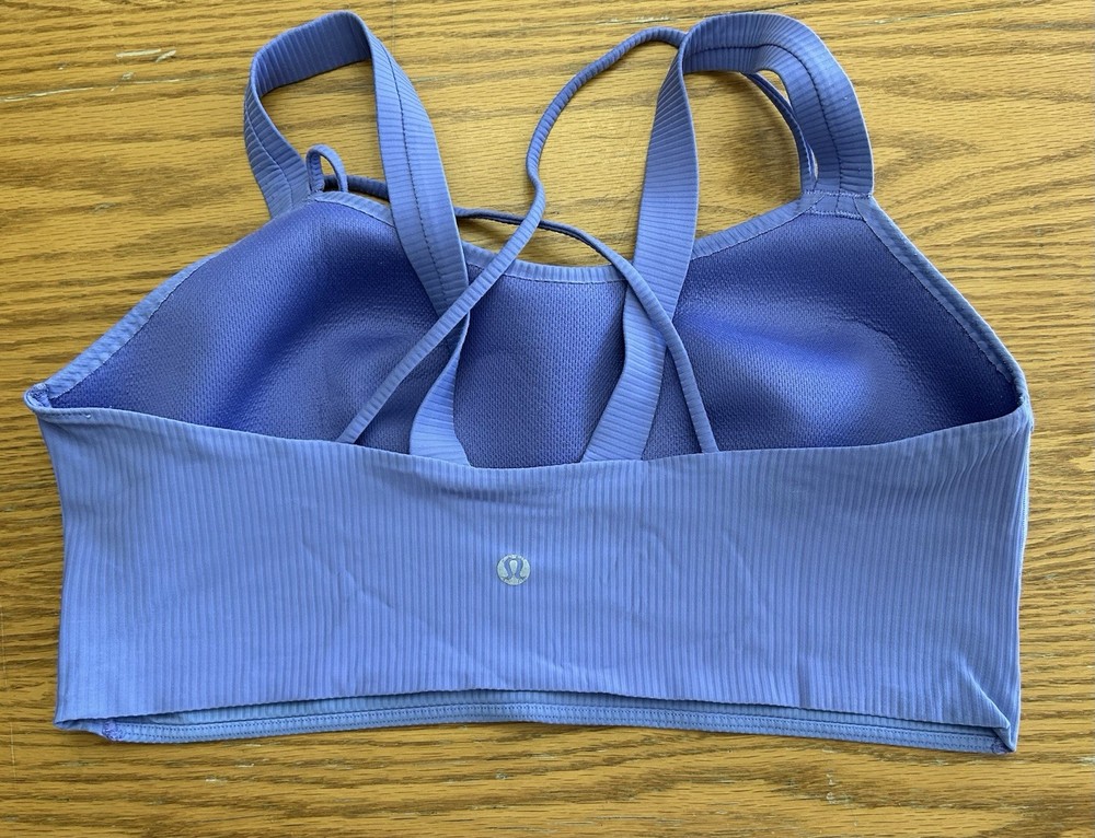 The Lululemon Women's Light Purple Athletic Sports Bra in Size Large is a stylish and functional activewear piece perfect for yoga or any other athletic activity. The crossback strap design provides added comfort and support, while the wireless underwire construction offers a seamless and breathable fit. Made from a blended fabric, this sports bra is machine washable for easy care and features the signature Lululemon logo accent. With full cup coverage and a regular size type, this bra is a versatile and practical choice for active women looking for a high-quality athletic top. I believe it is size M/L. Fits probably closer to a Large. Light purple