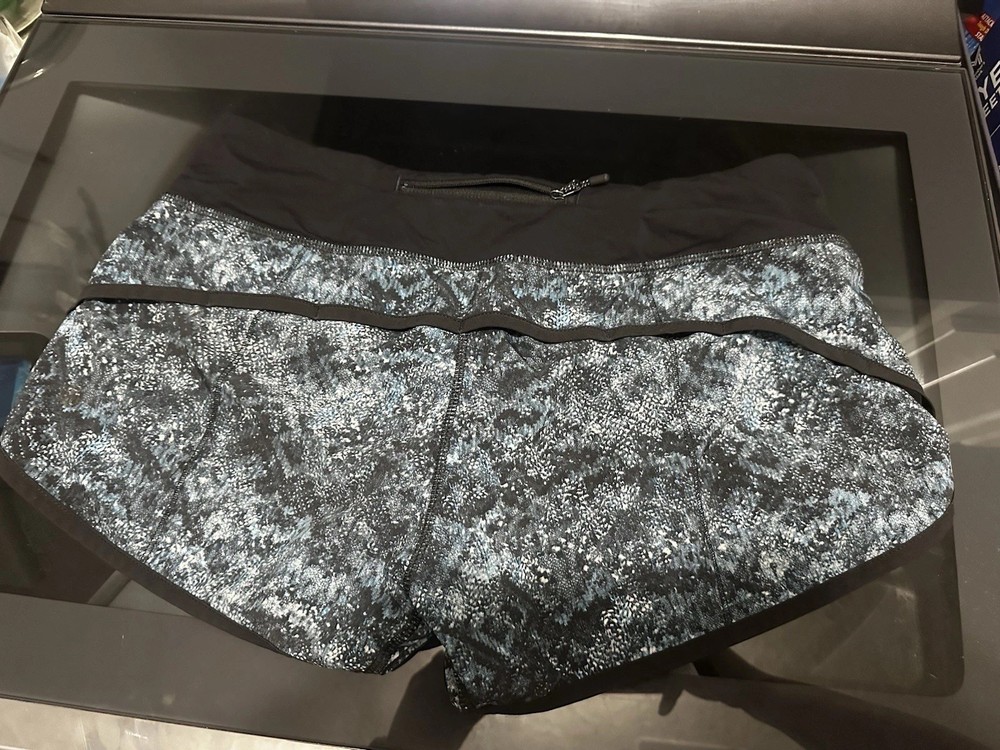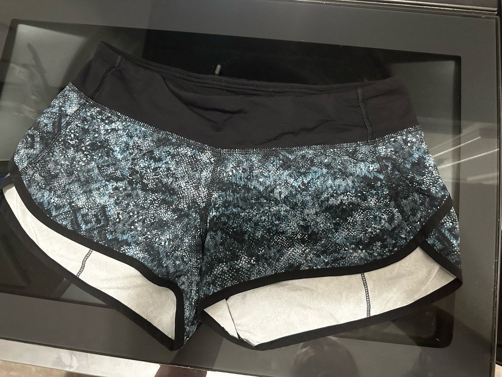 The Lululemon Women's Speed Shorts in size 6 feature a 2 1/2 inch inseam, making them perfect for running and jogging in the spring, summer, or fall. These athletic shorts in blue and black are made from a blended fabric that offers stretch and comfort. The drawstring closure and lined interior provide a secure and comfortable fit for active women. Machine washable for easy care, these shorts are a versatile addition to any activewear collection.