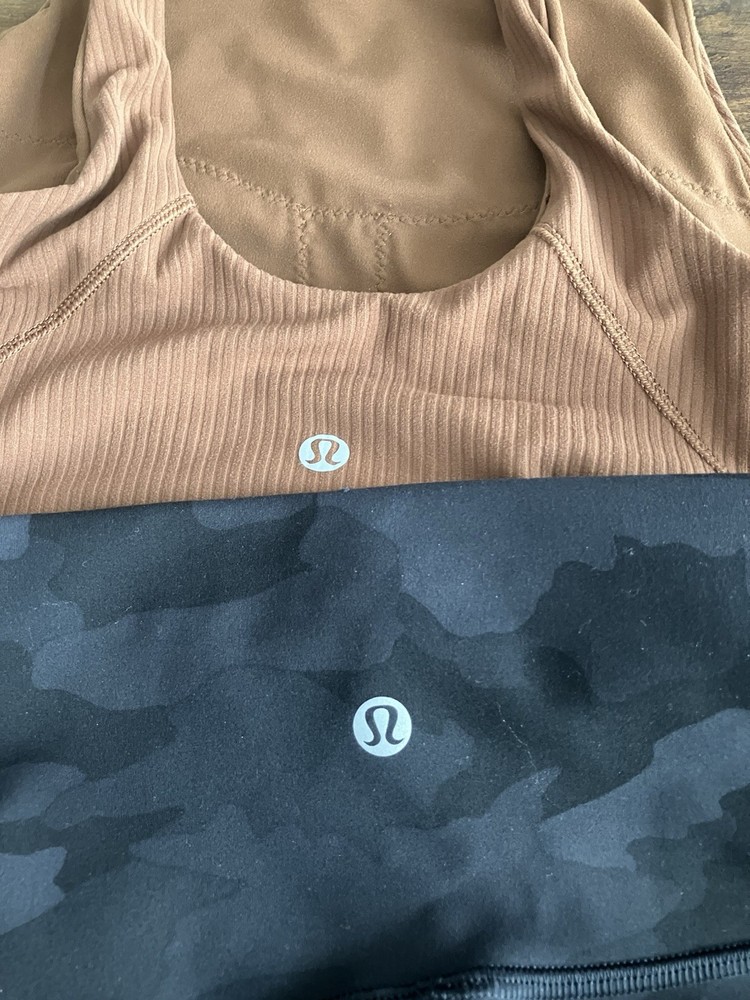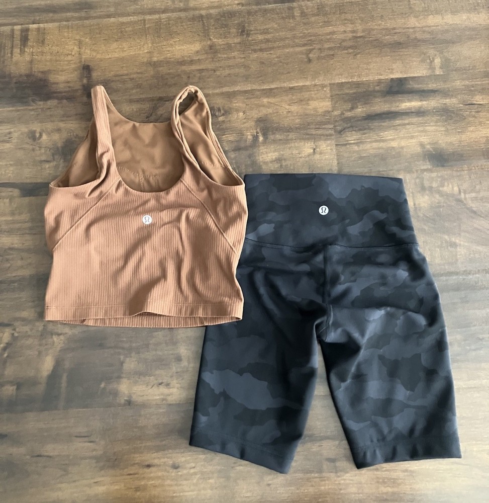 PLEASE BE PREPARED TO MAKE IMMEDIATE PAYMENT AT AUCTION CLOSE. IF THIS IS NOT COOL WITH YOU, PLEASE DON’T BID! Lot of 2! Lululemon Size 2 1. Lululemon Wunder Train High Rise Short 8" - Heritage 365 Camo Deep Coal Multi 2. Lululemon Align Ribbed High-Neck Tank Top - Roasted Brown. Does not include cups. Both items in very good condition. Items come from a pet/smoke free home. Shipping will be $5 in USA, $20 in Canada, International please contact for a quote. Please ask any questions, no returns accepted.