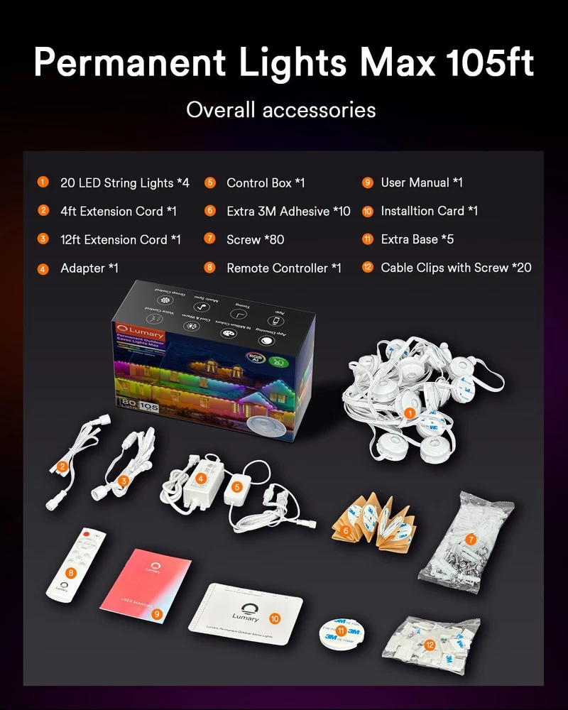 Store New Arrivals Add to Favorite View Feedback Contact Lumary Permanent Outdoor Lights Max 105Ft with 80 LED Eave Lights 4800Lm, RGBAICW Smart Outdoor Lights IP67 Waterproof, IC Control &Scene Modes for Halloween Christmas Decoration, Works with Alexa Description Item model number L-PO80A1 Light Source Type LED Style Modern Number of Items 1 Power Source AC Number of Light Sources 80 Country of Origin China Theme Parties, Music, Christmas, Halloween Batteries Included? No Maximum Compatible Wattage 72 Watts Controller Type Wired Controller Connectivity Protocol Wi-Fi Wireless Communication Technology Wi-Fi Brand Lumary Material Plastic Seasons All Seasons Package Dimensions 12.52 x 10.75 x 6.61 inches Manufacturer Lumary Color Rendering Index (CRI) 80 White Brightness 60 Lumens Indoor/Outdoor Usage Outdoor Bulb Base Wedge Control Method App, Remote, Voice Bulb Features Dimmable, Color Changing, RGBAI+WW+CW Water Resistance Level Waterproof Batteries Required? No Item Weight 9.3 pounds Connectivity Technology Wi-Fi Occasion Multi-occasion Special Features 5-in-1 RGBAI+WW+CW, IC Control, RGBAI Color Changing, IP67 Waterproof, Detachable base Special Feature 5-in-1 RGBAI+WW+CW, IC Control, RGBAI Color Changing, IP67 Waterproof, Detachable base Part Number L-PO80A1 Switch Installation Type Wall Color Temperature 2200 Kelvin Certification ETL FCC Color RGBAICW Wattage 90 watts Light Color Multicolor Shape Round Voltage 36 Volts Included Components 20 LED Eave Lights Strand*4, Extra 3M adhesive*10, Extra base*10, cable clip*20, Adapter*1, Control Box*1, Remote Controller*1, Installtion Card*1, Screw*80, 4FT extension cord*1, 12FT extension cord*1 Luminous Flux 4800 Lumen Size 105FT Innovative Detachable Base Design: Lumary permanent outdoor lights for house are equipped with an advanced removable base, with an enhanced 3M adhesive and screw-reinforced mounting method for added stability. In case of any issues, simply replace the light string, keeping your holiday and Christmas outdoor lights glowing throughout the year RGBAICW 5-in-1 LED Technology: The total brightness reaches up to 4800 lumens, providing excellent illumination with a 100° beam angle. The advanced lens design ensures better clarity and increased brightness, making it ideal for daily accent lighting and permanent holiday lighting DIY Individual Light Control: Customize each light's color, brightness, and switch with single-point control, giving you endless DIY possibilities. Great for creating a personalized setup for Halloween decor, festival lights, or any seasonal event Scene Modes for Any Occasion: Choose from over 55 preset scene modes, all customizable to fit your mood or holiday celebration. Whether you're decorating for Christmas, Halloween, or any festival, these all-season outdoor lights create the right atmosphere Reliable Durability: Built with UV-resistant materials and an IP67 waterproof rating, these year-round outdoor lights withstand rain, snow, and extreme temperatures (-4°F to 140°F). Designed for reliable use as permanent Christmas lights in any weather condition Multiple Control Methods: Manage your permanent holiday lights effortlessly through the Lumary App (2.4G WiFi only), Alexa, Google Assistant, or the convenient control box. A great choice for smart home integration and year-round outdoor lighting Versatile for Any Celebration: Lumary permanent lights outdoor are suited for all your holiday needs, from Christmas to Halloween, New Year's, and parties. Enjoy dynamic lighting effects that complement every occasion with Lumary's versatile festival lights Easy Installation on Any Surface: Whether mounting on metal, concrete, wood, or drywall, these permanent outdoor lights are easy to install using either 3M adhesive or screws. No need to hire an electrician—set up your Christmas decoration lights with ease NOTE: ① The 53ft and 105ft versions can be connected to a 13ft extension LED light string at most. (Not included in the package, available for purchase), the 158 ft version does not. ②The 105ft and 158ft versions provide a connecting cable (included in the package), 53ft versions do not. NOTE: Please don't link (2)set of lights together, because the adapter power is not enough to drive 2 sets of lights. Product Description Lumary Permanent Outdoor Lights Max Illuminating Love: A Proposal with Lumary Light Contract - A Lumary Love Story. When he gets down on one knee, she says ‘yes,’ and the moment is made even more unforgettable by the radiant glow surrounding them. Whether it’s the soft hues of romance or the vibrant colors of celebration. The video showcases the product in use. The video guides you through product setup. The video compares multiple products. The video shows the product being unpacked. Lumary Permanent Outdoor Lights Max Party Lights Unleashed: Lumary Transforms the Night! Get ready to light up your night! From vibrant colors to seamless control, transform your space into a party-ready wonderland. Watch as we unleash the ultimate vibe—because every room deserves to shine. Don’t miss out—bring the glow home and turn your house into the ultimate party spot! The video showcases the product in use. The video guides you through product setup. The video compares multiple products. The video shows the product being unpacked. Lumary Permanent Outdoor Lights Max Ultimate Excellence, Lumary's Lasting Glow Dive into the ambience of Lumary Permanent Lights Max! Transform a home into a haven of light, offering a brilliant display without the hassle of setup. Experience the magic as we illuminate endless possibilities. Let there be smart! The video showcases the product in use. The video guides you through product setup. The video compares multiple products. The video shows the product being unpacked. Lumary Permanent Outdoor Lights Max Ignite the Darkness, Control the Fear Bends the darkness to your will. Watch as haunting reds and ominous oranges flicker and pulse, casting