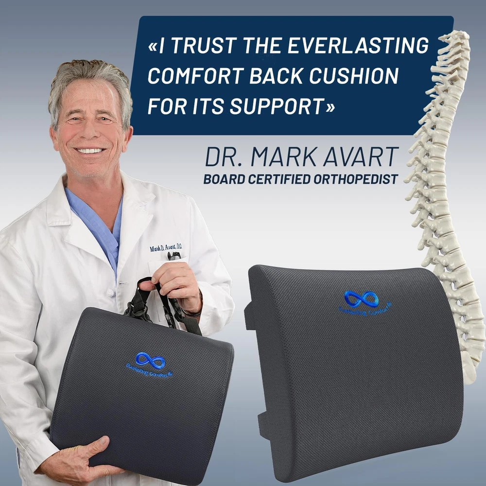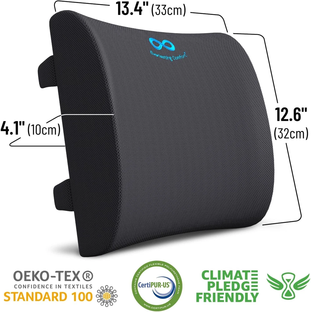 Lumbar Support Pillow for Car or Office: Contours to your body, targeting lower back discomfort; ideal for long hours sitting in office chairs, car seats, or on the couch. Our comfortable back pillow or car pillow provides great chair back support Promotes Better Posture and Back Support: Mimics the spine's natural curve to support your upper, middle and lower back, for comfortable all-day back support for office chair. The lumbar car pillow for driving seat makes your commute more comfortable Durable and Easy to Maintain: The Everlasting Comfort seat cushion, high-quality memory foam maintains its shape, and the removable, washable cover ensures long-lasting cleanliness and durability for everyday use Universal Fit Office Chair Cushion: Adjustable straps and extensions fit chairs up to 32" wide; perfect for office chairs, car seats, wheel chairs, couches, and more. Our lower back pillow provides exceptional car back support and couch back support Breathable Mesh Cover: Our back pillow for chair promotes air circulation, keeping you cool during long sitting hours. The chair pillow cover is removable and machine washable for easy cleaning Product Description Sitting Without Back Pain is Possible with the Everlasting Comfort Back Cushion Get the best in back support and comfort with our Lumbar Support Pillow. Whether you’re taking a road trip, traveling, pulling an all-nighter on a paper, or trying to meet a deadline at work, our chair back cushion provides your back with the support it needs to keep back pain at bay. Back Cushion for Office Chair Heat responsive memory foam provides the perfect soft, but firm density for support and comfort Lumbar Support Pillow for Office Chair Curved to match the natural shape of your spine, it adapts to and hugs your back where needed most Chair Back Support Place the lumbar cushion anywhere along the chair's back and securely attach it with the straps Back Support Pillow The breathable cover allows heat to escape, keeping you cool without any embarrassing back sweats 1 Doctor Recommended 2 Premium Memory Foam 3 Ergonomic Curved Design 4 Dual Adjustable Straps 5 Breathable Washable Cover The Lumbar Support You Need to Achieve Total Comfort and Overall Well-Being The video showcases the product in use. The video guides you through product setup. The video compares multiple products. The video shows the product being unpacked. Say Goodbye to Bad Posture and Back Pain Once and for All Proper lumbar support for your back’s natural curves goes a long way to reducing back tension and pressure. Our ergonomically designed back cushion is curved to allow you to sit up with the comfort and support needed to reduce slouching and improve overall sitting posture. Fits Most Chair Types Versatile, it can be used on office chairs, gaming chairs, car seats, airplane seats and any other chair up to 32" (81cm) wide Easy to Install While most low quality lumbar pillows offer just one flimsy strap, our dual adjustable straps can be secured tightly to prevent your office chair cushion from falling or sliding Made with Certified Safe Materials In our commitment to providing you with the highest quality items, our lumbar cushion has been tested by OEKO-TEX to earn the coveted STANDARD 100 label meaning every component is certified safe Check Out Other Products By Everlasting Comfort Add to Cart Add to Cart Add to Cart Add to Cart Add to Cart Customer Reviews 4.6 out of 5 stars 27,883 4.3 out of 5 stars 94,211 4.6 out of 5 stars 3,404 4.6 out of 5 stars 3,404 4.3 out of 5 stars 19,040 Price $36.99 $ 36 . 99 $35.09 $ 35 . 09 $19.99 $ 19 . 99 $19.99 $ 19 . 99 $32.99 $ 32 . 99 Material Memory Foam Memory Foam Memory Foam Micro Texture Cloth Surface Memory Foam Features Doubles as a foot rocker U shaped coccyx cutout Keyboard wrist pad included 15 color modes U-shaped coccyx cutout Ideal For Feet, legs, lower back Tailbone, lower back, legs For all mouse & keyboard types All mouse and keyboard types Tailbone, lower back, legs Dimensions 17”x5”x10” 17.5”x14”x2.75” 9"x10.6" 17"x3"x1" 31.5”x11.8” 17”x13”x3” Machine Washable ✔ ✔ ✘ ✘ ✔ Benefits of a back cushion? Back support pillows help bridge the gap between the comfort and support your current chair lacks. Our back cushion contours around the natural curve of your spine to lessen discomfort, improve your sitting posture, and reduce sitting fatigue. Can chairs cause back pain? Most chairs are designed with a straight back. This leads to you sitting hunched over, causing pressure and pain in your neck, shoulders, back. Adding a lumbar cushion to your chair is an easy, affordable way to upgrade your uncomfortable seat. Are back cushions healthy? If you often have pain in your back, neck, or shoulders, a back pillow can help improve discomfort while sitting. Our back support is designed with premium memory foam to provide a soft, yet firm foundation to support a healthy sitting posture. How to apply this back cushion? Our lumbar support cushion can be placed anywhere on your chair to support your upper, middle, or lower back. Dual adjustable straps ensure it stays in place, even if you shift about. Fits virtually any chair with a maximum width of 32” (81cm). How do you clean the back cushion? Our back support for office chairs features a removable cover that’s easy to clean and keep fresh. Simply unzip the cover from the memory foam, and toss cover into the wash on the gentle cycle. Tumble dry with low heat for best results.