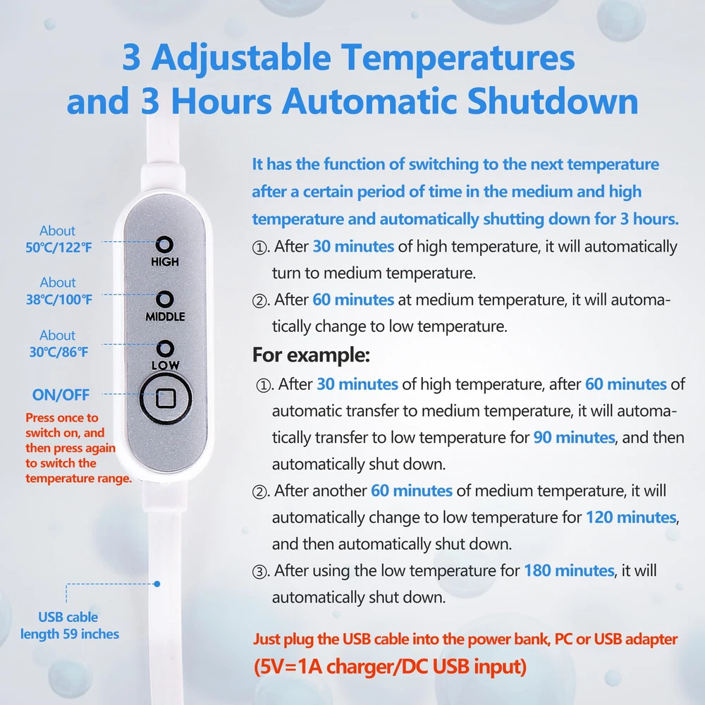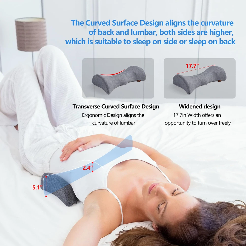 【 Heated Lumbar Support Pillow 】 We added heat function on the basis of ordinary lumbar pillow. Lumbar pillow follows the natural arch of the lower back, providing comfort and mild support for the lumbar and help improve wrong posture. Combined with graphene heating therapy, it appropriate relieves waist pain, sciatic nerve and scoliosis, and keeps your hip and spine in ideal alignment while sleeping. (NOT USING the heating function while sleeping.) 【 Ergonomic Lumbar Pillow 】 The wrapped -wing design to help improve spine posture, prevent the strain of lumbar muscles and make the lumbar spine stretch, perfect for relieving lumbar pressure evenly keep the waist curve. The waist support pillow fills the gap between the waist and bed, gently supports the lower back, and distributes the pressure to reduce the burden on the lower back, relax the muscles of the lower back and waist. Help achieve an ideal posture and a fit to the waist. 【 Thermal Therapy 】 When you choose to use USB heating function (Temperature regulation and automatic shut-off), heated lumbar pillow help blood circulation, and relieve lower back pain, sciatic nerve. 9 convex points are designed to help take care of the lumbar spine. The USB heating lumbar pillow has 3 adjustable temperatures and 3 hours automatic shutdown function, provide you with comfortable temperature to meet the heating requirements of most customers. 【 Premium Memory Foam 】 Inner material is made with 100% premium quality high density memory foam, which can retain its shape for continued support With breathable and moisture-wicking properties, comfortable back lumbar pillow provides long-lasting comfort for hours. Superior to other bed positioned pillows, it won't go flat over time and provides moderate support and spinal alignment. Our lumbar bed pillow comes with hypoallergenic, removable zipper breathable pillowcase, easy cleaning. 【 Widely Application 】 This lower back pillow lumbar support cushion not only relieve your lower back Pain while adapting to the curve of your spine when sleeping on your lower back, but also can be placed in the calf or below the knee as a leg pillow. Waist pillows apply for bed, chair, sofa, you can relax your waist and relieve waist fatigue at home, in the office and in the car at any time. Suit for side sleeper, back sleeper, stomach sleeper, Long time driver, desk workers. * Regarding the USB heating function, this product can't be recharged, it can only keep the USB cable connected to the power supply to use the heating function, there is no plug or power supply in the package, only USB cable with controller. When using, you need to plug the USB cable into the power bank, PC or USB adapter (5V=1A charger/DC USB input). Do not use the heating function in a closed space without heat dissipation, such as a bed quilt, to avoid burns. * When using the USB heating function, do not use it on the surface of thick clothes, otherwise the heating heat will not be felt. If it heats up too quickly, you can use clothes and towels to keep a certain distance from your back, use the controller to adjust the temperature or temporarily turn off the power. * The height of the lumbar pillow is 2.4 inches at the center and the length is 17.7 inches.