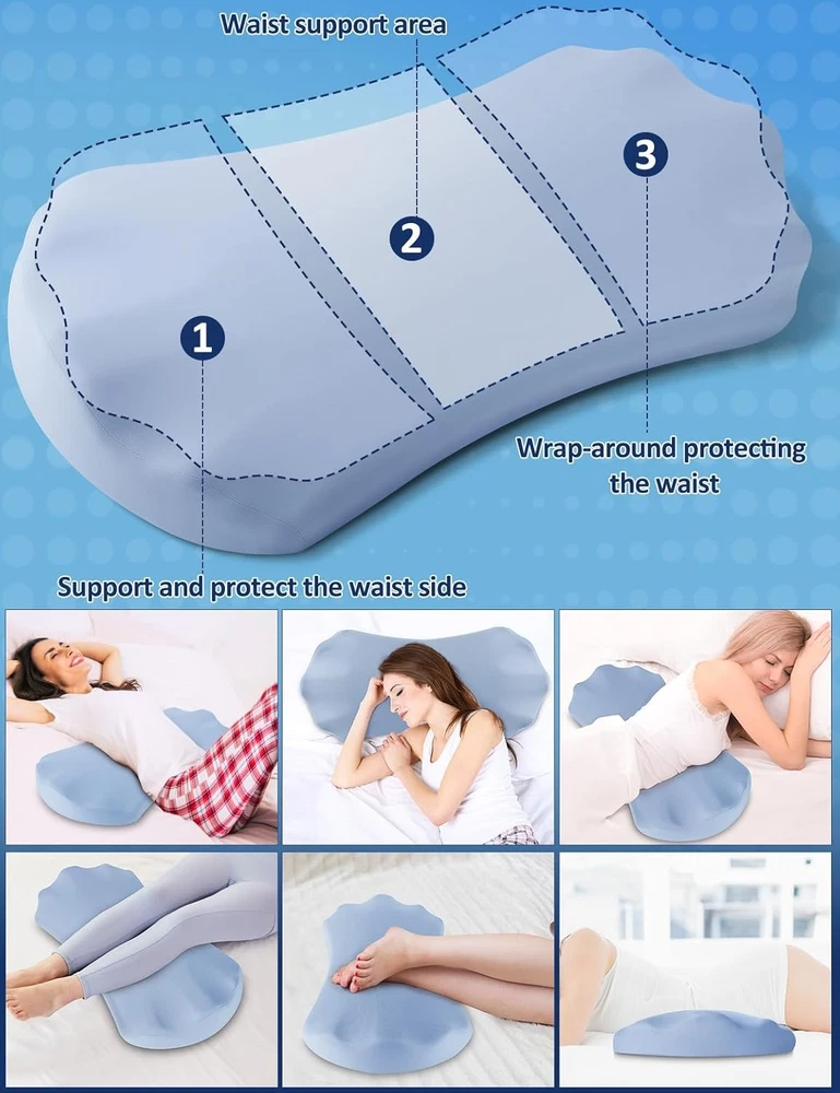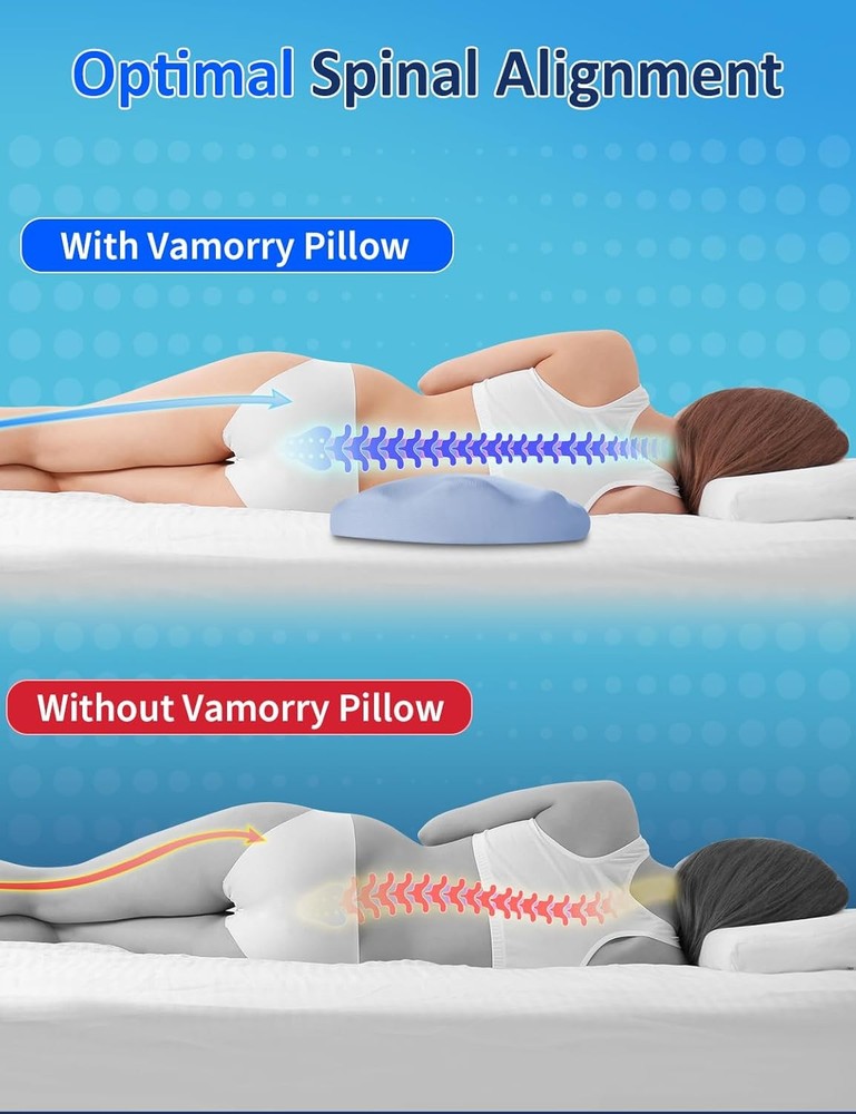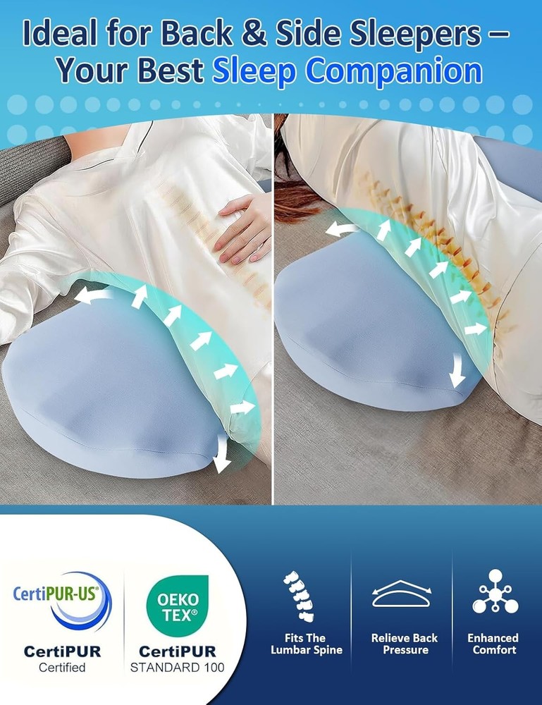 About this item 【All-Night Back Comfort for Side & Back Sleepers】– Designed as a lumbar support pillow for bed. Place it under your lower back to gently fill the gap between body and mattress for side & back sleepers, improving alignment and nightly comfort. 【High-Density Memory Foam】– Slow-rebound core contours to you and holds its lift all night, delivering steady lower-back support without collapsing. 【Breathable, Washable Cover】– Soft knit fabric with a hidden zipper; zips off for machine wash to keep your sleep setup fresh and hygienic. 【Versatile Bed Use】– Also be used under knees, under legs, under feet or as a leg elevation bolster to provide comfort and effective pain relief where you need it. Bed support pillow for back and side sleepers to provide lower back pain, hip pain, leg pain and joint pain relief. 【Natural Fit, Personalized Comfort】– We want to emphasize that while our pillow is designed to suit a wide range of preferences and needs, it might not be the ideal fit for all body types or comfort preferences. This is a common characteristic of products designed for ergonomic support and comfort. We encourage giving the pillow a fair trial period to adapt to its feel and support. 【Warm Tips】– This lumbar support pillow is made of medium-density memory foam and is designed for soft, cushioned support — not firm orthopedic correction. It offers mild elevation and is best suited for back or side sleepers looking for gentle lower back comfort.