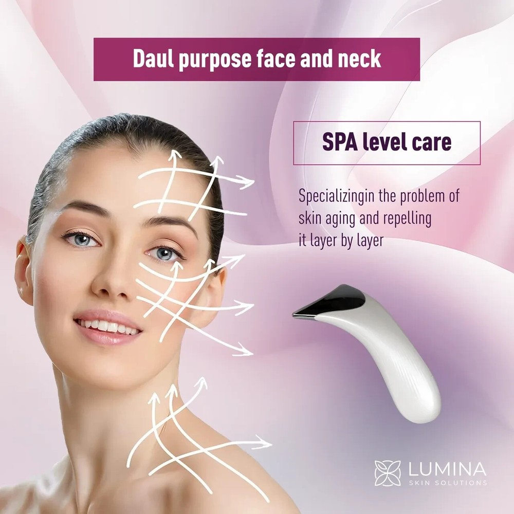 Introducing the Lumina LED Contour, a dual-purpose face and neck spa level care device. Enhance your skincare routine with this innovative LED technology for visibly lifted and rejuvenated skin. Lumina LED Contour combines the power of TriGen technology, which merges three clinically proven energies: Electrical Muscle Stimulation (EMS), Radio Frequency (RF), and LED Light Therapy (red, blue, and green) to deliver superior results in facial rejuvenation and promote optimal skin health. This revolutionary device targets each of the three skin layers to restore facial definition, improve the appearance of aging skin, enhance circulation, and assist in lymphatic drainage. Lumina LED Contour helps regenerate the skin, redefine the shape of the face, improve skin texture, and strengthen muscle tone, providing a youthful look. Immediately after use, the skin feels tight, firm, and lifted. Over time, and with regular use, the skin will start producing more collagen and elastin, revitalizing both the physical appearance and the feel of the skin. With Lumina LED Contour, you can have a salon experience at home without costly cosmetic treatments, improving the skin’s appearance, reducing wrinkles, and increasing collagen and elastin production. Features: TriGen Technology: Combines Electrical Muscle Stimulation (EMS), Radio Frequency (RF), and LED light therapy with three colors (red, blue, and green). Additionally uses heat therapy, galvanic therapy, and sonic vibration. For Face and Neck: The device treats the entire surface of the face and neck, with complete coverage of all three layers of the skin. Portable and easy to use: A compact, lightweight device that you can use in the comfort of your home. Adjustable intensities: Different levels of intensity for each therapy, for a customized experience according to your needs and skin tolerance. Wireless use: Easy charging and long-lasting battery. echnology: Microcurrent Technology: Stimulates and tones the facial muscles, visibly reducing wrinkles and fine lines for smoother, younger-looking skin. This technology mimics the body’s natural electrical current to rejuvenate facial structure. Red Light Therapy: Promotes collagen production, improves skin elasticity, and helps reduce signs of aging. The red light penetrates deep into the skin to stimulate repair and cell renewal. Blue LED Light Therapy: Targets acne-causing bacteria, reducing acne and promoting a clearer complexion. Blue light therapy is effective in minimizing inflammation and preventing future acne outbreaks. Green LED Light Therapy: Balances skin tone, reduces pigmentation, and improves overall skin clarity. The green light targets melanocytes, breaking down existing melanin clusters and preventing new formations. Facial Massage: Improves blood circulation and lymphatic drainage, reducing swelling and promoting relaxation. Regular massage helps achieve a refreshed and radiant appearance. Heat Therapy: Enhances the absorption of skincare products, ensuring deeper penetration and maximum effectiveness. The warmth soothes the skin and enhances the benefits of your skincare routine. Galvanic Therapy: Deeply cleanses and nourishes the skin by removing impurities and improving moisture retention. Galvanic currents help detoxify the skin and improve hydration levels. Sonic Vibration: Provides gentle exfoliation and promotes smoother, more radiant skin. Sonic vibrations help remove dead skin cells and stimulate the skin's surface for a healthier appearance. Benefits: Skin Rejuvenation: Helps reduce wrinkles and fine lines, improving skin elasticity. Increased collagen and elastin production: Encourages natural skin regeneration, making the skin firmer and fresher. Improved skin texture: The blue and green LED light modes target dark circles, spots, and acne while balancing pigmentation. Lifting and toning: Electrical Muscle Stimulation (EMS) tightens the skin and strengthens facial muscles. Detoxification and better circulation: Radio Frequency and LED light therapy improve circulation and lymphatic drainage. Promotes skin glow: Facial massage increases blood circulation, giving the skin a healthy and radiant glow. Enhanced product absorption: Therapeutic heat helps your skincare products penetrate deeper for maximum benefit. Deep cleaning: Galvanic therapy removes impurities, leaving your skin deeply cleansed and nourished. Smooth and radiant skin: Sonic vibration gently exfoliates, creating smoother and more radiant skin. How to Use: Cleansing : Thoroughly cleanse your face before using the device. Preparation : Apply a serum or gel that is compatible with EMS and RF therapies. LED Light Therapy : Select the light color based on your needs: Red light to reduce wrinkles and boost collagen. Blue light to combat acne and bacteria. Green light to balance skin tone and reduce spots. EMS and RF Treatment : Adjust the intensity of muscle stimulation and radio frequency, then move the device slowly over the face and neck. Duration : Use the device for 10-15 minutes per session, 2-3 times a week. What’s in the Box: Lumina LED Contour Device USB Charging Cable User Manual Carrying Pouch Serum for EMS and RF Therapy Support Visible Results: First Results : Immediately after the first use, the skin feels tighter and lifted. After 4 Weeks : You will notice significant improvements in skin texture and tone, with reduced fine lines and wrinkles. Long-term Results : With regular use, the skin will produce more collagen and elastin, providing a rejuvenated and fresher look in the long run.