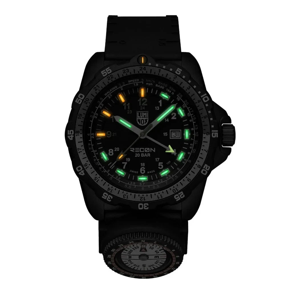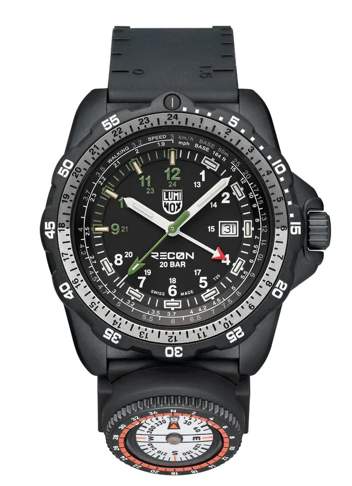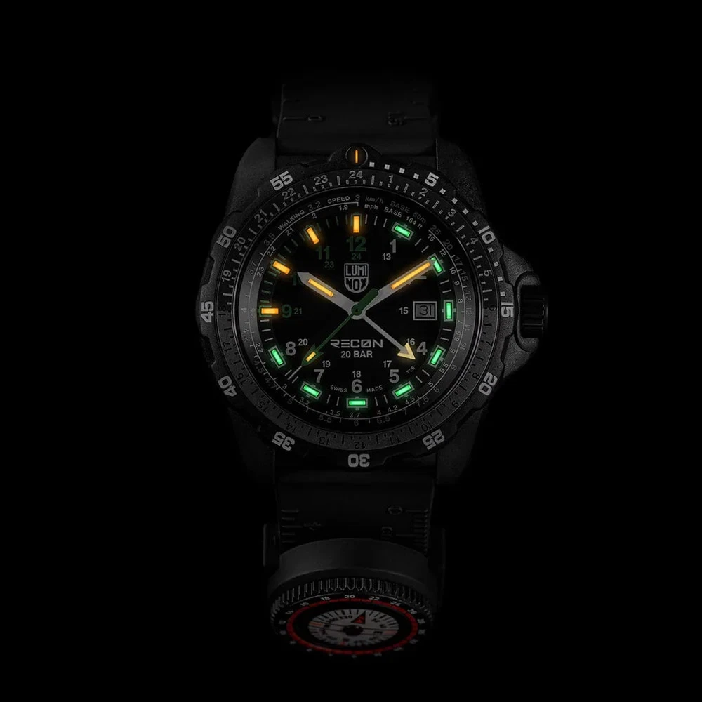 Description Engineered for precision, durability, and real-world tactical performance, the Luminox XL.8837.2 GMT Navigation Watch is built in collaboration with renowned tactical specialist Andrea Micheli . Designed for professionals who rely on accuracy in the field, this rugged 46mm timepiece combines advanced materials with mission-ready functionality. Crafted with an ultra-lightweight yet exceptionally strong CARBONOX™ case , the watch features a unidirectional rotating bezel with a two-tone aluminum ring insert for reliable timing and navigation. Its bold dial includes vibrant grasshopper-green indexes (9–12) and a matching second hand for enhanced visibility and standout styling. A scratch-resistant sapphire crystal with anti-reflective coating ensures clarity in all environments, while the 200-meter (660 ft) water resistance rating makes it suitable for swimming, diving, and extreme conditions. Powered by a Swiss-Made RONDA 515.24H quartz GMT movement , the XL.8837.2 allows you to track two time zones simultaneously , perfect for global missions, travel, or international operations. The black nitrile rubber strap includes integrated map scales, ruler markings , and even Morse code on the underside—plus a detachable compass —transforming the watch into a complete navigation instrument. Thanks to Luminox Light Technology (LLT) , this watch maintains a constant self-powered glow for up to 25 years , ensuring readability in total darkness. The XL.8837.2 is also part of Luminox’s sustainability initiative as a fully CO₂-neutral watch , compliant with Greenhouse Gas Protocol scopes 1, 2, and 3. Watch Details Model: XL.8837.2 Movement: Swiss-Made RONDA 515.24H Quartz (GMT + Date) Functions: Time, Date, GMT 2nd Time Zone Weight: 99g Swiss Made Sustainability: CO₂-neutral production (scopes 1, 2, 3) Technical Specifications Movement RONDA 515.24H Swiss Quartz GMT 2nd Time Zone + Date Constant glow technology (LLT) lasting up to 25 years Case Material: CARBONOX™ Size: 46 mm Thickness: 13.5 mm Water Resistance: 200 meters / 660 ft / 20 ATM IP Black 316L Stainless Steel Screw-on Case Back Uni-directional Rotating Bezel with Two-Tone Aluminum Insert Crown & Crystal IP Black Stainless Steel Protected Push/Pull Crown Sapphire Crystal with Anti-Reflective Coating Strap Black Nitrile Rubber Strap Includes Map Scales & Ruler Markings Morse Code on Back of Strap Width: 24 mm Comes with a Detachable Compass