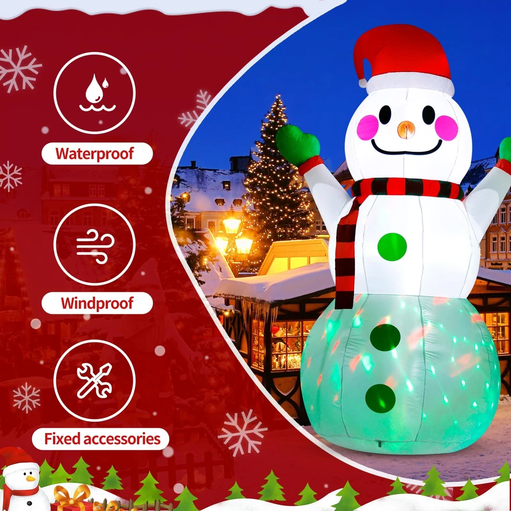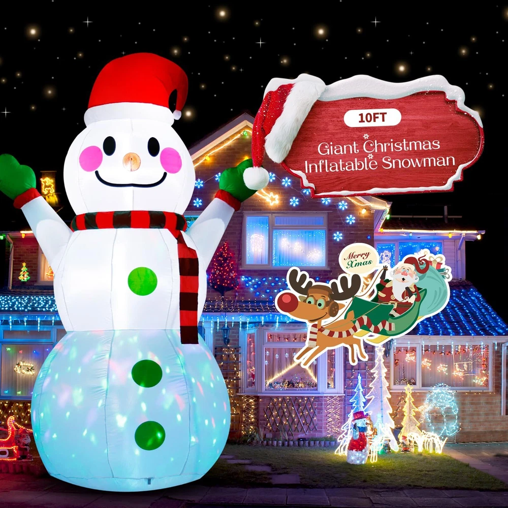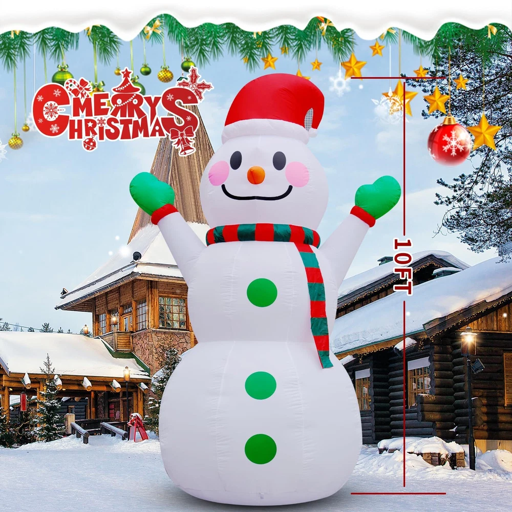 【10FT Giant Christmas Inflatable Snowman】A cute giant snowman with a smile on his face, a Santa hat on his head, and his hands in a hugging gesture. The snowman wants to celebrate Christmas with you! The rotating LED lights at the bottom make him look more beautiful at night! Whether it is indoors or outdoors, day or night, it can always give you a beautiful and unforgettable Christmas holiday! 【A Colorful And Eye-catching Decoration】 The Colorful LED lights inside will make it glow brightly at night and create a festive atmosphere.This Giant inflatable Snowman is 10FT Tall, making it an impressive backdrop for your photos with your family and friends. You can capture the memorable moments of Christmas with this inflatable. 【High-Quality and Durable Material】This inflatable is made of thick and waterproof Material that can resist rips and tears. The stitching is excellent and the blower is powerful, ensuring that the inflatable stays inflated and stable. You can use it many times without worrying about fading or damage. 【Easy to Set Up and Store】 You can inflate this inflatable in minutes with the built-in water bags, stakes, and ropes that secure it to the ground. The extended cord allows you to plug it into any standard outlet and power it on. When not in use, you can deflate it easily and fold it into a small size for convenient storage. 【Contact us Anytime】 We Offer You Best Customer Service. If You Have Any Questions, Please Feel Free to Message Us Through “Contact Sellers”. Our service team would provide premium service to help solve any of the problems."