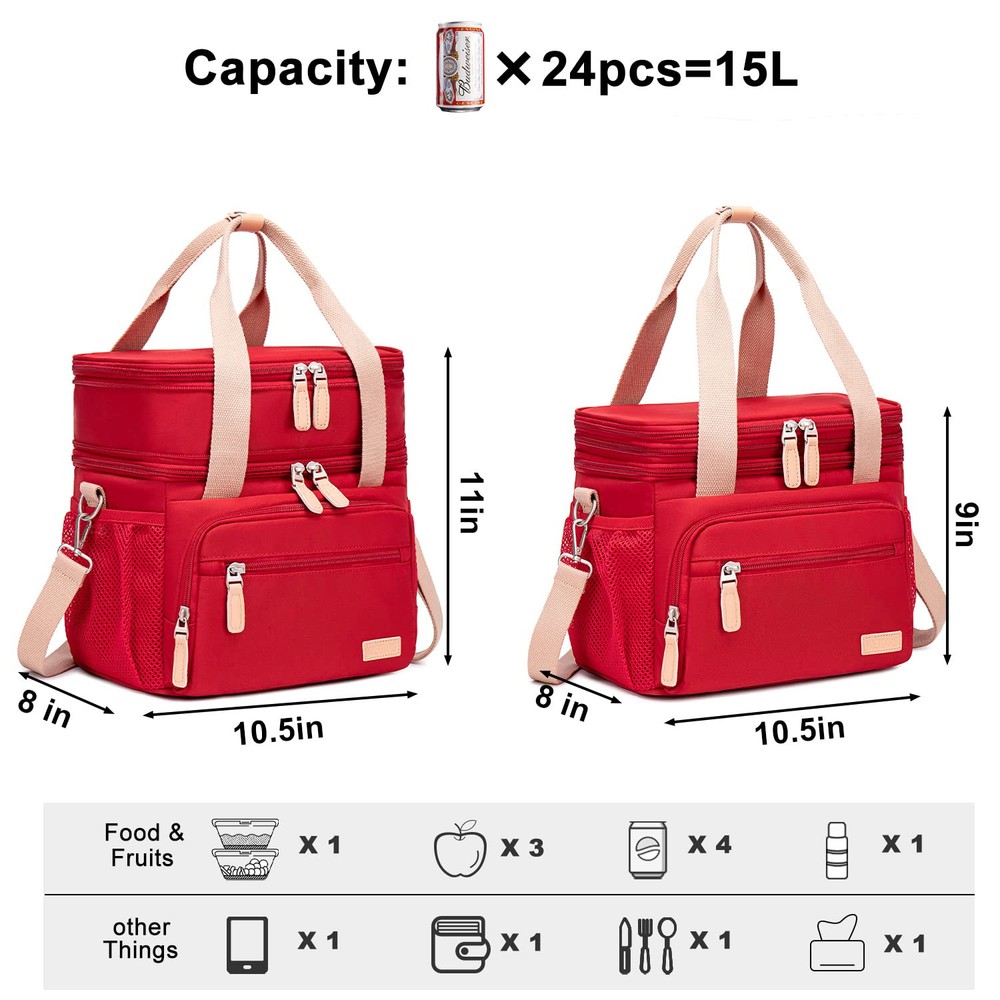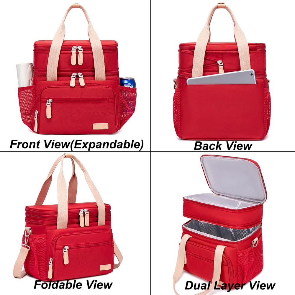 【Dual Compartment Lunch Bag】--The Large Women Lunch Bag/ Loncheras Para Mujer( SIZE: 11H''*10.5L''*8''W) Is Designed To Maximize Storage Efficiency, With Foldable Upper Insulated Compartment Bag And Waterproof Down Compartment, 2 Front Zipped Pockets,1 Back Pocket And 2 Side Mesh Pockets Very Spacious And Convenient For You To Keep Food Fresh And Storage Other Items 【Durable& Efficient Material Lunch Cooler】--Lunch Box For Women Made of Three Layer High Efficient Material,Lunchbox's Outer Part Is Made Of Oxford Cloth,Be Anti-Scratch And Durable/ The Middle Part Is 6 mm Thickness Insulated Foam Cotton, Keeping Food Warm And Cold/ Lined With Environmentally Friendly EVA Material Inside Of Lunchbag, To Keep It Waterproof And Easy To Clean It 【Mancraft Detail】--We Adopt The Waterproof Zipped Processing Technology, Which Is Easy And Smooth Without Jamming To Minimize The Possibility Of Zipper Breakage. PU Leather Down Part Material, Worn-Resistant And Waterproof. Foldable Upper Compartment, To Stretch Your Storage Room And Have Inner Mesh Pocket For Storaging. 【-Carry Options For Small Cooler Bag】--The Lunch Cooler Bag Has A Reinforced Handle On The Top, You Can Use It As Hand Lunch Tote Or Use It Over Your Shoulder With Adjustable Shoulder Strap 【Multiple Occasion To Use】--The Women Lunchbox Can Help You Enjoy Keeping Food Fresh Anywhere-- Situations Such As Lunchbag for Work ,Picnic Bag, At The Gym, Go To The Beach And Daytrip 【Support & Service】--Brand Offer 1 Years Product Service For All Of Lunch Products And 24 Hours Online E-Service. Us And We Will Help You Solve Your Problem Right Away