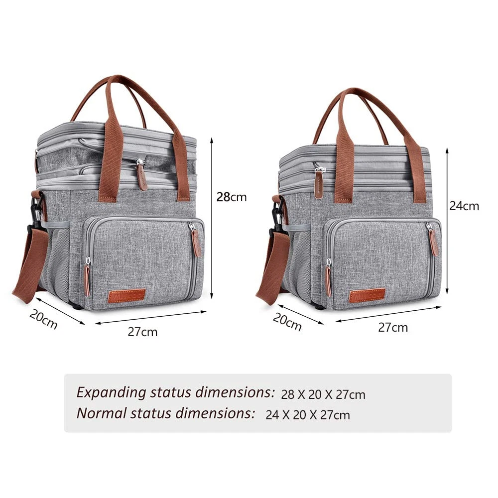 Large-Capacity Double-Layer Lunch Bag: It measures 10.1" x 7.7" x 9.1". Expanded size: 10.1" x 7.7" x 10.3". Different foods can be placed on the upper and lower layers to prevent food from being piled up and squeezed. The large-capacity lunch bag can easily hold all your beer, snacks, drinks, sandwiches, fruits, lunch boxes Multi-Functional: You can take it to picnics on weekends, take lunch and snacks to the office, take cold beer to the beaches,and it can also be used as a casual tote bag. Suitable for both men, women Leak-Proof & Insulation: Thickened PEVA liner without splicing to prevent leakage. The inner liner is made of thermal insulation material, which can keep the food warm or cold, and can also place ice cubes Easy Clean: PEVA liner is smooth and easy to wipe clean. You can put the used tableware in without worrying about cleaning Long-Term Storage: Ice cubes can be placed in the bag to maintain the temperature and freshness of food and beverages for at least 7 hours