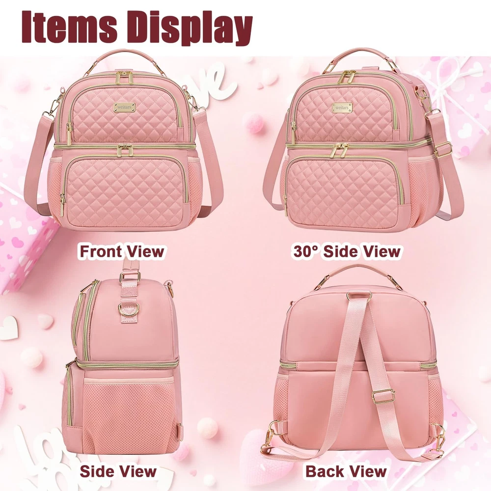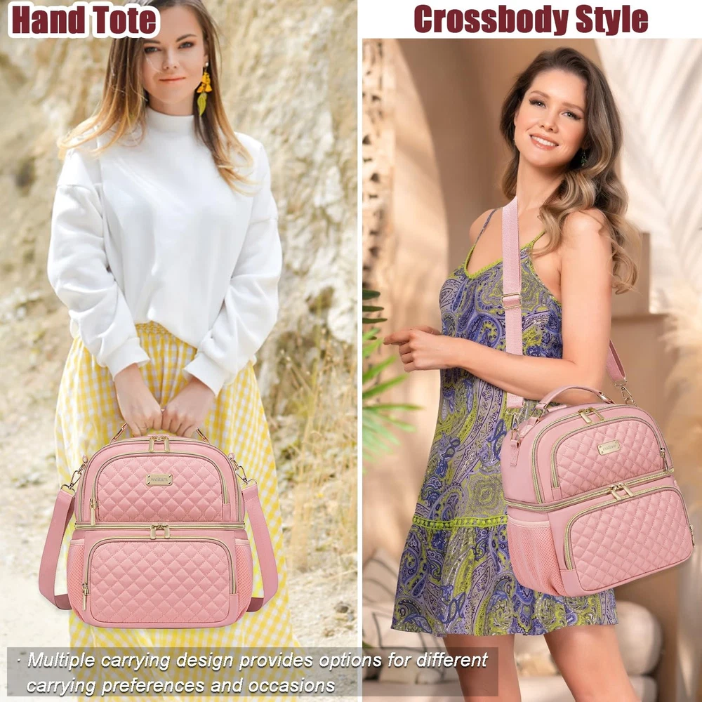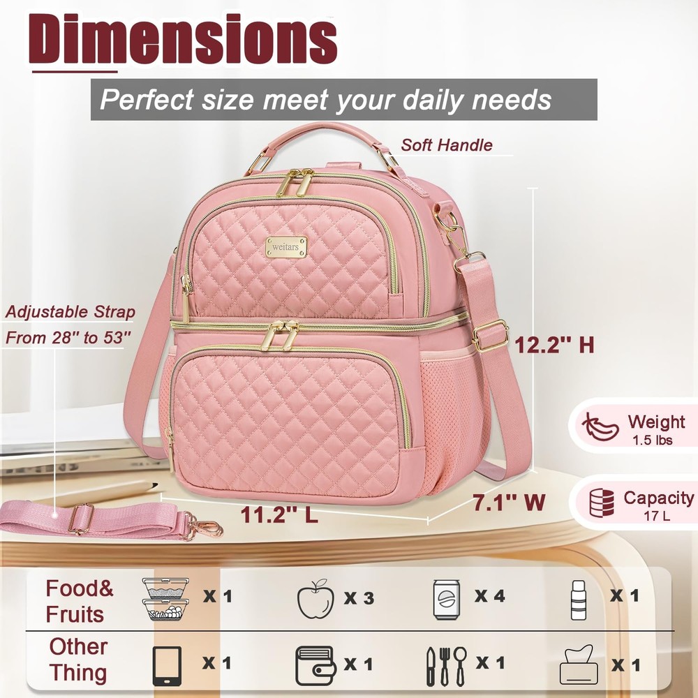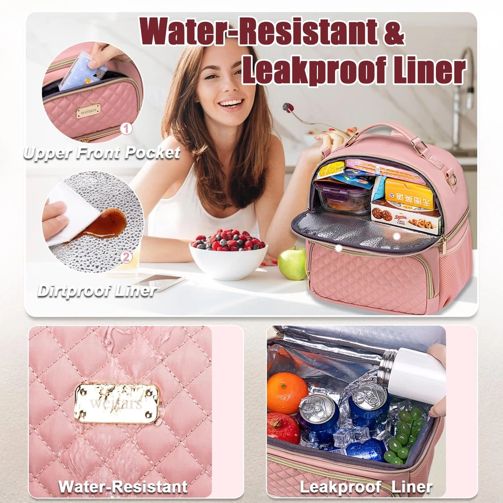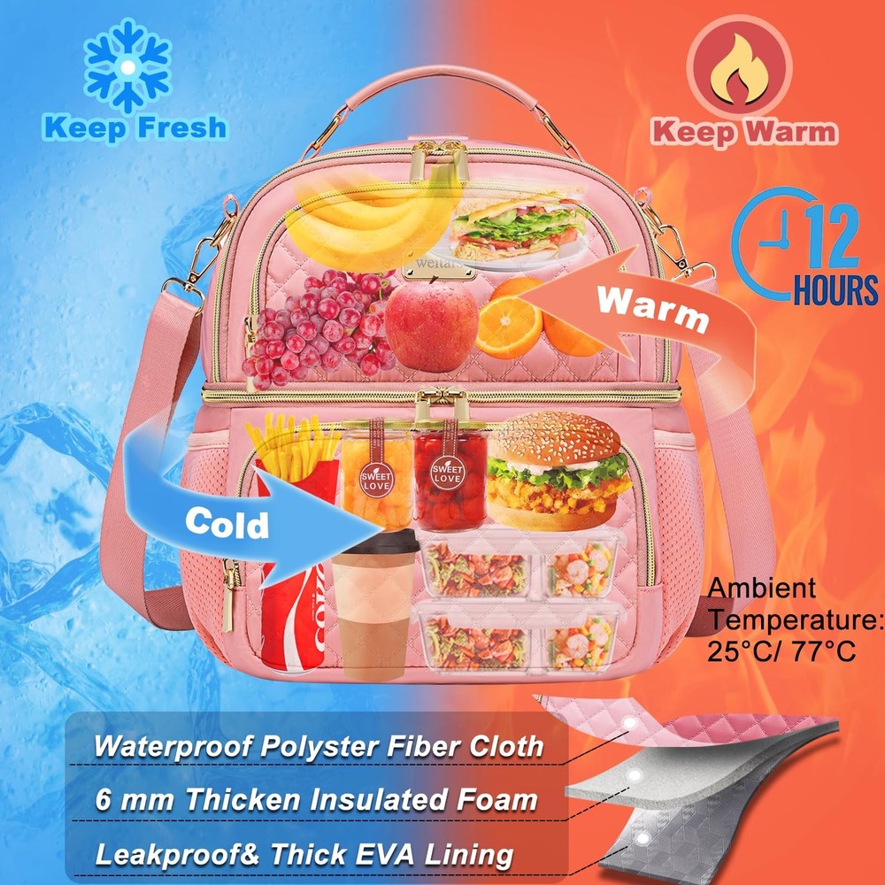lunch bag for women lunch box lunch tote bag lunch coolers 【Dual Compartment Lunch Bag】Lunch bag women loncheras para mujer offers 2 ways to pack your food. You can place different foods in the upper and lower layers to prevent them from getting piled up or squeezed. The top section, with a U-shaped opening and dual zipper pulls, is perfect for non-liquid items like fruits, snacks, or cookies.The leakproof foil-lined bottom section,sealed with a double-zipper wrap-around closure,is ideal for drinks, lunch bento, and more. 【Well-Crafted Insulated Lunch Box】Lunch box for women is made with four layers of high-quality materials. It features a water-resistant coating, a composite layer, an EPE insulating layer, and a leak-proof PEVA layer. The 6mm thick thermal insulation foam and food-grade aluminum foil liner work together to keep your contents cold, warm, or fresh for hours. The Large lunch bag /loncheras is also dirt-proof and leakproof, making it easy to clean and durable for everyday use. 【Spacious Lunch Bag With Pockets】The top section of backpack lunch box measures 11.2”L x 7.1”W x 4.2”H, while the bottom section measures 11.2”L x 7.1”W x 8.0”H, Lunch bags for work providing ample space to store your lunch or snacks,fruits ETC. It also features 2 front zipper pockets for utensils and napkins, as well as 2 side mesh pockets for bottles and soda cans. With double-deck lunch box design, lunchbox for woman gives you easy access to everything you need for a perfect meal. 【2 Comfortable Carrying Options】 Lunch bag for women features dual metal zipper that is easy to open and close. It comes with a detachable and adjustable shoulder strap for easy carrying. The adjustable strap length (MIN: 27 inches, MAX: 52 inches) fits most people comfortably, allowing for hands-free carrying. Additionally, has a handle that provides a comfortable grip. Whether you're going to work, a picnic, shopping, or the gym, lunchbag adult is a practical choice. 【Multi-Purpose Lunch Bag】Women's lunch bag for work is not only a reliable cooler for your meals but also a versatile accessory. With its adjustable strap, it can be used as an alternative to a women's lunch box, lunch cooler bag, lunch backpack,thermal lunch purse, and more. It is perfect for various occasions such as work, picnics, camping, the beach, sports, hiking, and road trips. Suitable for both women and men, it also makes a thoughtful gift for families and friends.