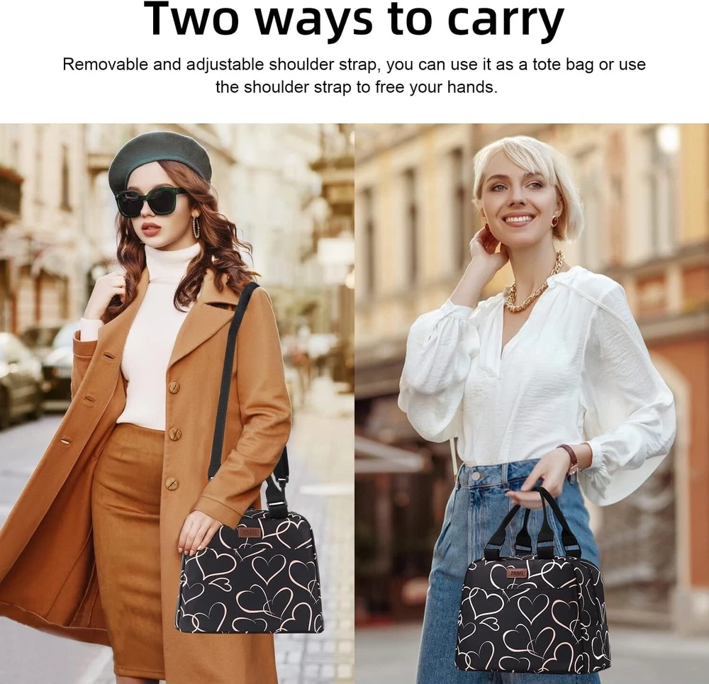 Lunch Bag for Women,Reusable Lunch Tote with Adjustable Shoulder Belt,Cute Love Heart Portable Lunch Box Cooler Bag,Perfect for Adult Girls Travel Picnic,Office,Working -Rose Gold About this item Large Capacity:11" x 7" x 8.7",L x W x H,Wide opening design makes it convenient to fill and take food. Roomy space can storage all your need for the entire day. Front and back pockets perfect to store your napkin,phone,key, bus card,tissue,ect. Safe and Durable Materials: insulated lunch bag is made FREE from PVC, BPA, phthalate, and lead materials. Premium reinforced metal SBS zippers, Lining with insulation material,secure zipper closure ensure smooth open, rip-resistant and maximum durability. Reusable Lunch Bag: Extra thick soft EVA liner and the heat-welded seams to easy to clean and reusable. If sauce spills inside, just wipe it off with wet cloth or napkins. Premium composite fabric is resistant to dirty and abrasion, protecting your lunch and items inside from occasional splatters or light rain. Friendly Design: Each portable,compact, lightweight lunch bag can hold a good-sized container with plenty of room for snacks, utensils and juice boxes.Perfect for work meal, picnic meal, outdoor BBQ, diet management,travel or shopping. More Features: Lunch box bag for women,fashionable,light weight,padded handle with adjustable shoulder belt,upgraded duarable smooth zipper,easy to clean,Insulated ,cooler,convenient. unmatched quality and a reliable replacement for service you can trust. Manufacturer recommended age grade: 3+ years Product Description Previous page Next page Large Lunch Bag Insulated Lunch Bag Wide-Open Lunch Box More Features Metal Zipper Premium reinforced metal SBS dual zippers, secure zipper closure and metal buckle ensure smooth open,not easy for the slide rail to break. Strong Stitching The handle is reinforced along the lunch bag by double threads and dense stitches,can bear as much weight and long-term usability as possible. Shoulder Strap The lunch bag features one comfort grip handle and removable adjustable shoulder strap,the adjustable length fits most people around the shoulder. Two Pockets Front and back pockets design organize your personal stuff,such as napkin,soup spoon,fork,phone,bus card,ect...but also keeps your stuff safety.