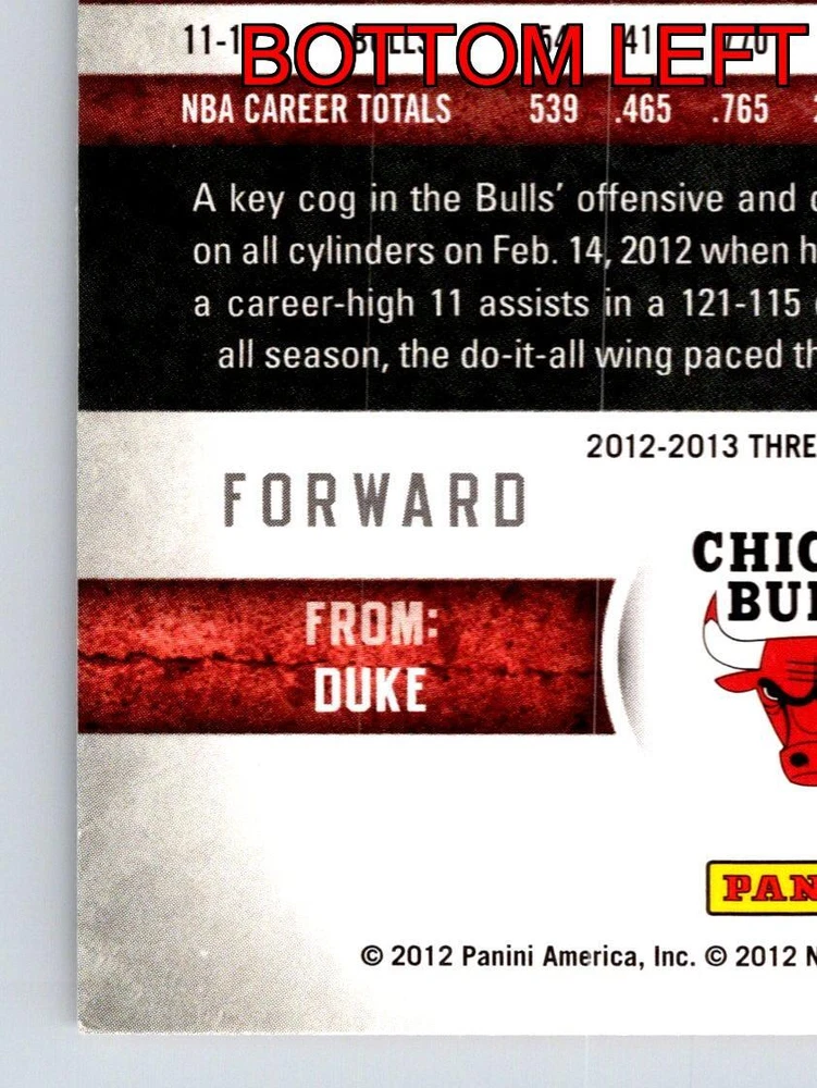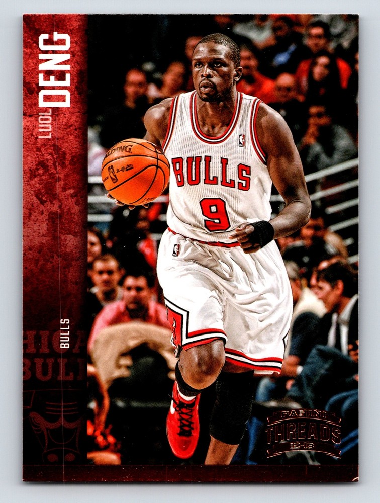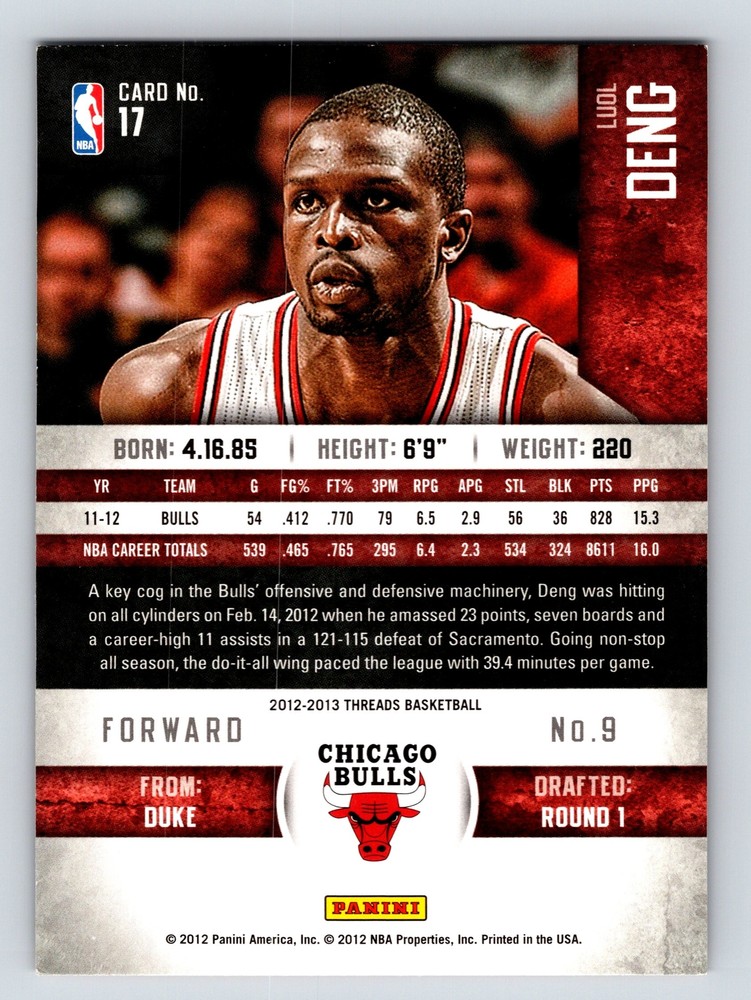 Item Description Title: Luol Deng Chicago Bulls Panini Threads 20122013 Card 17 Basketball Description: This sports trading card features Luol Deng, a prominent forward for the Chicago Bulls during the 2012-2013 NBA season. Deng is depicted in his Bulls uniform driving down the court with intensity and focus. Known for his defensive prowess and versatility, Deng was an integral part of the Bulls' strategy. The card highlights his impressive stats, including career averages of 16.0 points per game, obtained over his NBA career with the Bulls. Born on April 16, 1985, Luol Deng was drafted from Duke and has been celebrated for his skill, stamina, and leadership. The Panini Threads series, renowned for their quality and detail, captures the essence of the game and its players, making this card a must-have for collectors and fans of basketball memorabilia. MRSP: $5.99 Sport: Basketball Player/Athlete: Luol Deng Season: 2012-2013 Manufacturer: Panini Parallel/Variety: Unknown Set: Panini Threads 2012-2013 Team: Chicago Bulls League: National Basketball Association (NBA) Card Number: 17 Counter: 417 Folder: BASKETBALL1224002