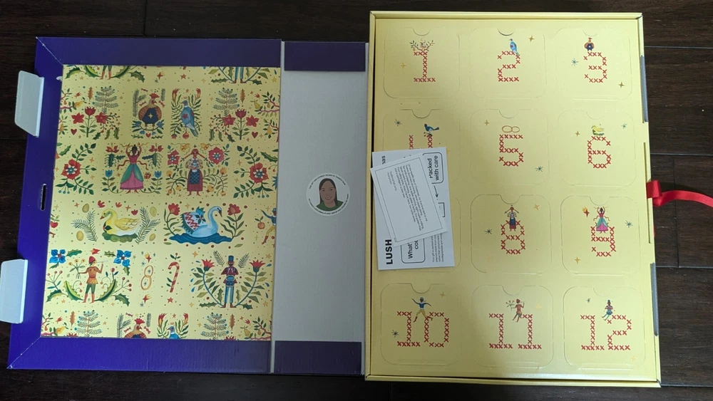 Lush Cosmetics Advent Calendar 12 Days of Christmas w/ 12 Bath Products SOLD OUT. New in package. Lush Cosmetics 12 Days of Christmas Advent Calendar. Sold out, limited edition item. Calendar is filled with 12 festive Lush products, including bath bombs, bubble bars and lotion. See last photo for details on what's included in the calendar. SKU: myclstSP1724L