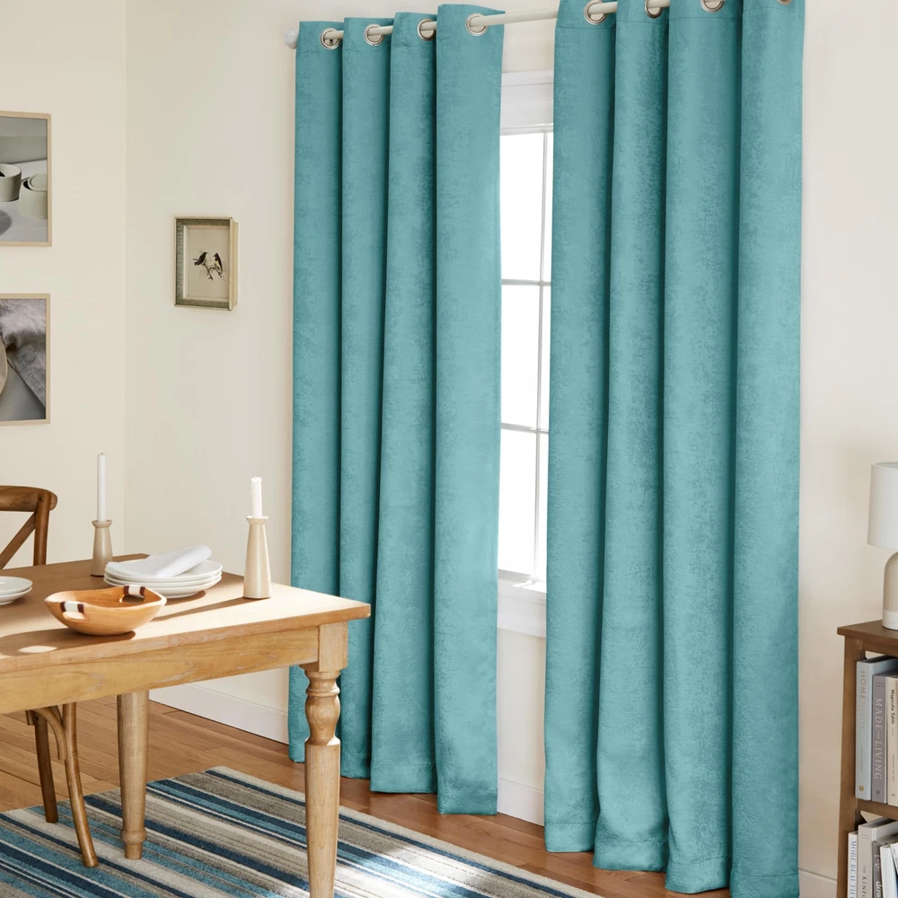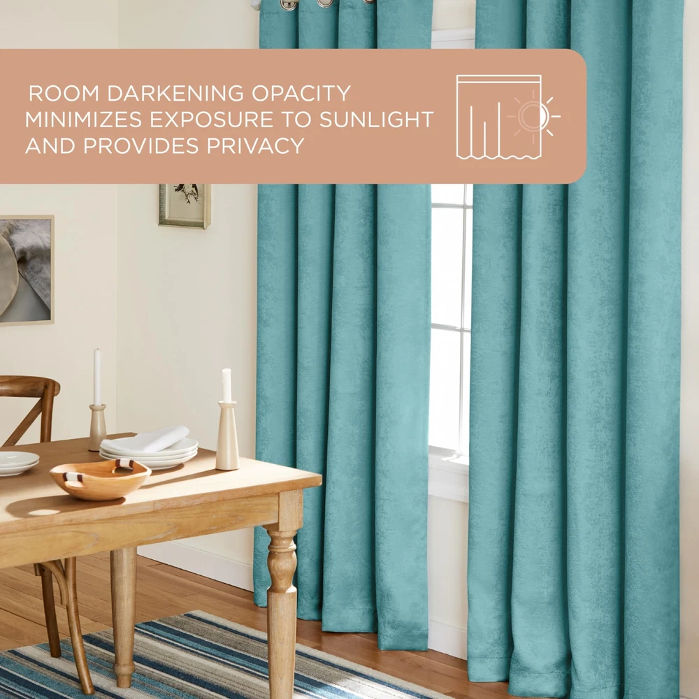 Product Description The Lustre Solid Heavyweight Textured Sateen Room Darkening Grommet Top Curtains are the perfect addition to any room. Woven with thermal insulation, these indoor curtains are energy efficient, block natural light, and provide privacy in your home. This light blocking curtain panel set has a beautiful lustrous sheen and includes eight (8) brushed nickel grommets, making them an ideal window treatment for your living room or bedroom. These timeless curtains fit any curtain rod up to 1.25” in diameter. For proper look and fullness, the curtain panels should measure 2-3 times the width of your window/opening. Hand wash only. From the Manufacturer Amalgamated Textiles USA, Inc, is North America’s leading supplier of home textiles and ready-made drapery by delivering high fashion designs, patterns, varying textures, and colors in an “affordable luxury” quality that today’s consumers expect. From classic solids to today’s top fashion trends, you are sure to find window panels to fit any look, mood, or style to complete your home décor project. We offer an array of fabric constructions as well, including jacquards, linens, burlap, sheers, thermal/blackout, silk and faux silks, polyester and poly blends, and cotton and cotton blends. These constructions are offered in varying designs and colors including solids, prints, textures, thickness, lengths, widths, and burnouts. Like millions of customers already have, let our window coverings be the anchor of each room in your home! Heavyweight, Room Darkening Indoor Curtain Panel Set Includes (2) curtain panels, each measuring 52"W x 96"L. Room Darkening Opacity is designed for light control and privacy 100% Polyester, with textured, sateen look Grommet top treatment with eight (8) brushed nickel grommets Woven with thermal insulation and light blocking fibers Hand wash cold with like colors. Only non-chlorine bleach, as needed. Line dry. Cool iron.