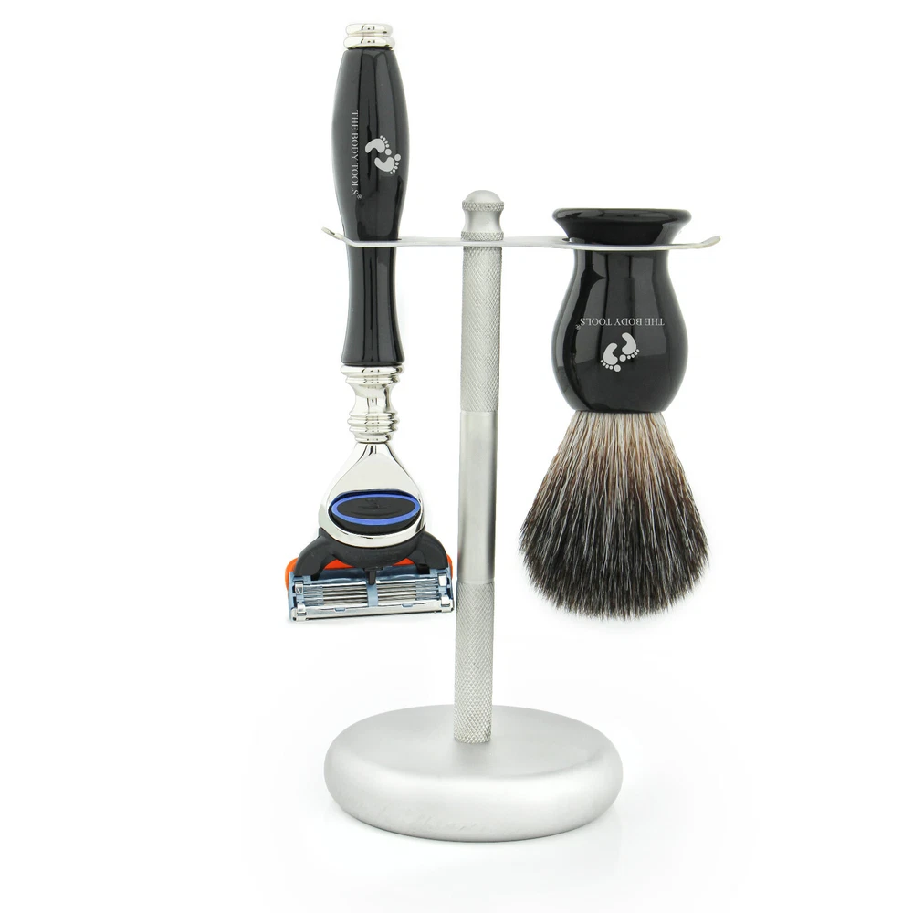 Luxurious 3 Piece Men's Grooming Shaving Set Black Synthetic Brush 5 Edge Razors This product data sheet is originally written in English. MALE GROOMING 3 PIECE Gift Set SYNTHETIC HAIR BRUSH FOR MEN Get a shaving brush with this man-made material for softness, quick drying, and longevity. No animal skin material used in their production. Perfect Ideal for sensitive skin. Super soft tips with a sturdy Ivory color of handle. These synthetically produced bristles are processed by hand and carefully selected to provide only the highest quality brushes. More durable and resilient than their natural inspiration the silvertip badger hair these offer the same quality and softness you grew accustomed to. Being less sensitive and drying quicker, these brushes require less maintenance than the natural options, offering you an easy to take care of brush that will easily last you longer. Brush Height: 3.7" Bristles: 1.8" Brush Handle: 1.9" Brush Weight: 103G 5 EDGE SAFETY RAZORS MEN SHAVING TOOL If it's a close yet very comfortable shave you're looking for look no further. This razor uses readily available 5 blade that are tug free and smooth on the face providing you use a sharp blade. The razor is branded with the Haryali London logo, a guarantee of quality and finished in traditional BLACK COLOR. Presented in a box which will protect the razor when you're on your travels. This razor has been designed to provide optimal balance whilst sitting comfortably in your hand. Features: Length: 15 cm Weight: 75 g Handle Material: Aluminium Stand / Holder for Brush & Razors This Dual Stand for your Razor & Brush is the perfect accessory to complement your shaving shelf. Classy and simple, this holder not only gives you the perfect place to neatly keep your shaving tools when not in use but also provides you with the best solution for your brush maintenance. Keeping your brush in the stand after use will dry your bristles in the best position, expanding your brush life span and keeping it in the best condition. Being of standard size, this stand will fit most razors and brushes, including safety razors, straight razors,3 Edge , 5 edge not only by Body Tools but by any other brand. Height : 6" Entrance points : 1" & 0.5" Get a shaving brush with this man-made material for softness, quick drying, and longevity. No animal skin material used in their production. Perfect Ideal for sensitive skin. Super soft tips with a sturdy Ivory color of handle. These synthetically produced bristles are processed by hand and carefully selected to provide only the highest quality brushes. More durable and resilient than their natural inspiration the silvertip badger hair these offer the same quality and softness you grew accustomed to. Being less sensitive and drying quicker, these brushes require less maintenance than the natural options, offering you an easy to take care of brush that will easily last you longer. Our customer satisfaction is at the top of our priority. We aim to provide a pleasant shopping experience for Brush Size 10 cm Bowl Material Not Included Unit Type Unit MPN Does not apply Colour Black & Silver Set Includes Shaving Stand Set Includes Brush Set Includes Razor Bowl Diameter Not Included Country/Region of Manufacture United Kingdom Handle Material Steel, Brass, Aluminium Brand The Body Tools Model non Type Shaving Kit Brush Material Synthetic