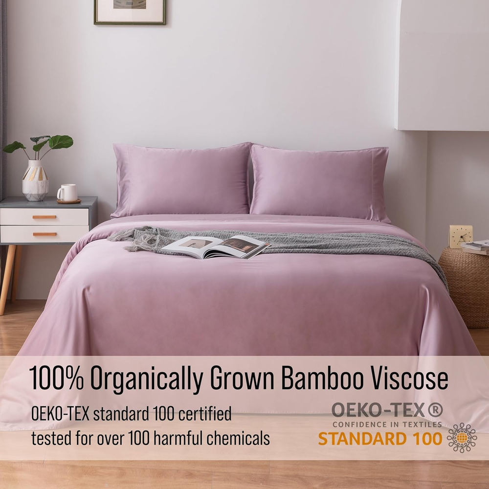 Store New Arrivals Add to Favorite View Feedback Contact Luxury Bamboo California King Size Sheet Set | 100% Organically Grown Bamboo Viscose | Ultra Soft | Cooling for Hot Sleepers | 18" Deep Pocket [Lilac] Description Style Luxury Bedding Weave Type Sateen Pattern Solid Country of Origin China Theme Winter Number of Pieces 4 Unit Count 1.0 Count Pillowcase Quantity 2 Material Organically Grown | Viscose Made From Bamboo Item Display Dimensions 108 x 112 inches Age Range (Description) Adult Seasons Winter, Summer, Fall, Spring Package Dimensions 13.78 x 11.06 x 4.13 inches Closure Type Envelope Item Weight 6.27 pounds Fitted Sheet Pocket Depth 18 Inches Special Feature Cooling, 18" Extra Deep Pocket, Hypoallergenic, Sateen Weave, Moisture Wicking Color Lilac Thread Count 400 Included Components 2 Pillowcases, Fitted Sheet, Flat Sheet Product Care Instructions Machine Wash, Tumble Dry Size California King RECHARGE YOUR SOUL- Embrace yourself in the luxury of 100% viscose made from bamboo sheets and you will wake up feeling renewed and refreshed. Lightweight and silky, hypoallergenic and moisture-wicking, these sheets keep you cool in summer and warm in winter. REDEFINE YOUR LIFESTYLE- With a 400 thread count, the superior quality of these 100% viscose derived from bamboo sheets are a dream to sleep on, getting softer with every wash. The 18" extra deep pocket fitted sheet will fit even the most plush pillow top mattresses. RENEW YOUR SLEEP - You can rest well in luxury bedding knowing that your sheets have been tested and certified to be free of over 100 harmful chemicals with the OEKO-TEX 100 certification. REINVIGORATE YOUR RELATIONSHIP - Enhance every part of your relationship as you cozy up with your loved one and enjoy the silky, soft, woven bliss of 100% viscose made from bamboo. ADD TO CART WITH CONFIDENCE in our 100% Customer Satisfaction Guarantee! Product Description Slip Into Luxurious Comfort With 100% Bamboo Viscose Bedding The video showcases the product in use. The video guides you through product setup. The video compares multiple products. The video shows the product being unpacked. How should I care for my Bella Coterie sheets to maintain their quality and durability? Simply wash and dry. Bella Coterie bamboo sheets are designed with durability in mind to resist fading and pilling. Are Bella Coterie sheets designed for a secure fit? From deep pockets that ensure a perfect fit, to non-slip straps that keep everything in place - Bella Coterie sheets are thoughtfully crafted for comfort and function. Are these sheets made from sustainable materials? Our 100% organically grown bamboo viscose sheets are OEKO-TEX Standard 100 certified, meaning every component has been tested for over 100 harmful chemicals. Rest easy knowing you're wrapped in sheets that are free from toxins and pesticides. Why choose Bella Coterie bamboo viscose sheets over cotton or synthetic? Bamboo is naturally cooling to reduce night sweats, hypoallergenic for sensitive skin, and is moisture wicking to keep your sheets dry and free of allergens.. Are Bella Coterie Sheets soft to the touch and breathable? Say goodbye to rough and scratchy sheets! Organically grown bamboo viscose offers unparalleled silky softness without synthetic fibers that can irritate skin. Experience cooling comfort - naturally breathable for temperature control. Bella Coterie Luxury Bedding Add to Cart Add to Cart Add to Cart Customer Reviews 4.4 out of 5 stars 3,685 4.3 out of 5 stars 97 4.5 out of 5 stars 422 4.5 out of 5 stars 287 Price $129.99 $ 129 . 99 $129.99 $ 129 . 99 $29.74 $ 29 . 74 — Material 100% Viscose from Bamboo 100% Viscose from Bamboo 100% Viscose from Bamboo 100% Pure 6A Mulberry Silk Secure Fit 18" Extra Deep Pockets 8 Corner Ties & Button Closure Envelope Sham Zipper Closure Fabric Feel Silky Smooth & Cool to Touch Silky Smooth & Cool to Touch Silky Smooth & Cool to Touch Ultra Soft & Breathable Temperature Regulating Breathable & Cooling Breathable & Cooling Breathable & Cooling Cozy & Cool Designer Color Collection 16+ Colors Available 14+ Colors Available 16+ Colors Available 10+ Colors Available Machine Washable ✔ ✔ ✔ ✔ Anti-Pilling / Anti-Fading ✔ ✔ ✔ ✔ OEKO TEX Certified ✔ ✔ ✔ ✘ ABOUT US We offer the best prices around on high quality products. Our E-store includes media such as books, movies, music and games while offering electronics, toys, sporting apparel, clothing, tools, general home, garden items and more. SHIPPING We are always working hard to ensure your package arrives as soon as possible. Please understand that some factors like weather, high postal traffic, and the performance of shipping companies are outside of our control. We offer free shipping to the lower 48 states and ship within 2 business days of payment, usually sooner. We do not accept P.O. Boxes. Please provide a physical address. For shipping outside of the continental USA, we only use eBay's Global Shipping Program.The item is shipped to KY and then sent to the rest of the world. International customers are responsible for all duties and taxes. Continue to check out in order to calculate costs for shipping the item to your country. Messages regarding eBay's Global Shipping Program MUST be directed at eBay EXCLUSIVELY. RETURNS We offer a 30-Day Return Policy on items which you are not completely satisfied with. You have the option for a full-refund or an exchange of the item. No returns are available on items shipped outside of the USA. PAYMENT We accept PayPal. CONTACT US This page content is yet to come Please ad us to your favorite seller and visit again later Thank You CUSTOMER SATISFACTION We try our very best to make sure every customer is completely satisfied. If there's a problem, message us! We're happy to help.