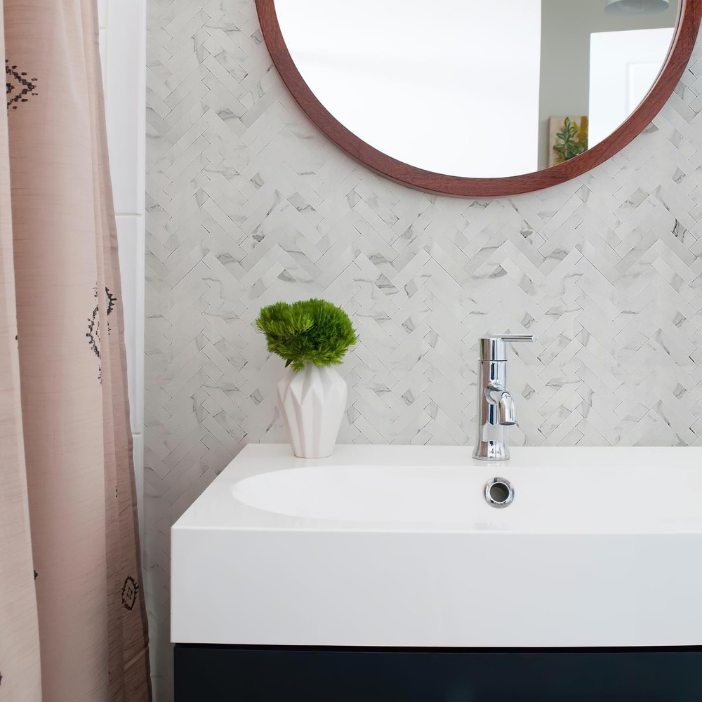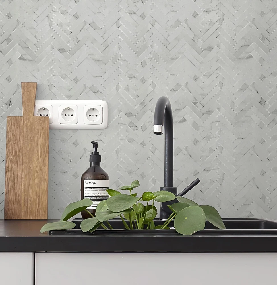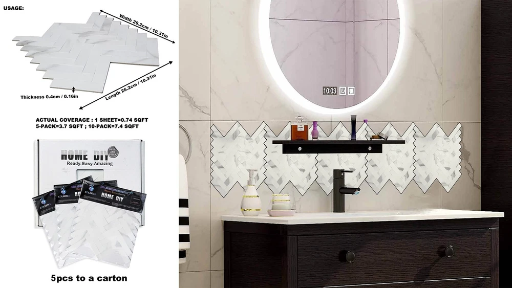 is a DIY home decor brand founded in 2020, California. Too expensive, too many skills and efforts required, and too much time-consuming, we are fully aware that these are the issues for young people when it comes to home renovation. But a new look of the space, a refreshing of life and the desire of the trend, these are things that motivate us to decorate our home as well. Model Description: White Marble Statuario Pattern, luxury stone Chevron design with soft honed touch, milky white color with grey natural veins, refreshing your home with a simple but cozy wall. Dimensions & packing: Individual piece dimension L x W x H : 10.31” x10.31” x 0.16”, each box contains 10 sheets, which covers 7.39 square feet. Products are well packed with PE foam surrounded to protected damage during transportation. Leaflet contained for better guide of installation & maintenance. Material: Durable thicker environment-friendly stone composite material, made of a latest upgraded SPC vinyl tile base, nice imitation of ceramic tile but of much lighter weight for handling a DIY wall decoration. Premium Feature: Product is waterproof, oil-proof and heat resistant make it super fit for kitchen, bathroom, living room, door way and accent wall backsplashes. Easily wipe to remove stains, protect the walls from splashes and oil. Stronger upgraded backing glue make it better than ordinary wall stickers, removable with no residual. 【Excellent Material】The peel and stick tiles are made of stone composite material. Compared to other self-adhesive vinyl base tiles, wall stickers, and panels, tiles are much thicker and rigid, have better waterproof, heat-resistant, wear-resistant, 3X stronger back adhesive, and easy to clean, Perfect for busy households 【Widely Used in Home Decor】The peel and stick backsplash tills surface layer is designed with natural color tones and pattern changes, which can fill the decorative space with the layering and richness of natural stone. It can match various home decoration styles, is an ideal choice for kitchen wall splash proof panels, bedroom, laundry room, fireplace, and living room wall decorations,but only for interior decoration, and shower is not recommended 【DIY-Friendly & Simple Installation】 The backsplash for kitchen wall just Simply peel off the backing and adhere the tiles to any clean, dry surface. Easy to cut with tin snip, utility knives or hand saws, no grout and no mess, save your time and money on labor 【Size & Package】Each backsplash tile peel and stick is 10.31"x10.31" x 0.16”, and each package contains 10 pieces, with a total area of 7.4 square feet. We always recommend taking 5~10% more for installation losses concern 【Service Tenet】"Quality first, credibility first, service first" is our purpose to bring a good wall decoration users and satisfaction for clients is our desire. Email us for any questions or concerns