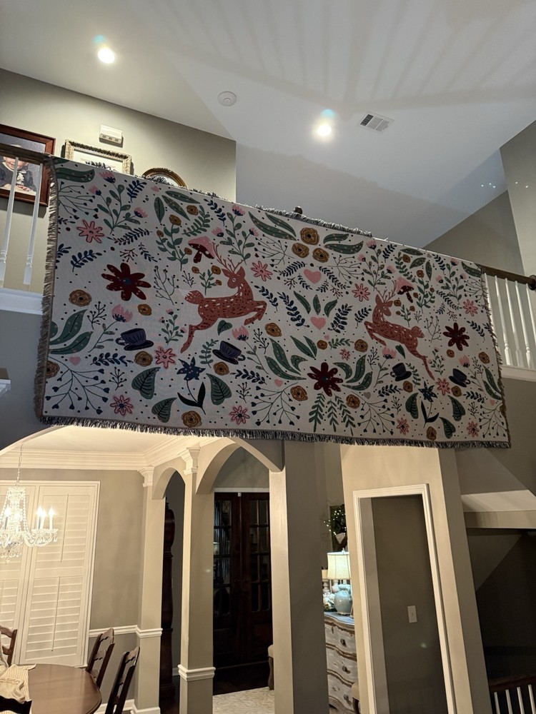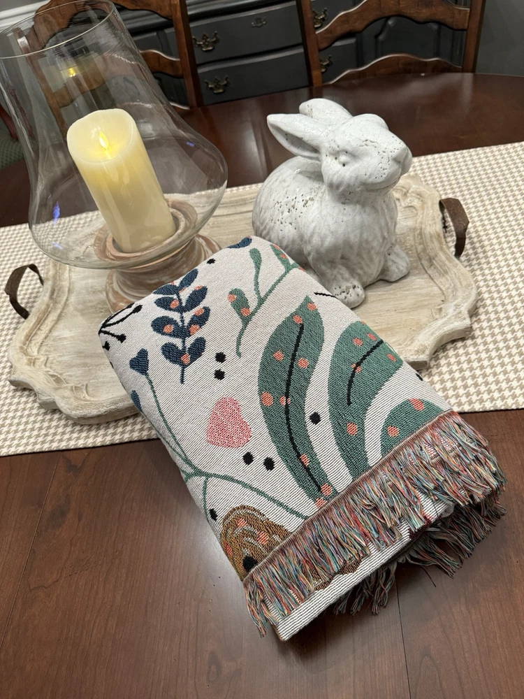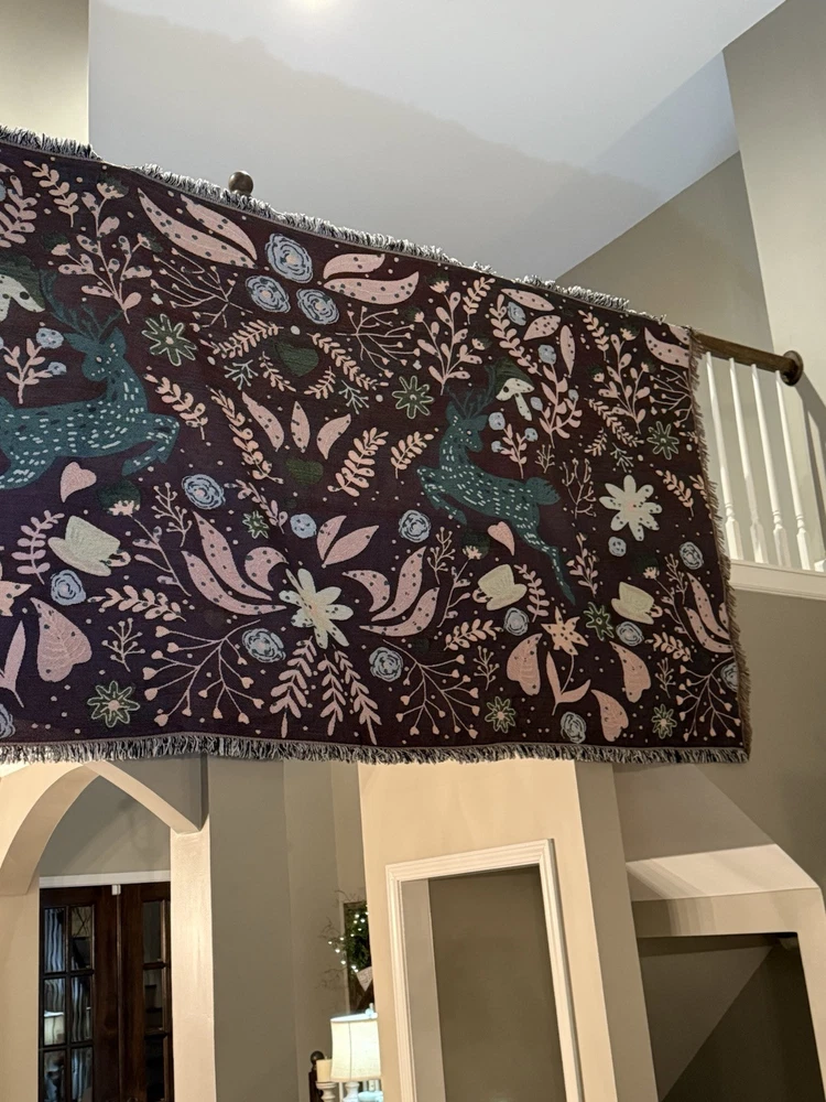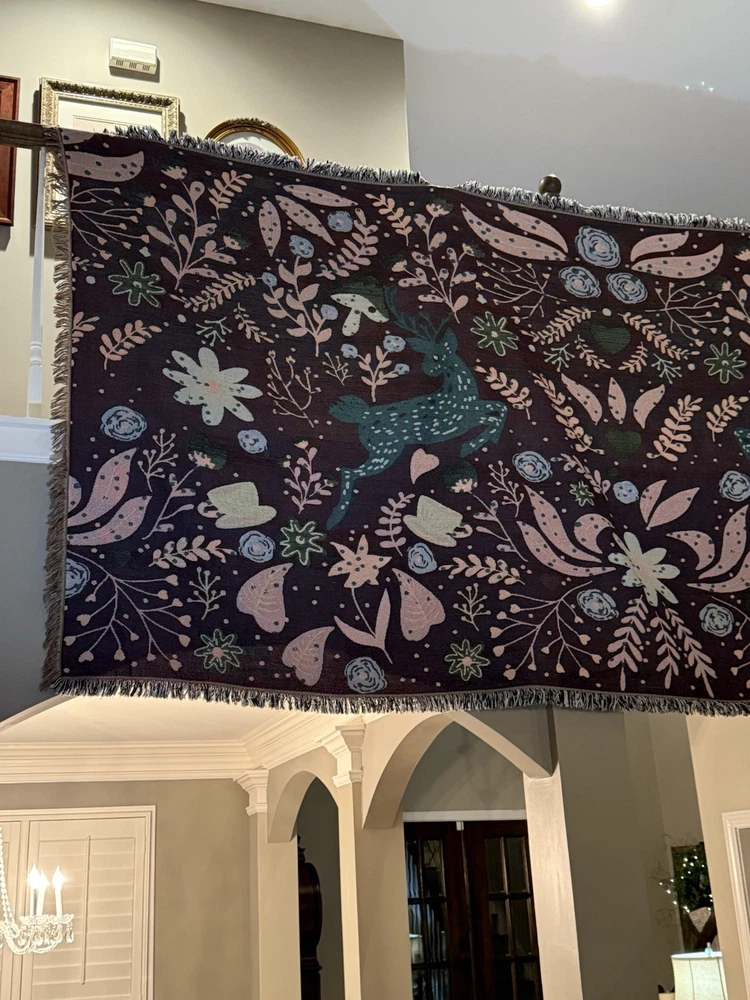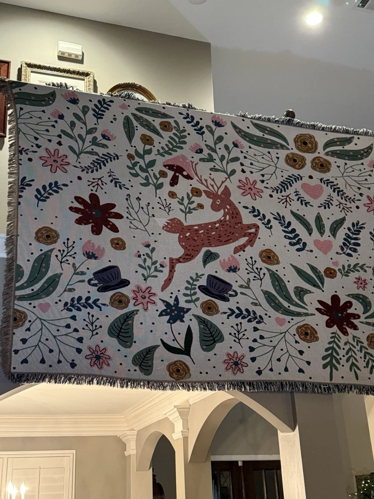 Woven Jacquard Throw Blanket (11 Ft x 5 Ft) Pre owned condition VERY large and VERY heavy • It features a pattern with deer, flowers, hearts, and teacups. • It's made of woven cotton with tasseled edges. • It can be used as a throw blanket, sofa cover, or décor. • It is suitable for all seasons. • It is machine washable.