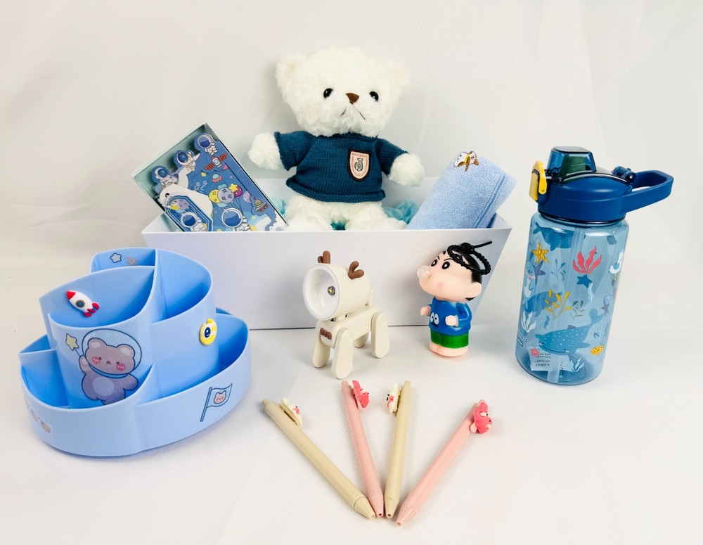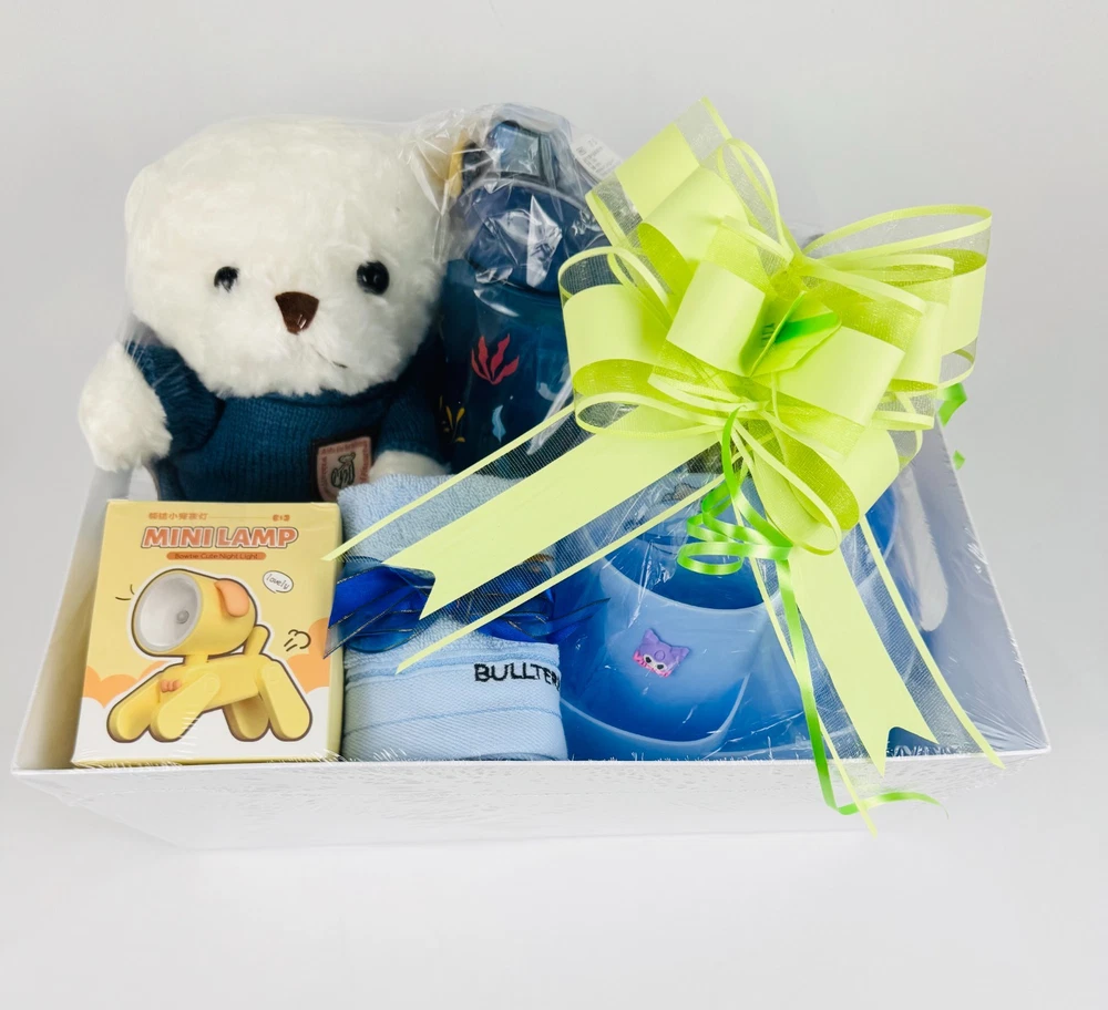 Elementary School Boys' Gift Box 13 Pieces - Luxury Surprise ________________________________________ * 1 x Teddy Bear * 1 x small hanging cartoon notebook * 1 x water bottle 600 ml * 1 x 360 Rotating Plastic Desk Pen Organizer with DIY stickers * 1 x Squeeze bubble hanging toy * 4 x pens * 1 x cotton wash cloth * 1 x animal chargeable reading or sleeping night light * 1 x gift container * 1 x greeting card Terms of Sale We ship around the world but the buyers needs to take into consideration for the fees associated with your country. We are not responsible for additional tax or other import charge from the receiving country. Please do not ask to change the declared value as the law forbids us to do so. In compliant with the state law. Shipping & Return Please send us a message when you have received your item and any problems, concerns or compliments you may have. If you are at all dissatisfied with any aspect of your purchase PLEASE contact us. We would love to have a chance to rectify any problems you may have had with your purchase. If you find the item isn't coherent with the description, we will refund you the full price, excluding shipping fees. Please inform us of the return within three business days after your receive the item. You must return the item in the same condition as it was packed. Buyers are responsible for the returning shipping cost and Ebay refund credit shortage. All returned items should be in original conditions. If you are satisfied with our items, please leave positive feedback or Star Rating for us! If there is any problems, concerns or dissatisfaction you have, please send us a message before leaving any Feedback or Star Rating. We will do our best to assist you.