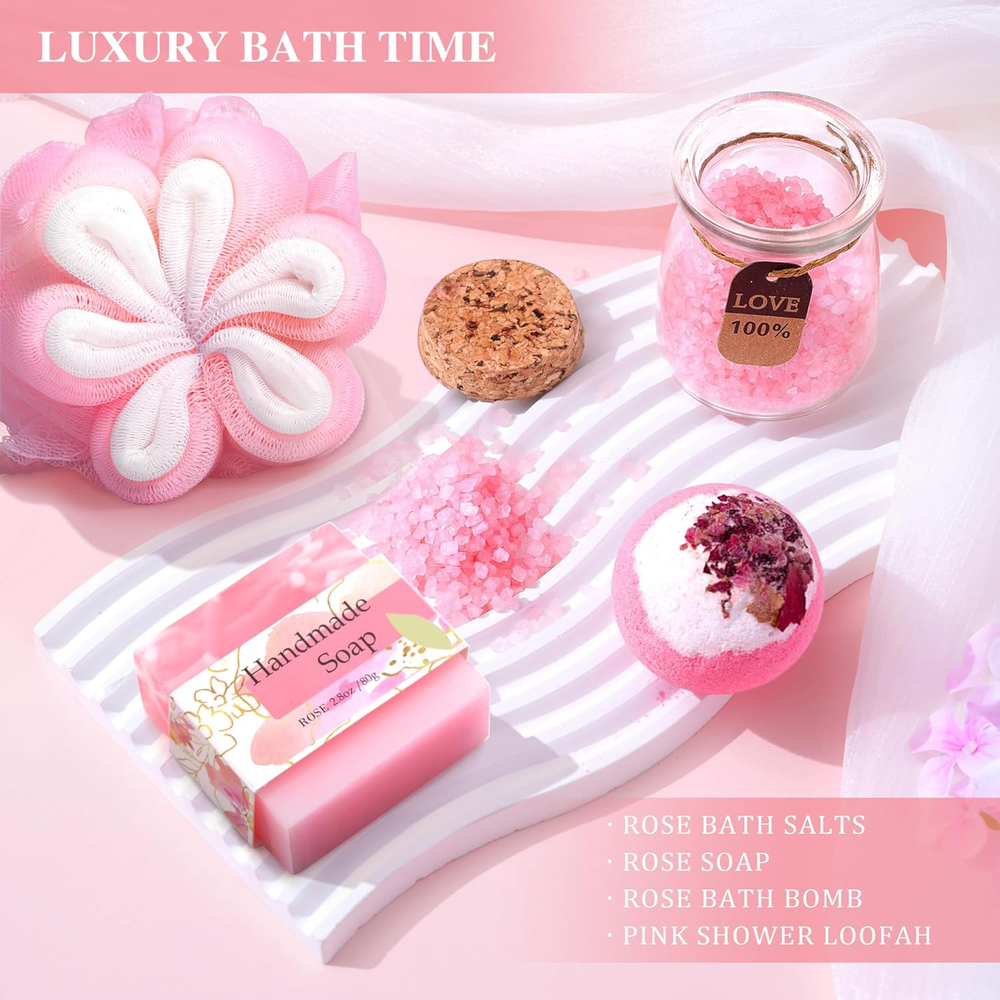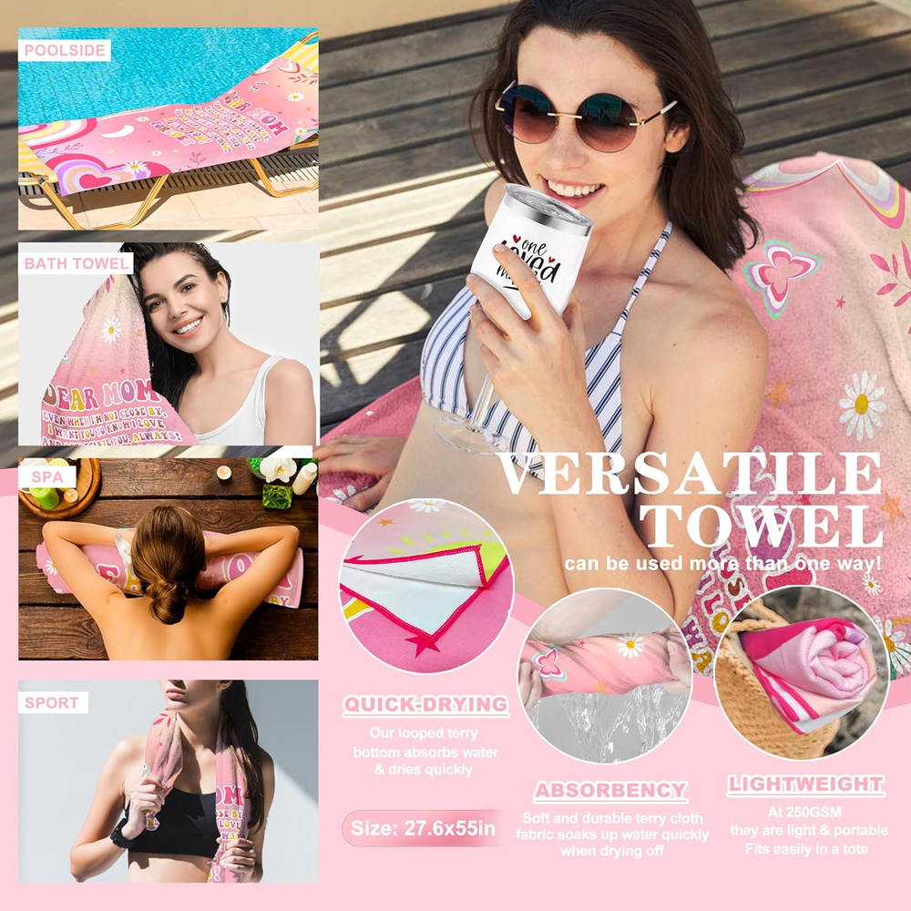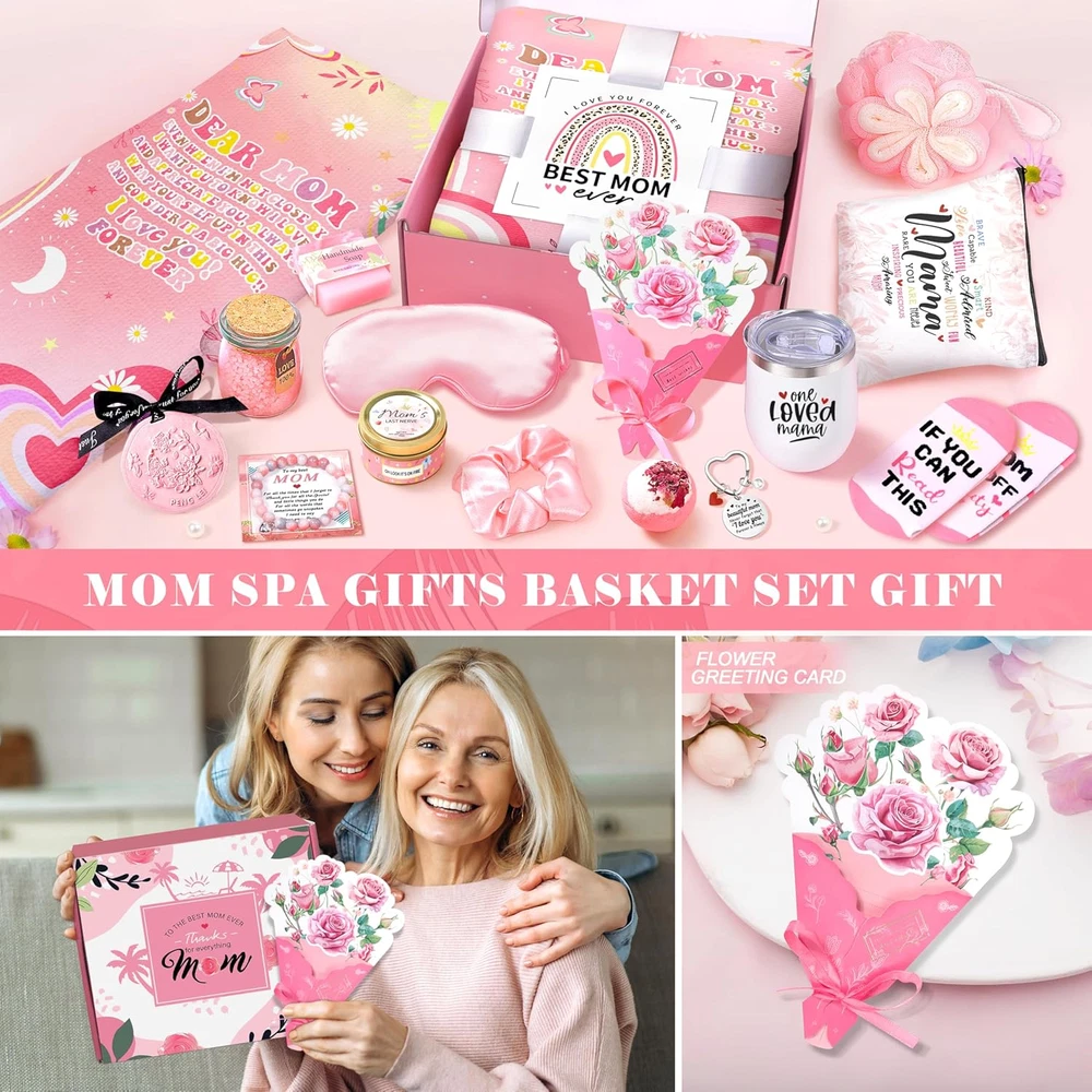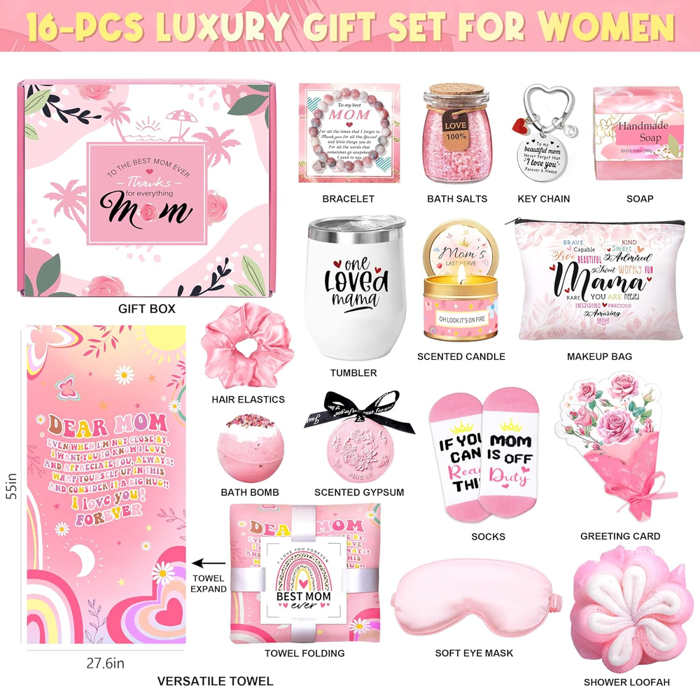 【Mother’s Day Gifts Basket】 This thoughtfully curated luxury gift set is the perfect way to show Mom she’s cherished! Ideal for Mother’s Day, birthdays, anniversaries, Valentine’s Day, Christmas, self-care surprises, or "just because"—all elegantly packaged in a reusable gift box. A touching surprise for moms of all ages, whether she’s a busy parent, a doting grandma, or a career-driven superhero! 【16-Piece Premium Mother’s Day Gift Set Includes】 1*Versatile Towel, 1*Stainless Steel Tumbler, 1*Scented Candle, 1*Hanging Scented Gypsum Decor, 1*Natural Stone Bracelet, 1*Luxury Bath Loofah, 1*Bath Salts, 1*Handmade Soap, 1*Relaxing Bath Bomb, 1*Funny Socks, 1*Inspirational Keychain, 1* Makeup Bag, 1*Silk Eye Mask, 1*Hair Scrunchie, 1*Pink Floral 3D Greeting Card, and 1*Sturdy Gift Box. 【Gifts for Mom】 Measuring 27.6"x55", this ultra-soft, quick-dry towel is perfect for mom’s relaxation moments! Lightweight and compact, it’s ideal for beach days, yoga sessions, spa nights, or picnics. Use it as a throw blanket, bath towel, or beach essential—versatile enough to match her active or laid-back lifestyle! 【Chic & Functional Mom Essentials】 The 12oz insulated tumbler keeps her coffee hot or iced tea cold for 6+ hours (18/8 stainless steel), engraved with “one Loved Mama’s Love Shapes Everything.” Pair it with the stylish makeup bag, inspirational keychain, and hair scrunchie—practical accessories she’ll use daily with pride! 【Self-Care Gifts for Mom】 Pamper Mom with spa-grade luxuries: bath bombs, soothing bath salts, moisturizing handmade soap, and a plush loofah. Add cozy socks, a silky eye mask, and a natural stone bracelet for ultimate comfort—because every mom deserves to unwind like royalty! Product Description