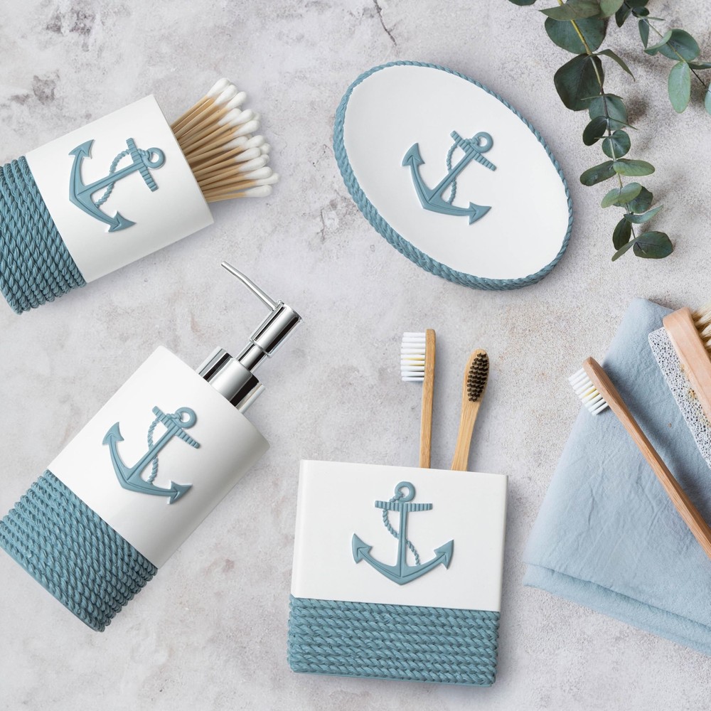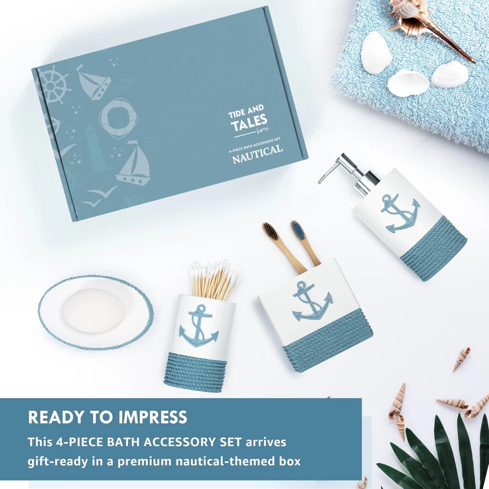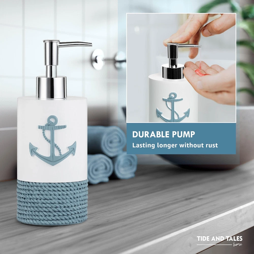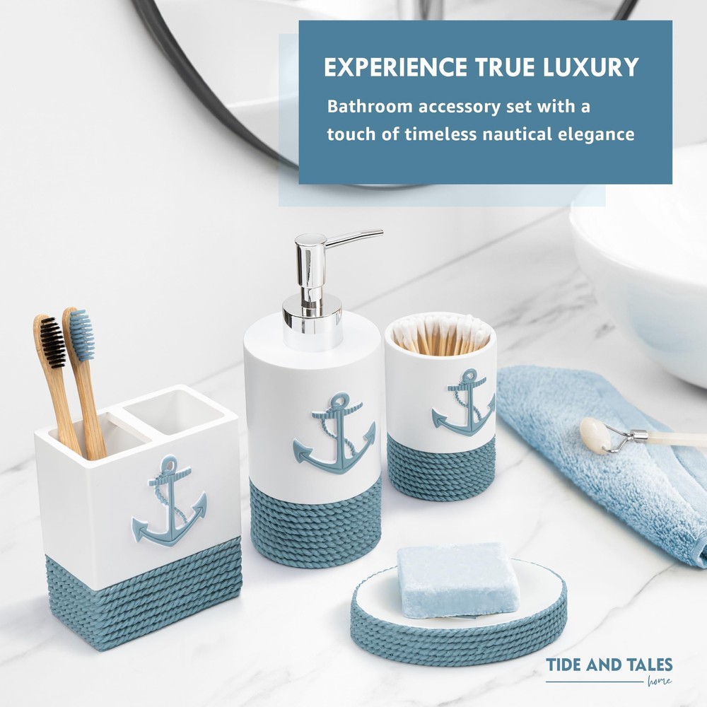 TideAndTales Luxury Nautical Bathroom Accessories Set (4 Piece) Rope and Anchor Beach Bathroom Decor with Ocean and Sea Theme Design, Countertop Coastal Soap Dispenser Set 4 Piece Bath Accessory Set with Nautical Theme: Smooth and heavy to touch, with textured rope design, including countertop essential items: a lotion dispenser/ soap pump, toothbrush holder, tumbler and a soap dish. Coastal Dreaming: Bring the spirit of the ocean home with this luxury set incorporating the anchor and rope nautical motifs. Carefully crafted with exquisite detail to enhance the serene relaxing feel of any bathroom. Modern Design And Quality: Soft Mediterranean tones and a smooth matte finish are ideal for coastal homes, lake houses, beach bathroom decor, and any nautical or marine theme interiors. Leak-proof Assured, Easy To Clean and Maintain: Each piece is crafted from durable materials for long lasting use and effortless care. Enhanced quality checks to prevent leaking. Gift Ready: This classy set of coastal bath accessories qrrives in a stylish box, ready to give to your seaside loving friends or family. SHIPPING Domestic Buyers - We have confidence in our products, but if you are not fully satisfied please contact us within 30 days of purchase and you will get full refund. - We ship within 3 business days of payment, usually sooner - We offer FREE shipping on all orders! - We only ship to the lower 48 states, no APO/FPO addresses or PO Boxes allowed International buyers – please note: Import duties, taxes, and charges aren't included in the item price or postage cost. These charges are the buyer's responsibility. - Please check with your country's customs office to determine what these additional costs will be prior to bidding or buying. * Order Cancellation Policy ** You can return a product for up to 30 days from the date you purchased it. 1. The seller reserves the right to cancel the special case only due to eBay cancellation fee. 2. The decision of seller is the final. 3. The seller will respond to the cancellation request within 2 business days. Please wait for the result of cancellation. 4. In case the cancellation is not completed by some reasons, the buyer can follow the options below to get the refund. 4.1 The buyer can reject the item when it arrives. 4.2 The buyer can send the item back to the seller within 30 days If the buyer receives item (USA Shipment ONLY). The seller will provide the FREE return label to the buyer when the buyer opens " Return Item" case on eBay by using the reason as "Change my mind" ONLY. 5. When buyer has placed the order. The order will be processed and completed by automatic warehouse system within 5 minutes. In case that buyer sends the cancellation request after 5 minutes of placing the order, the request will be rejected. **Sending direct message to cancel the order is not allowed for every case.* Return Policy For the return case - If buyer would like to return the items for refund or replacement, please CONTACT SELLER to receive the free return label from seller. The refund or replacement will be processed with the tracking number of return label which is provided by seller only. The other ways of return which are not approved by seller will not be processed for the refund or replacement.