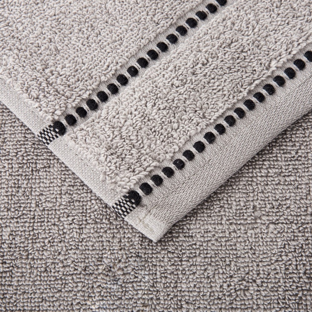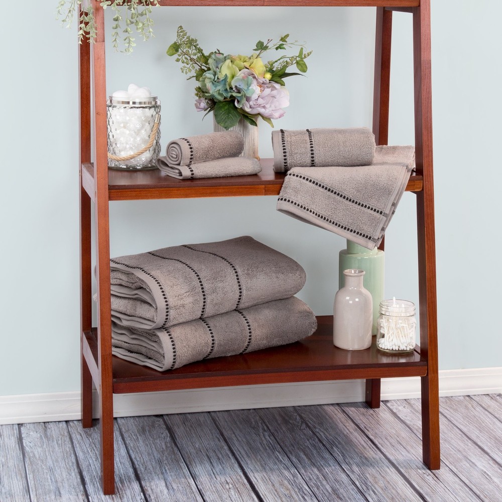 6-PIECE BATH TOWEL SET - This bathroom towel set comes with 2 towels, 2 bathroom hand towels, and 2 washcloths with an attractive pin stitch beaded border. Use the bathroom towels in your main, guest, en suite, or dorm bathroom. SOFT AND ABSORBENT - Each bath towel is made from 100% cotton, with a plush 525 GSM thickness that is soft to the touch and provides plenty of warmth, while the zero-twist ends allow for increased absorbency and enhanced durability for lasting use. QUICK DRYING - Count on the luxury bath towels for a lightweight design with quick-drying convenience that’ll look great in any bathroom. The cotton bath towels easily wick away moisture and are quick drying for use in your bathroom or washroom. MACHINE WASHABLE - Launder these shower towels at home for convenient cleaning, whether you use them at home, the gym, or the beach. Simply machine wash the towels set on warm with like colors, do not use bleach, then tumble dry on low for easy care. PRODUCT DETAILS - Materials: 525 GSM 100% Cotton. Dimensions: Bath Towel: (L) 54” x (W) 27”; Hand Towel: (L) 28” x (W) 16”; Washcloth: (L) 12” x (W) 12”. Includes 2 Bath Towels, 2 Hand Towels, and 2 Washcloths. Color: Silver Gray with Black Beading.