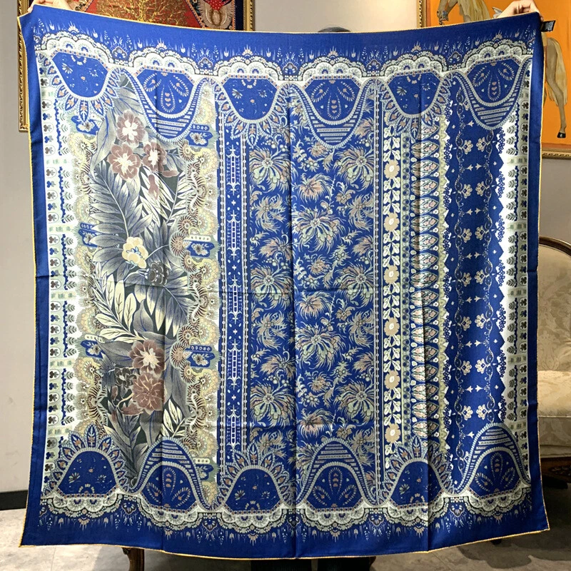 Luxury 70% Cashmere 30% Silk Double-Faced Square Shawl with Floral Print 53x53