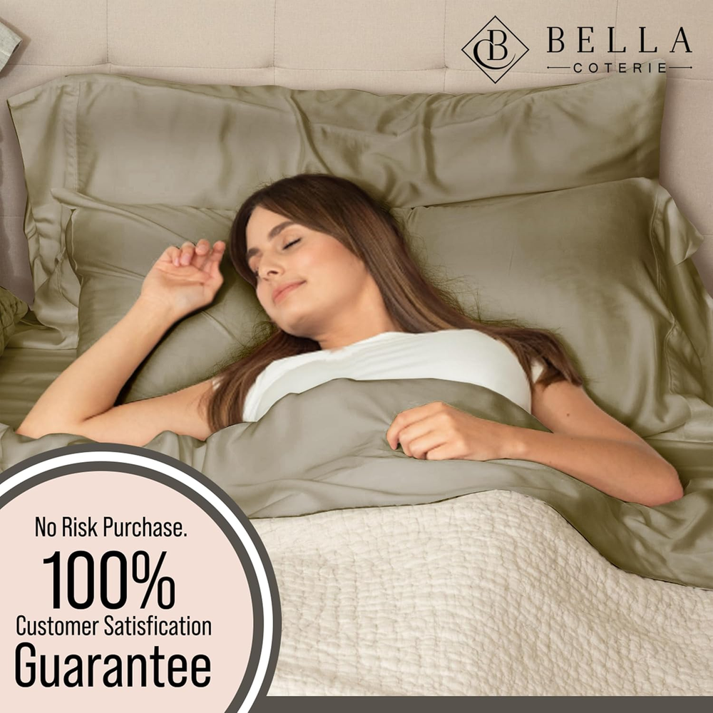 Store New Arrivals Add to Favorite View Feedback Contact Luxury Bamboo Queen Size Sheet Set | 100% Organically Grown Bamboo Viscose | Ultra Soft | Cooling for Hot Sleepers | 18" Deep Pocket [Olive] Description Style Luxury Bedding Weave Type Sateen Pattern Solid Country of Origin China Theme Winter Number of Pieces 4 Unit Count 1.0 Count Pillowcase Quantity 2 Material Organically Grown | Viscose Made From Bamboo Item Display Dimensions 96 x 105 inches Age Range (Description) Adult Seasons Winter, Summer, Fall, Spring Package Dimensions 13.74 x 10.63 x 3.03 inches Included Components 2 Pillowcases, Fitted Sheet, Flat Sheet Closure Type Envelope Item Weight 5.41 pounds Occasion Everyday/Casual Fitted Sheet Pocket Depth 18 Inches Special Feature Cooling, 18" Extra Deep Pocket, Hypoallergenic, Sateen Weave, Moisture Wicking Color Olive Thread Count 400 Product Care Instructions Machine Wash, Tumble Dry Size Queen RECHARGE YOUR SOUL- Embrace yourself in the luxury of 100% viscose made from bamboo sheets and you will wake up feeling renewed and refreshed. Lightweight and silky, hypoallergenic and moisture-wicking, these sheets keep you cool in summer and warm in winter. REDEFINE YOUR LIFESTYLE- With a 400 thread count, the superior quality of these 100% viscose derived from bamboo sheets are a dream to sleep on, getting softer with every wash. The 18" extra deep pocket fitted sheet will fit even the most plush pillow top mattresses. RENEW YOUR SLEEP - You can rest well in luxury bedding knowing that your sheets have been tested and certified to be free of over 100 harmful chemicals with the OEKO-TEX 100 certification. REINVIGORATE YOUR RELATIONSHIP - Enhance every part of your relationship as you cozy up with your loved one and enjoy the silky, soft, woven bliss of 100% viscose made from bamboo. ADD TO CART WITH CONFIDENCE in our 100% Customer Satisfaction Guarantee! Product Description Slip Into Luxurious Comfort With 100% Bamboo Viscose Bedding The video showcases the product in use. The video guides you through product setup. The video compares multiple products. The video shows the product being unpacked. How should I care for my Bella Coterie sheets to maintain their quality and durability? Simply wash and dry. Bella Coterie bamboo sheets are designed with durability in mind to resist fading and pilling. Are Bella Coterie sheets designed for a secure fit? From deep pockets that ensure a perfect fit, to non-slip straps that keep everything in place - Bella Coterie sheets are thoughtfully crafted for comfort and function. Are these sheets made from sustainable materials? Our 100% organically grown bamboo viscose sheets are OEKO-TEX Standard 100 certified, meaning every component has been tested for over 100 harmful chemicals. Rest easy knowing you're wrapped in sheets that are free from toxins and pesticides. Why choose Bella Coterie bamboo viscose sheets over cotton or synthetic? Bamboo is naturally cooling to reduce night sweats, hypoallergenic for sensitive skin, and is moisture wicking to keep your sheets dry and free of allergens.. Are Bella Coterie Sheets soft to the touch and breathable? Say goodbye to rough and scratchy sheets! Organically grown bamboo viscose offers unparalleled silky softness without synthetic fibers that can irritate skin. Experience cooling comfort - naturally breathable for temperature control. Bella Coterie Luxury Bedding Add to Cart Add to Cart Add to Cart Customer Reviews 4.4 out of 5 stars 3,685 4.3 out of 5 stars 97 4.5 out of 5 stars 422 4.5 out of 5 stars 287 Price $129.99 $ 129 . 99 $129.99 $ 129 . 99 $29.74 $ 29 . 74 — Material 100% Viscose from Bamboo 100% Viscose from Bamboo 100% Viscose from Bamboo 100% Pure 6A Mulberry Silk Secure Fit 18" Extra Deep Pockets 8 Corner Ties & Button Closure Envelope Sham Zipper Closure Fabric Feel Silky Smooth & Cool to Touch Silky Smooth & Cool to Touch Silky Smooth & Cool to Touch Ultra Soft & Breathable Temperature Regulating Breathable & Cooling Breathable & Cooling Breathable & Cooling Cozy & Cool Designer Color Collection 16+ Colors Available 14+ Colors Available 16+ Colors Available 10+ Colors Available Machine Washable ✔ ✔ ✔ ✔ Anti-Pilling / Anti-Fading ✔ ✔ ✔ ✔ OEKO TEX Certified ✔ ✔ ✔ ✘ ABOUT US We offer the best prices around on high quality products. Our E-store includes media such as books, movies, music and games while offering electronics, toys, sporting apparel, clothing, tools, general home, garden items and more. SHIPPING We are always working hard to ensure your package arrives as soon as possible. Please understand that some factors like weather, high postal traffic, and the performance of shipping companies are outside of our control. We offer free shipping to the lower 48 states and ship within 2 business days of payment, usually sooner. We do not accept P.O. Boxes. Please provide a physical address. For shipping outside of the continental USA, we only use eBay's Global Shipping Program.The item is shipped to KY and then sent to the rest of the world. International customers are responsible for all duties and taxes. Continue to check out in order to calculate costs for shipping the item to your country. Messages regarding eBay's Global Shipping Program MUST be directed at eBay EXCLUSIVELY. RETURNS We offer a 30-Day Return Policy on items which you are not completely satisfied with. You have the option for a full-refund or an exchange of the item. No returns are available on items shipped outside of the USA. PAYMENT We accept PayPal. CONTACT US This page content is yet to come Please ad us to your favorite seller and visit again later Thank You CUSTOMER SATISFACTION We try our very best to make sure every customer is completely satisfied. If there's a problem, message us! We're happy to help.