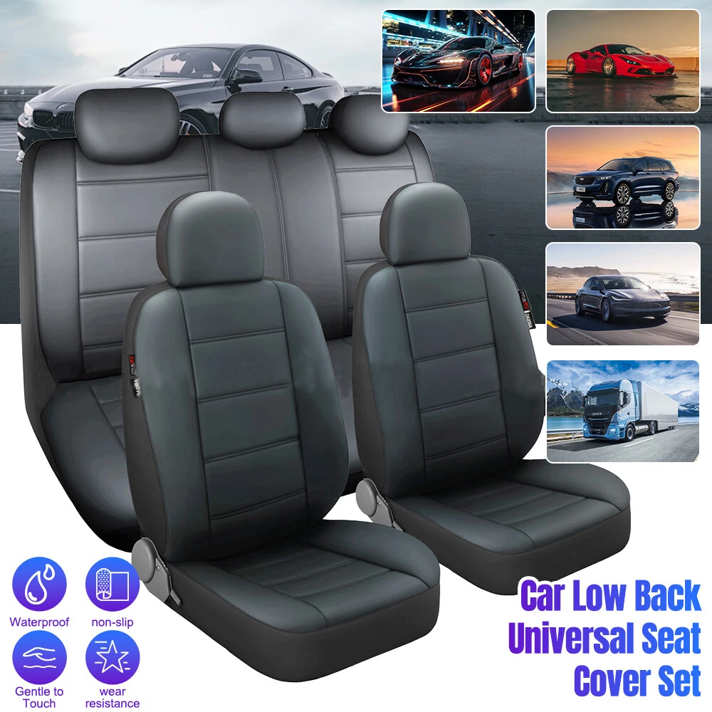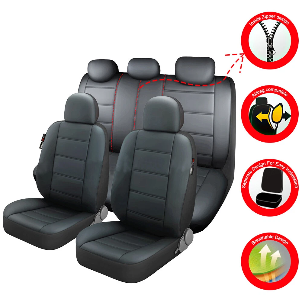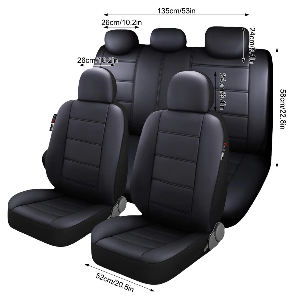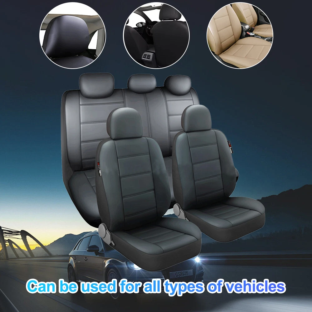 Product Description PREMIUM QUALITY MATERIAL AND DESIG N – Premium PU leather with classic stitching pattern design will provide you a fresh, durable and comfortable car internal decoration. All seasons using and will not be outmoded. AIRBAG COMPATI BLE –Special stitching on front cover sides makes airbag compatible and safe driving. EASY TO INSTA LL – Easy to install according to the instructions packed together. To make the better fit for safety belts on rear seat, it may need your hand work to cut holes. UNIVERSAL F IT – The covers are designed in universal size fitted most cars, trucks, Vans and SUVs. 3 zippers on rear backrest cover designed to accommodate 50/50, 40/60, 60/40 and 40/20/40 split. FULL SET PACKAGE INCLUDE S – 2 front low back bucket covers, 2 front seat covers, 1 rear backrest cover, 1 rear bottom bench cover, 5 separate headrest covers. Full set covers will make the car seat all-around protection against spills, stains and dirt Detail : Color: Black/Gray/Beige Material: PU Leather Placement on Vehicle: Front and rear Applicable Season: Autumn Winter Spring Summer Headrest Covers Size: 30*27cm Front Seat Covers Size: 118*56cm backrest size : 135*76cm rear seat cushion size : 135*56cm Product Size: Front seat covers x 2pcs Rear seat covers x 1pcs Rear chair cover x 1pcs Head cover x 5pcs