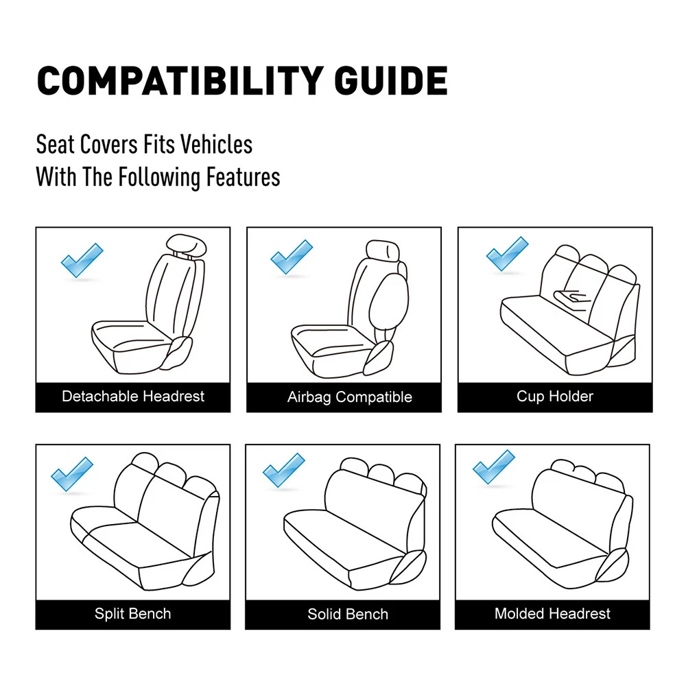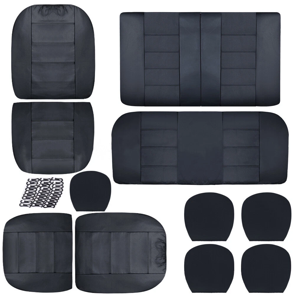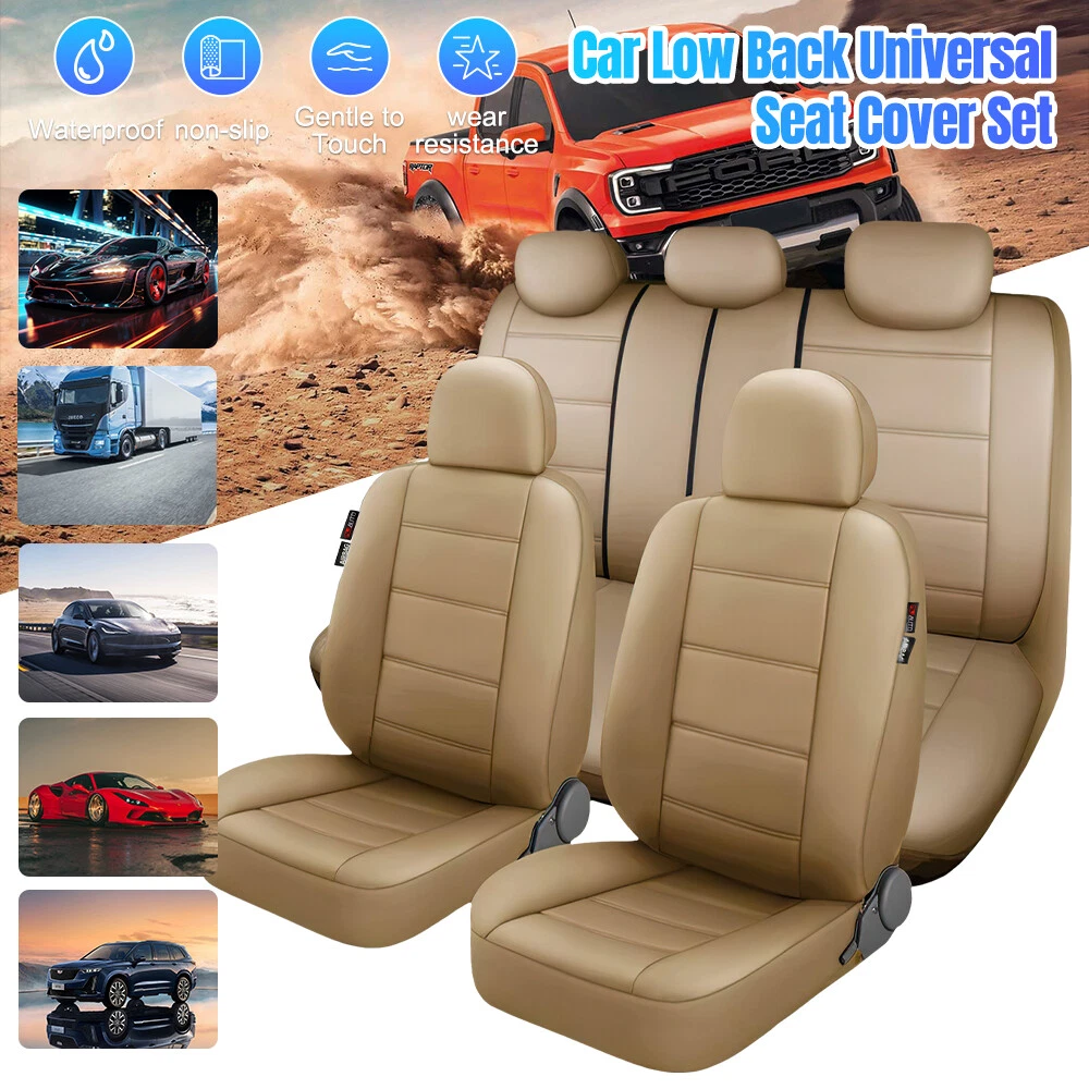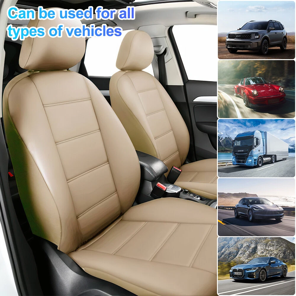 Product Description PREMIUM QUALITY MATERIAL AND DESIG N – Premium PU leather with classic stitching pattern design will provide you a fresh, durable and comfortable car internal decoration. All seasons using and will not be outmoded. AIRBAG COMPATI BLE –Special stitching on front cover sides makes airbag compatible and safe driving. EASY TO INSTA LL – Easy to install according to the instructions packed together. To make the better fit for safety belts on rear seat, it may need your hand work to cut holes. UNIVERSAL F IT – The covers are designed in universal size fitted most cars, trucks, Vans and SUVs. 3 zippers on rear backrest cover designed to accommodate 50/50, 40/60, 60/40 and 40/20/40 split. FULL SET PACKAGE INCLUDE S – 2 front low back bucket covers, 2 front seat covers, 1 rear backrest cover, 1 rear bottom bench cover, 5 separate headrest covers. Full set covers will make the car seat all-around protection against spills, stains and dirt Detail : Color: Black/Gray/Beige Material: PU Leather Placement on Vehicle: Front and rear Applicable Season: Autumn Winter Spring Summer Headrest Covers Size: 30*27cm Front Seat Covers Size: 118*56cm backrest size : 135*76cm rear seat cushion size : 135*56cm Product Size: Front seat covers x 2pcs Rear seat covers x 1pcs Rear chair cover x 1pcs Head cover x 5pcs