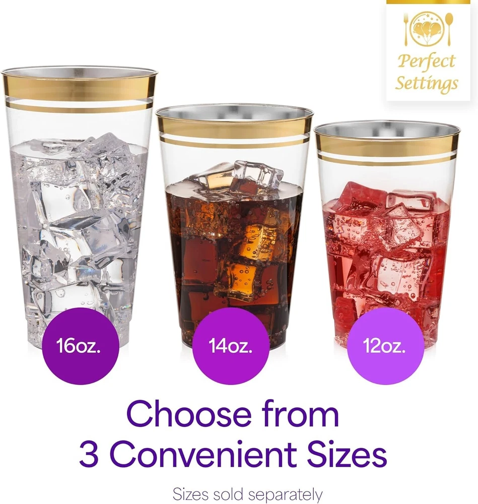 These elegant gold-trimmed cups instantly upgrade any gathering—perfect for parties, weddings, or casual drinks. The sturdy plastic feels premium, and the double gold rims add a luxe touch without the cleanup hassle. Holds beverages securely, and the 100-count ensures you’re always ready to host in style!