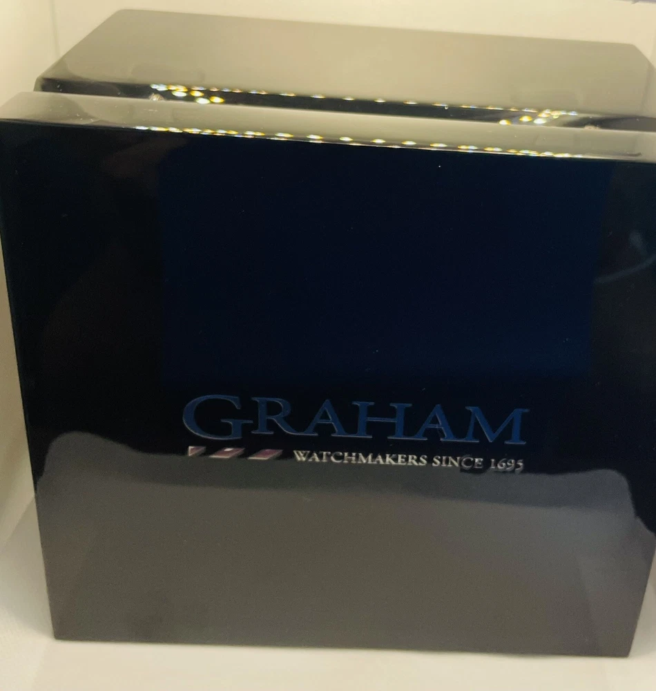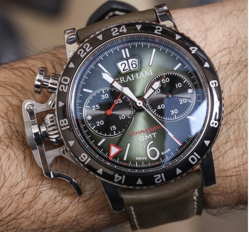 $200 Discount for Black Friday Only!! Graham Chronofighter Vintage Watch is a stunning timepiece with a round silver case and exhibition caseback. The watch features a green dial and a green rubber band, with a polished stainless steel case finish. It is a mechanical (automatic) movement watch with GMT features, and comes with its original box/packaging and manual/booklet. The watch is perfect for men who appreciate the elegance of a vintage watch. With a case size of 44 mm, it is a great addition to any watch collection. The Graham Chronofighter Vintage Watch is a Swiss-made timepiece and has a reference number of G01A. Get this luxurious watch on your wrist today!