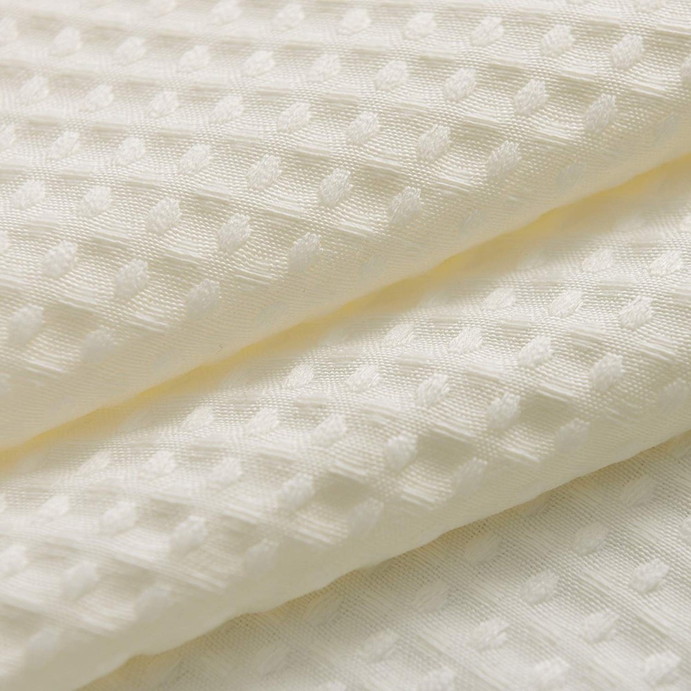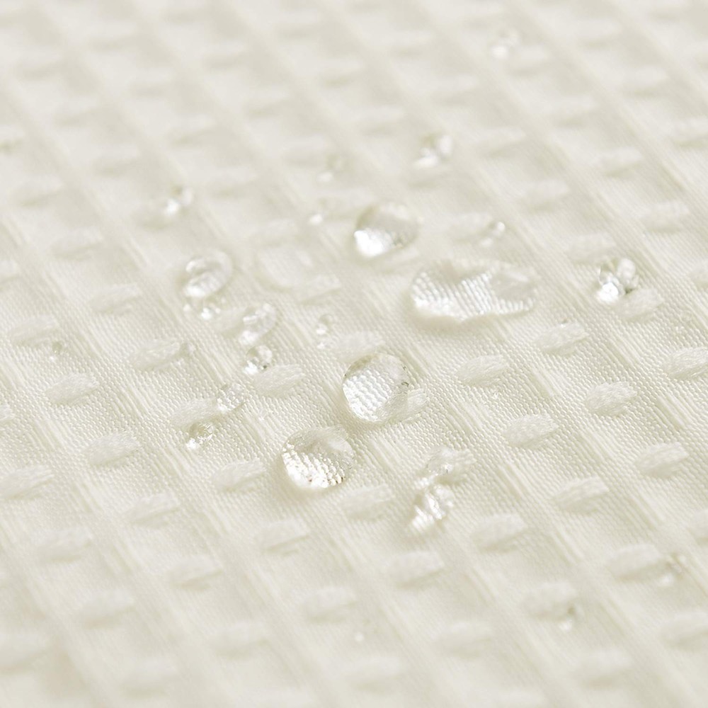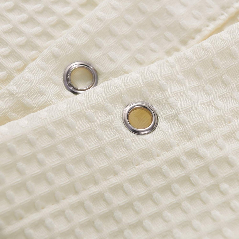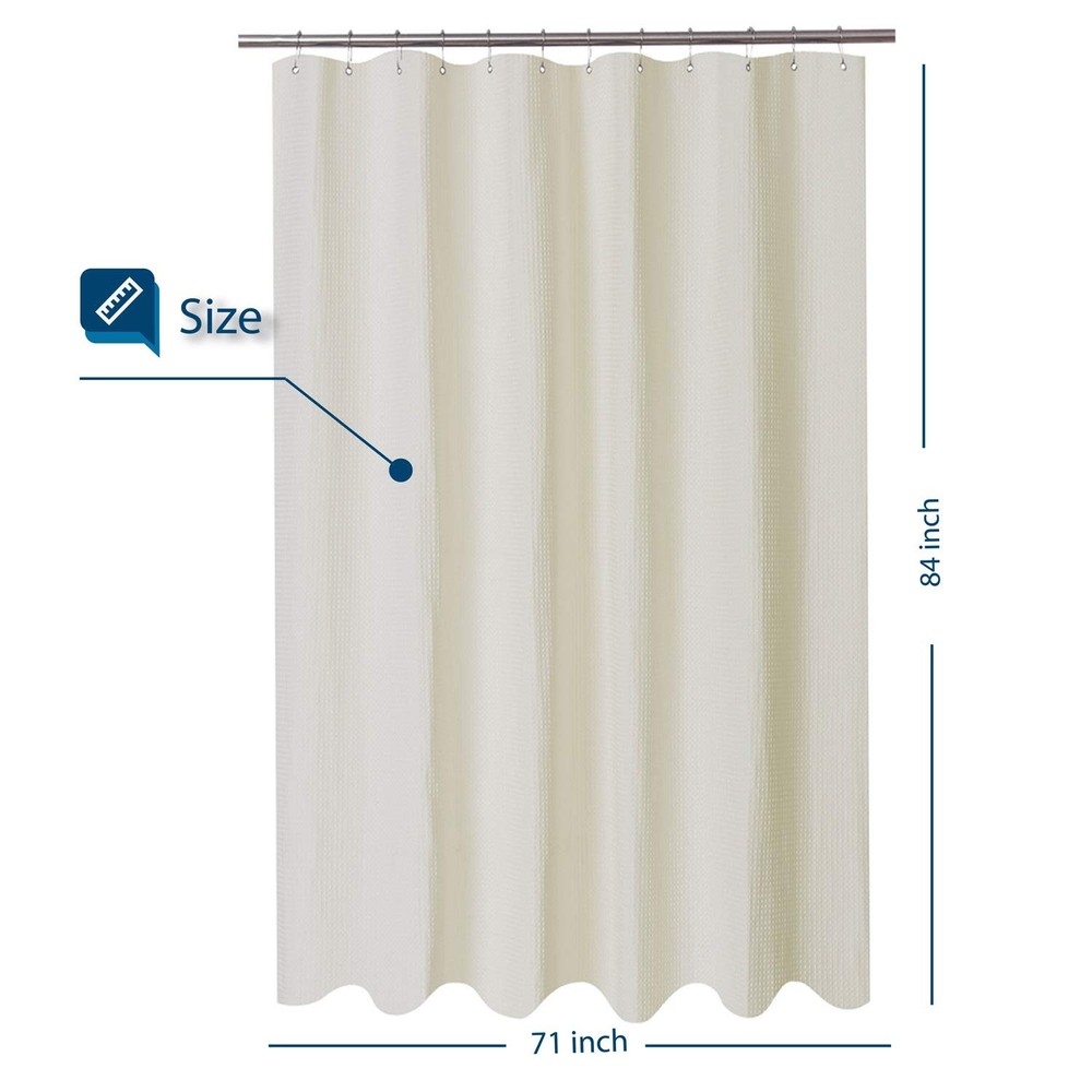 waffle weave shower curtain with textured design for a spa-like feel. Hotel Luxury: Soft waffle-weave cloth shower curtain with diamond pattern evokes a luxurious, spa-like feel, brings luxury hotel style to your bath High Quality: Touches like a cotton feel, heavyweight fabric with 230 GSM (gram per square meter) means very heavy duty, crafted with 100% premium polyester fabric ensures durability. Made from expertly chosen and tested polyester fabric, the shower curtain fits for moisture-rich environments. Elegant and upscale look easy to update bathroom decor theme Serve Well: This extra long shower curtain is water repellent and dries quickly, ensures that your solid white waffle shower curtain remains fresh and clean. Reinforced top header, rust-resistant metal grommets and fade-resistant fabric make these as functional as they are fashionable Green: Formaldehyde-free and environment friendly, no chemical coating and smell, no fading, no dyes Easy Care: Machine washable in cold water, gentle cycle, tumble dry. Cool iron if needed. Elegant drape with the extra-long size of 71" x 84", fits your bathroom well