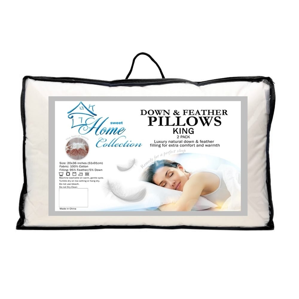 The Sweet Home Collection Luxury Natural Down and Feather Pillows are the remedy for a perfect sleep. Featuring a 100 percent cotton cover with a double stitched piped edging and natural down and feather filling, this pillow set adds extra comfort and warmth. This 2 pack comes neatly packaged in a zippered carrying case with handles that can be used for travel or storage. Set includes: Two (2) pillowsMaterials: Cover: 100-percent cotton, Filling: 95-percent feather/ 5-percent downDimensions: Standard: 20 inches wide x 26 inches long Queen: 20 inches wide x 30 inches longKing: 20 inches wide x 36 inches long Pillow Material: CottonType of Sleeper: AnyFill Type: Feather, DownCare Instruction: Machine WashPillow Type: BedFirmness: SoftExact Color: WhiteSize: Queen, Standard, King Free Shipping Over $49.99* Details Sweet Home Collection Luxury Natural Feather Bed Pillows White Product Description: The Sweet Home Collection Luxury Natural Down and Feather Pillows are the remedy for a perfect sleep. Featuring a 100 percent cotton cover with a double stitched piped edging and natural down and feather filling, this pillow set adds extra comfort and warmth. This 2 pack comes neatly packaged in a zippered carrying case with handles that can be used for travel or storage. Set includesTwo (2) pillows MaterialsCover100-percent cotton, Filling95-percent feather/ 5-percent down Dimensions: Standard20 inches wide x 26 inches long Queen20 inches wide x 30 inches long King20 inches wide x 36 inches long Pillow MaterialCotton Type of SleeperAny Fill TypeFeather, Down Care InstructionMachine Wash Pillow TypeBed FirmnessSoft Exact ColorWhite SizeQueen, Standard, King The digital images we display have themost accurate color possible. However, due to differences in computer monitors,we cannot be responsible for variations in color between the actual product andyour screen. Down and feather-filledproducts are packaged tightly during shipping. Upon receipt, remove this itemfrom its packaging, fluff gently, and allow several hours for full loftrecovery. In addition, products sealed in plastic packaging sometimes have adisagreeable scent because of concentrated natural fibers. A few hours ofairing typically removes the odor. Werecommend that this item is fluffed at least once a week to maintain downdistribution.