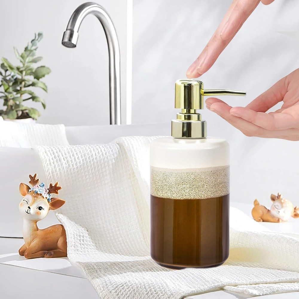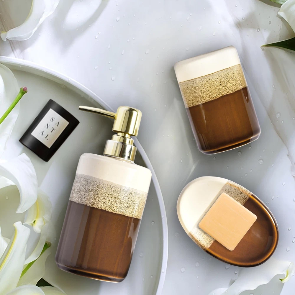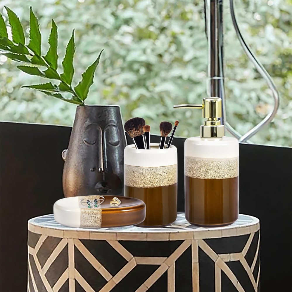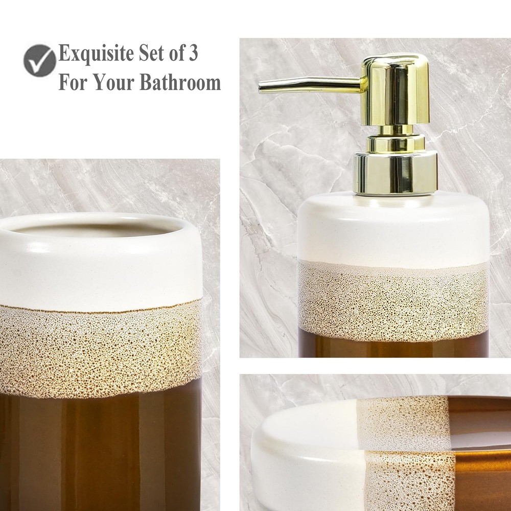 Bathroom Accessories Set of 3, Natural Reactive Glaze Ceramic Bathroom Sets Complete-Toothbrush Holders, Soap Dispenser, Soap Dish, Luxury Bathroom Decor, Bathroom Countertop Organizer, Brown Gold Stylish Bathroom Decor: The bathroom accessories feature a sophisticated subtle texture style, with a flowing wave-inspired appearance that brings a modern yet timeless charm to bathroom sink or bathroom countertop. Bathroom Accessory Set Complete: The bathroom set includes 1 toothbrush holders, 1 soap dispenser and 1 soap dish. A must have bathroom counter organizer to hold your bathroom essentials and keep countertop tidy. Durable & Easy to Clean: Crafted from high-quality ceramic, this bathroom accessories set is built to last. The glossy finish in beautiful glaze is is not only visually appealing but also highly durable and easy to clean. Simply rinse with water or wipe with a towel to remain hygiene. Versatile Bathroom Accessories: The bathroom tumbler is perfect for toothpaste, razors, makeup brushes on vanity, or pens, pencils on desk. The soap dispenser can be used for hand soap, lotion or dish soap in the kitchen. The soap holder is also ideal jewelry tray for storing earrings, rings, necklaces jewelry tray before a shower or other occasion. Perfect Gift Idea: This exquisite ceramic bathroom accessory set makes an excellent gift for housewarmings, weddings, thanksgiving, Christmas and other special occasions. Treat your friends and family to a stylish and functional addition to their home decor. Appropriate Size: Each piece has the following dimensions: Lotion Dispenser-3" x 3" x 6.9"(15oz), soap dish-5" x 32" x 1", tooth brush holder-2.95" x 2.95" x 4.3" This exquisite bathroom accessory set combines timeless charm with contemporary design, featuring a subtle texture style inspired by flowing waves. A perfect choice to decor bathroom sink or countertop. This bathroom accessories set complete includes: 1 Toothbrush Holder: Keeps your toothbrushes neatly organized and within easy reach. 1 Soap Dispenser: Perfect for hand soap, lotion, or even dish soap in the kitchen. 1 Soap Dish: Ideal for holding bars of soap while also doubling as a jewelry tray for storing earrings, rings, and necklaces. Together, these pieces form an essential bathroom counter organizer that helps keep your essentials tidy and accessible. Built to Last and Easy to Maintain Crafted from high-quality ceramic, this bathroom set is designed for durability. The glossy finish, enhanced with a beautiful glaze, not only looks visually appealing but is also highly resistant to wear and tear. Cleaning is a breeze—simply rinse with water or wipe down with a towel to maintain hygiene and shine. Versatile Design for Multiple Uses The versatility of this set extends beyond the bathroom. The toothbrush holder can be used to store toothpaste, razors, or makeup brushes on your vanity, or even pens and pencils on your desk. The soap dispenser is equally functional in the kitchen, while the soap dish serves as an elegant jewelry tray before showers or other occasions. A Thoughtful Gift for Any Occasion This exquisite ceramic bathroom accessory set makes an ideal present for housewarmings, weddings, Thanksgiving, Christmas, and other special occasions. Treat your friends and family to a stylish and functional addition to their home decor. Appropriate Size Each piece fits seamlessly into any bathroom decor or vanity setup: Lotion Dispenser: 3" x 3" x 6.9" (15oz) Soap Dish: 5" x 3.2" x 1" Toothbrush Holder: 2.95" x 2.95" x 4.3" SHIPPING Domestic Buyers - We have confidence in our products, but if you are not fully satisfied please contact us within 30 days of purchase and you will get full refund. - We ship within 3 business days of payment, usually sooner - We offer FREE shipping on all orders! - We only ship to the lower 48 states, no APO/FPO addresses or PO Boxes allowed International buyers – please note: Import duties, taxes, and charges aren't included in the item price or postage cost. These charges are the buyer's responsibility. - Please check with your country's customs office to determine what these additional costs will be prior to bidding or buying. * Order Cancellation Policy ** You can return a product for up to 30 days from the date you purchased it. 1. The seller reserves the right to cancel the special case only due to eBay cancellation fee. 2. The decision of seller is the final. 3. The seller will respond to the cancellation request within 2 business days. Please wait for the result of cancellation. 4. In case the cancellation is not completed by some reasons, the buyer can follow the options below to get the refund. 4.1 The buyer can reject the item when it arrives. 4.2 The buyer can send the item back to the seller within 30 days If the buyer receives item (USA Shipment ONLY). The seller will provide the FREE return label to the buyer when the buyer opens " Return Item" case on eBay by using the reason as "Change my mind" ONLY. 5. When buyer has placed the order. The order will be processed and completed by automatic warehouse system within 5 minutes. In case that buyer sends the cancellation request after 5 minutes of placing the order, the request will be rejected. **Sending direct message to cancel the order is not allowed for every case.* Return Policy For the return case - If buyer would like to return the items for refund or replacement, please CONTACT SELLER to receive the free return label from seller. The refund or replacement will be processed with the tracking number of return label which is provided by seller only. The other ways of return which are not approved by seller will not be processed for the refund or replacement.
