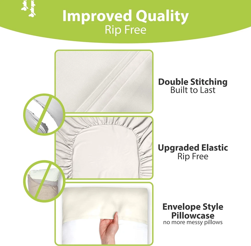 Store New Arrivals Add to Favorite View Feedback Contact Luxury Series Queen Sheet Set - 100% Pure Viscose Derived from Bamboo Sheets Queen Size - Super Soft Queen Cooling Sheets for Hot Sleepers - up to 16’’ Deep Pocket Queen Sheets (Ivory) Description Item model number Bamboo Sheets Queen Size Style Contemporary Pillowcase Width 2E+1 Inches Weave Type Sateen Pattern Solid Country of Origin China Theme winter Cartoon Character 4 Number of Pieces 4 Unit Count 1 Count Pillowcase Quantity 2 Material Viscose derived from Bamboo Item Display Dimensions 13.38 x 2.95 x 9.45 inches Age Range (Description) Adult Seasons All Is Discontinued By Manufacturer No Included Components Flat She, Fitted Sheet Closure Type Envelope Item dimensions L x W x H 13.38 x 2.95 x 9.45 inches Item Weight 5.94 pounds Fitted Sheet Pocket Depth 9.45 Inches Special Feature Cooling, Breathable Color Ivory Thread Count 1800 Product Dimensions 13.38 x 2.95 x 9.45 inches Product Care Instructions Machine Wash, Hand Wash Only Size Queen - 4 Pieces Set PURE 100% VISCOSE DERIVED FROM BAMBOO: Experience the pure luxury of 100% viscose derived from bamboo sheet set. COMPLETE 4-PIECE QUEEN SIZE SHEET SET: Experience a touch of luxury every night with our complete 4-piece queen bed set. This set includes 1 luxuriously soft flat sheet (90"x102"), 1 fully elasticized fitted sheet (60"x80") for a secure fit on mattresses up to 16 inches deep, and 2 envelope-style colling pillow cases (20"x30") with overlapping closures for added comfort. Our queen bed sets are machine washable for easy care and get softer with every wash. ULTIMATE COOLING COMFORT & BREATHABLE BLISS: Experience the unparalleled softness and natural breathability of 100% viscose derived from bamboo cooling sheets. These cooling bed sheets are thermo-regulating, keeping you cool and relaxed all night long, perfect for hot sleepers or those with sensitive skin. The moisture-wicking properties ensure year-round comfort, allowing you to indulge in luxurious softness with every wash. DEEP POCKETS ,SILKY SMOOTH SATEEN WEAVE: Woven in a luxurious sateen weave, these 100% viscose derived from bamboo sheets offer an incredibly soft and smooth feel that gets even softer with every wash. Indulge in hotel-like comfort every night. Our deep pocket queen sheet set features a fully elasticized fitted sheet with a deep pocket (fits mattresses up to 16 inches) for a secure, stay-put fit. OEKO-TEX STANDARD 100 CERTIFIED: Responsibly sourced and Crafted from 100% viscose derived from bamboo bed sheets, a sustainable resource. These OEKO-TEX sheets are free from harmful substances for a healthy sleep environment. Unlike most, our sheets queen size bed set offer a luxurious, sustainable sleep experience you won't find anywhere else. Upgrade your sleep tonight! Product Description One Of A Kind Bamboo Sheets An average person spends around 26 years asleep in a lifetime. That reason only was enough of an inspiration for us to design our game- changing & luxurious Bampure bamboo bed sheets that will help you sleep like a baby every single night. Top Of The Line Experience Bampure bamboo bed sheet set has been carefully manufactured to bring you next level comfort. No more looking for a "cold spot" on your pillow, no more sweating at night, No more harmful synthetics - just pure relaxation. Corner Strap Included Every Bampure bamboo bed sheet set comes with a fitted sheet. Not just any fitted sheet - ours features corner straps that keep the fitted sheet in place at all times. Available In Multiple Colors Choose between a wide array of colors & decorate your bedroom like never before. 2 Pillowcases Every set comes with 2 envelope style pillowcases that not only look good, but also feel good. There's More To Bamboo Bed Sheets Than You'd Think Bampure bed sheets are as close to nature as it gets - they're crafted from 100% organic bamboo viscose. Bamboo sheets are also softer than any cotton sheets available. Combine all that with durability & breathability - it's a perfect recipe for a truly dreamy experience. Bring Nature To Your Bedroom Being in close touch with nature is beneficial in all areas of life. Then why wouldn't you bring it to the bedroom? The team at Bampure is here to provide our customers natural, organic & comfortable bedding. Discover our selection of nature-driven bedroom accessories! ABOUT US We offer the best prices around on high quality products. Our E-store includes media such as books, movies, music and games while offering electronics, toys, sporting apparel, clothing, tools, general home, garden items and more. SHIPPING We are always working hard to ensure your package arrives as soon as possible. Please understand that some factors like weather, high postal traffic, and the performance of shipping companies are outside of our control. We offer free shipping to the lower 48 states and ship within 2 business days of payment, usually sooner. We do not accept P.O. Boxes. Please provide a physical address. For shipping outside of the continental USA, we only use eBay's Global Shipping Program.The item is shipped to KY and then sent to the rest of the world. International customers are responsible for all duties and taxes. Continue to check out in order to calculate costs for shipping the item to your country. Messages regarding eBay's Global Shipping Program MUST be directed at eBay EXCLUSIVELY. RETURNS We offer a 30-Day Return Policy on items which you are not completely satisfied with. You have the option for a full-refund or an exchange of the item. No returns are available on items shipped outside of the USA. PAYMENT We accept PayPal. CONTACT US This page content is yet to come Please ad us to your favorite seller and visit again later Thank You CUSTOMER SATISFACTION We try our very best to make sure every customer is completely satisfied. If there's a problem, message us! We're happy to help.
