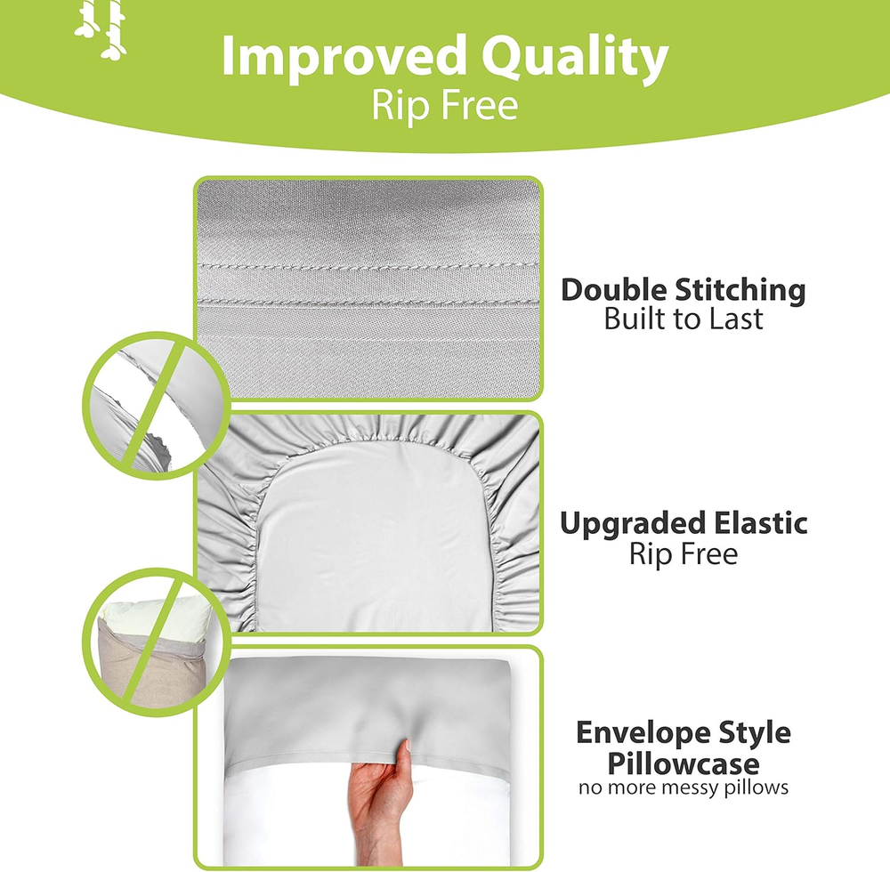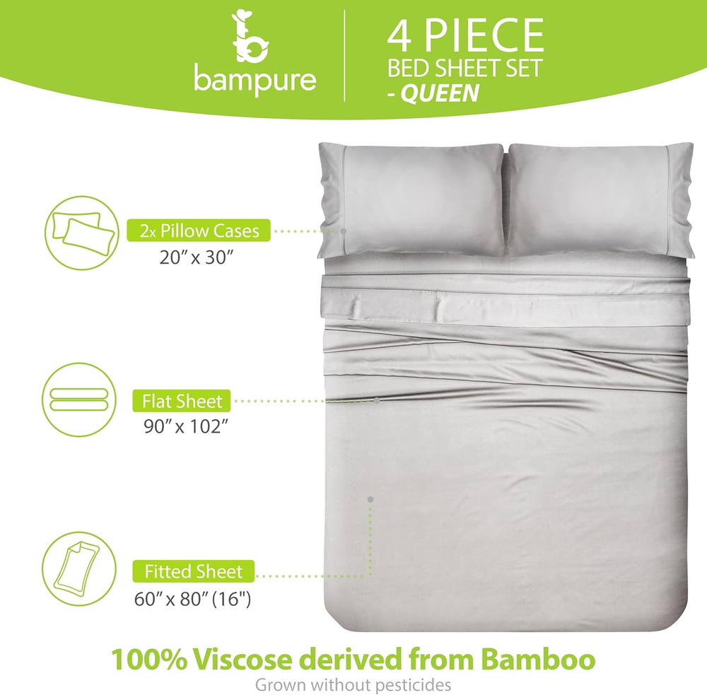 Store New Arrivals Add to Favorite View Feedback Contact Luxury Series Queen Sheet Set - 100% Pure Viscose Derived from Bamboo Sheets Queen Size - Super Soft Queen Cooling Sheets for Hot Sleepers - up to 16’’ Deep Pocket Queen Sheets (L Grey) Description Item model number Bamboo Sheets Queen Size Style Queen Light Grey Pillowcase Width 2E+1 Inches Weave Type Sateen Pattern Solid Country of Origin China Theme winter Cartoon Character 4 Number of Pieces 4 Unit Count 1 Count Pillowcase Quantity 2 Material Viscose Derived from Bamboo Item Display Dimensions 13.38 x 2.95 x 9.45 inches Age Range (Description) Adult Seasons All Is Discontinued By Manufacturer No Included Components 1 Fitted Sheet, 2 Pillowcases, 1 Flat Sheet Closure Type Envelope Item dimensions L x W x H 13.38 x 2.95 x 9.45 inches Item Weight 5.41 pounds Pillowcase Length 3E+1 Inches Fitted Sheet Pocket Depth 16 Inches Special Feature Deep Pocket, Breathable Color Light Gray Thread Count 1800 Product Dimensions 13.38 x 2.95 x 9.45 inches Product Care Instructions Machine Wash, Hand Wash Only Size Queen - 4 Pieces Set PURE 100% VISCOSE DERIVED FROM BAMBOO: Experience the pure luxury of 100% viscose derived from bamboo sheet set. COMPLETE 4-PIECE QUEEN SIZE SHEET SET: Experience a touch of luxury every night with our complete 4-piece queen bed set. This set includes 1 luxuriously soft flat sheet (90"x102"), 1 fully elasticized fitted sheet (60"x80") for a secure fit on mattresses up to 16 inches deep, and 2 envelope-style colling pillow cases (20"x30") with overlapping closures for added comfort. Our queen bed sets are machine washable for easy care and get softer with every wash. ULTIMATE COOLING COMFORT & BREATHABLE BLISS: Experience the unparalleled softness and natural breathability of 100% viscose derived from bamboo cooling sheets. These cooling bed sheets are thermo-regulating, keeping you cool and relaxed all night long, perfect for hot sleepers or those with sensitive skin. The moisture-wicking properties ensure year-round comfort, allowing you to indulge in luxurious softness with every wash. DEEP POCKETS ,SILKY SMOOTH SATEEN WEAVE: Woven in a luxurious sateen weave, these 100% viscose derived from bamboo sheets offer an incredibly soft and smooth feel that gets even softer with every wash. Indulge in hotel-like comfort every night. Our deep pocket queen sheet set features a fully elasticized fitted sheet with a deep pocket (fits mattresses up to 16 inches) for a secure, stay-put fit. OEKO-TEX STANDARD 100 CERTIFIED: Responsibly sourced and Crafted from 100% viscose derived from bamboo bed sheets, a sustainable resource. These OEKO-TEX sheets are free from harmful substances for a healthy sleep environment. Unlike most, our sheets queen size bed set offer a luxurious, sustainable sleep experience you won't find anywhere else. Upgrade your sleep tonight! Product Description One Of A Kind Bamboo Sheets An average person spends around 26 years asleep in a lifetime. That reason only was enough of an inspiration for us to design our game- changing & luxurious Bampure bamboo bed sheets that will help you sleep like a baby every single night. Top Of The Line Experience Bampure bamboo bed sheet set has been carefully manufactured to bring you next level comfort. No more looking for a "cold spot" on your pillow, no more sweating at night, No more harmful synthetics - just pure relaxation. Corner Strap Included Every Bampure bamboo bed sheet set comes with a fitted sheet. Not just any fitted sheet - ours features corner straps that keep the fitted sheet in place at all times. Available In Multiple Colors Choose between a wide array of colors & decorate your bedroom like never before. 2 Pillowcases Every set comes with 2 envelope style pillowcases that not only look good, but also feel good. There's More To Bamboo Bed Sheets Than You'd Think Bampure bed sheets are as close to nature as it gets - they're crafted from 100% organic bamboo viscose. Bamboo sheets are also softer than any cotton sheets available. Combine all that with durability & breathability - it's a perfect recipe for a truly dreamy experience. Bring Nature To Your Bedroom Being in close touch with nature is beneficial in all areas of life. Then why wouldn't you bring it to the bedroom? The team at Bampure is here to provide our customers natural, organic & comfortable bedding. Discover our selection of nature-driven bedroom accessories! ABOUT US We offer the best prices around on high quality products. Our E-store includes media such as books, movies, music and games while offering electronics, toys, sporting apparel, clothing, tools, general home, garden items and more. SHIPPING We are always working hard to ensure your package arrives as soon as possible. Please understand that some factors like weather, high postal traffic, and the performance of shipping companies are outside of our control. We offer free shipping to the lower 48 states and ship within 2 business days of payment, usually sooner. We do not accept P.O. Boxes. Please provide a physical address. For shipping outside of the continental USA, we only use eBay's Global Shipping Program.The item is shipped to KY and then sent to the rest of the world. International customers are responsible for all duties and taxes. Continue to check out in order to calculate costs for shipping the item to your country. Messages regarding eBay's Global Shipping Program MUST be directed at eBay EXCLUSIVELY. RETURNS We offer a 30-Day Return Policy on items which you are not completely satisfied with. You have the option for a full-refund or an exchange of the item. No returns are available on items shipped outside of the USA. PAYMENT We accept PayPal. CONTACT US This page content is yet to come Please ad us to your favorite seller and visit again later Thank You CUSTOMER SATISFACTION We try our very best to make sure every customer is completely satisfied. If there's a problem, message us! We're happy to help.