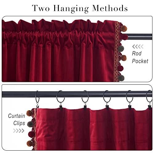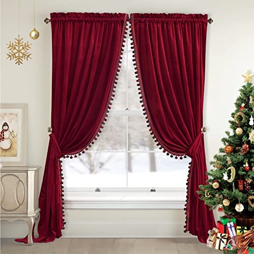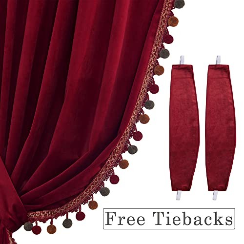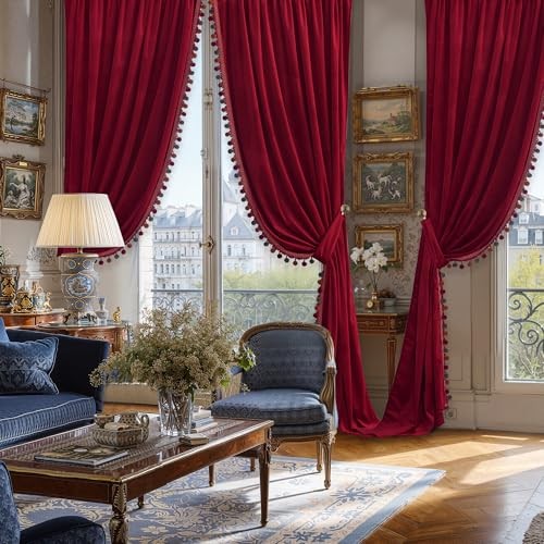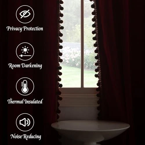Luxury Red Pompom Velvet Curtains - 52"W x 96"L (Pack of 2) Pompom丨red