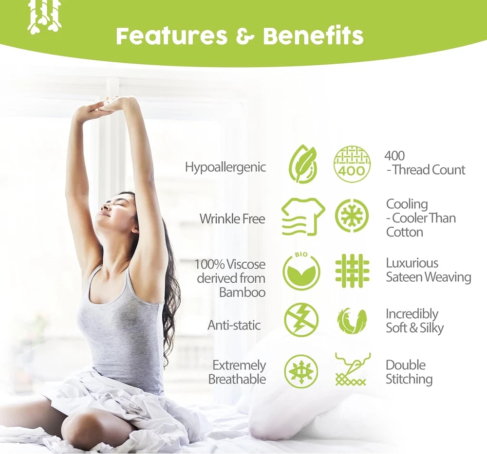 Store New Arrivals Add to Favorite View Feedback Contact Luxury Series 6 Pcs Queen Sheet Set - 100% Pure Viscose Derived from Bamboo Sheets Queen Size - Super Soft Queen Cooling Sheets for Hot Sleepers - up to 16’’ Deep Pocket Queen Sheets (White) Product Information Item model number 6 Pc Bamboo Sheets Queen Size Style Queen White Weave Type Sateen Pattern Solid Country of Origin China Theme Winter Number of Pieces 6 Unit Count 1 Count Pillowcase Quantity 4 Material Viscose Derived from Bamboo Item Display Dimensions 13.38 x 1 x 2.75 x 9.44 inches Age Range (Description) Adult Seasons All Is Discontinued By Manufacturer No Included Components 1 Fitted Sheet, 1 Flat Sheet, 4 Pillowcases Closure Type Envelope Item dimensions L x W x H 13.38 x 2.75 x 9.44 inches Item Weight 6.09 pounds Pillowcase Length 3E+1 Inches Fitted Sheet Pocket Depth 9.44 Inches Special Feature Breathable, Moisture Wicking Color White Thread Count 1800 Product Dimensions 13.38 x 2.75 x 9.44 inches Product Care Instructions Machine Wash, Hand Wash Only Size Queen - 6 Pieces Set ABOUT US We are proud to be based in the United States, with all of our products shipping directly from within the country. Our selection includes home décor, furniture, sports equipment, tools, pet products, and more. If you have any questions about our products, we’re always happy to help. SHIPPING We are always working hard to ensure your package arrives as soon as possible. Please understand that some factors like weather, high postal traffic, and the performance of shipping companies are outside of our control. We offer free shipping to the lower 48 states and ship within 2 business days of payment, usually sooner. For shipping outside of the continental USA, we only use eBay's Global Shipping Program. The item is shipped to IL and then sent to the rest of the world. RETURNS We offer Free Returns for 30-Days on items which you are not completely satisfied with. You have the option for a full-refund or an exchange of the item. CUSTOMER SATISFACTION We try our very best to make sure every customer is completely satisfied. If there's a problem, message us! We're happy to help.