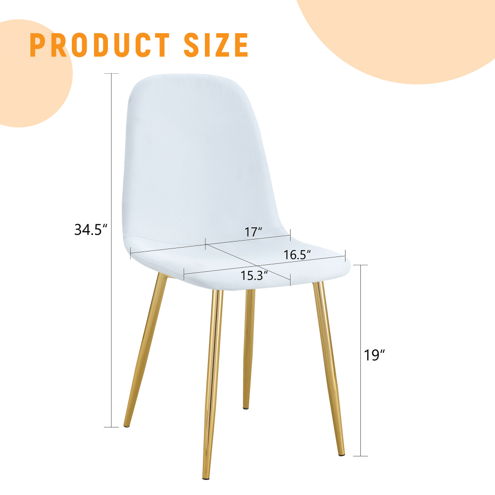 ✨ Key Features That Stand Out Timeless White & Gold Aesthetic : Crisp white PU leather seats pair seamlessly with glossy golden metal legs, creating a luxurious visual contrast that complements any interior style—from modern minimalist to industrial chic and traditional decor. It’s a classic color combo that never goes out of fashion! Integrated Molding Structure : One-piece backrest and seat cushion design delivers a sleek, smooth appearance while significantly boosting stability. No disjointed parts—just a cohesive look and reliable support. Cross Reinforcement for Maximum Durability : Hidden cross-bracing under the seat enhances structural integrity, upgrading load-bearing capacity to ensure long-lasting use for years to come. Integral Metal Leg Architecture : Solid one-piece metal legs eliminate excessive splicing, offering unmatched stability. The radiant golden finish adds a touch of opulence that elevates any space. Premium Comfort : High-resilience PU leather upholstery provides a soft, supportive seating experience—perfect for long meals or gatherings with friends and family. Effortless Assembly : Each set includes detailed, easy-to-follow instructions. Most users can assemble a chair in just 15-20 minutes—no professional tools needed! 📐 Product Specifications Item Details Assembled Dimensions (L×W×H) 17.00 × 15.30 × 34.50 inches Product Weight (per chair) 8.38 lbs Package Dimensions 29.53 × 25.20 × 18.70 inches Package Weight 44.09 lbs Material Premium Metal & PU Leather Color White + Gold 🛡️ Our Commitment to You We stand behind the quality of our products! Enjoy 1-Year Quality Warranty against manufacturing defects—we’ll repair or replace any faulty parts free of charge. Plus, take advantage of our 30-Day Free Return & Exchange Policy —if you’re not completely satisfied with your chairs, simply return them for a full refund or exchange, no questions asked. Note: Due to differences in monitor settings and lighting, slight color variations between the product and images are normal and not considered a defect. Perfect for dining rooms, kitchens, cafes, or home offices—this chair set brings luxury and practicality to any space. Add to cart today and transform your interior!