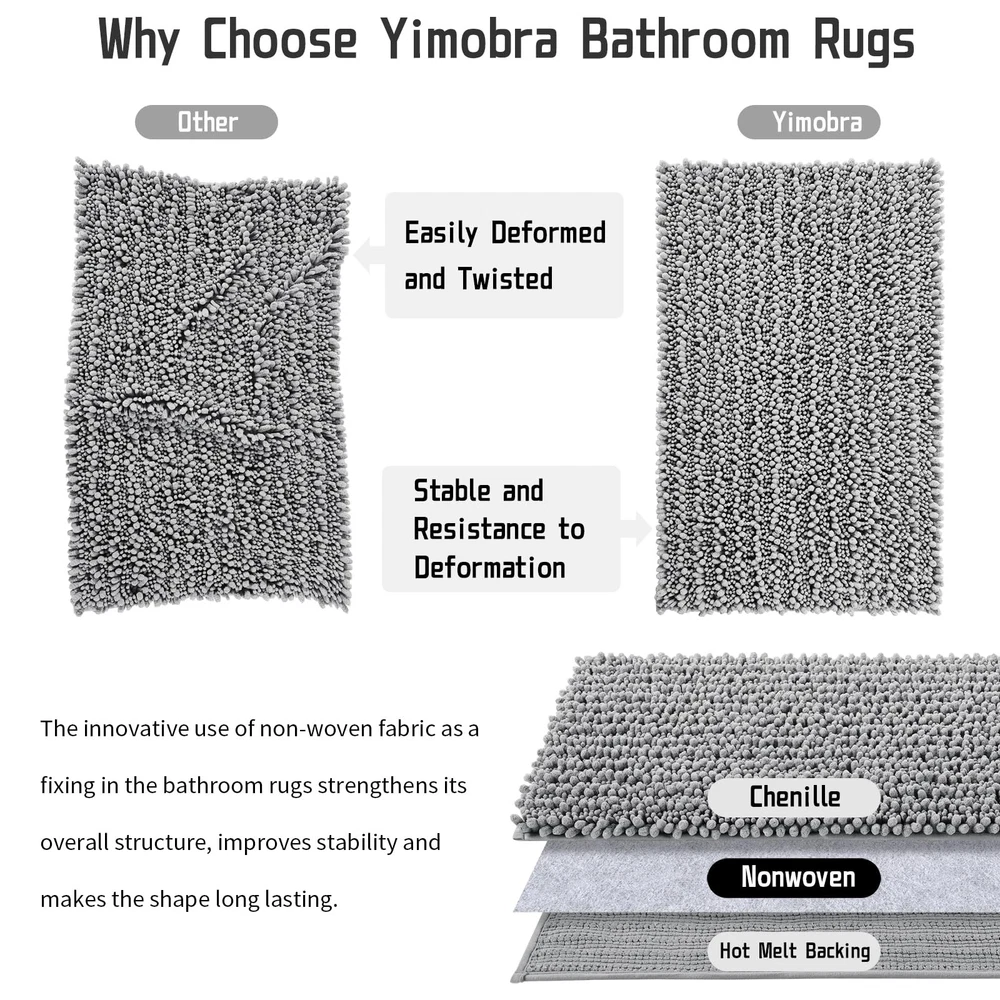 Bathroom Rugs Bath mat made by high quality shaggy .soft, comfortable,non-slip latex bottom, easy to clean and market other bathroom mat products unique design Feature 1.Machine wash save your time 2.Non slip mat protect your family safe 3.Mats use unique design increase the aesthetic Material Front: Soft towel fabric Maximum Absorbency water Size Containing edging 32 x 20 Inches (error of - / + 0.4 inch) Soft & Warm: luxury bath mat (32 x 20 Inches), avoid to jumping out the wet cold tiles after the bath, the thick and soft chenille floor mat makes your feet feel the ultimate luxury enjoyment. The higher piles than most other brands, offers exceptional comfort and support for your feet, means that softer and warmer Super Absorbent: No one likes the water on the bathroom floor, These thick fluffy microfiber bathroom rugs are super absorb water quickly with minutes, to leave your bathroom smelling fresh. bathroom mat is extremely plush more thick, there is no water with our mat. Thus making the bathroom mats amazing cozy Easy To Clean & Machine Washable: bath rug features anti slipping adhesive backing and quality thick shag, which has the advantages of staying in place firmly, easy to storage, can be folded, holding up to multiple machine washes and dry. The colors keep vibrant even after many times washes Multi Purpose Use: non-slip bath mat rug is suitable for tub-side, front of the sink, and any place in your home where you want to support and relax on your toes! We focus on quality and comfortable about mats for bathroom, and provide several more than 10 kinds of colors and various sizes of bathroom designs, that it matches your bathroom. Great for bathroom, vanity, vacation home, master bathroom, kids bathroom, guest suite How Is The Feeling Of Walking On The Clouds? It's Luxury Chenille Bathroom Mats! - Thicker and better constructed chenille bathroom mat, provides comfortable underfoot support is just like walking on the soft clouds. We have prepared many colors schemes for you, choosing the one of your favorite colors to match the home decoration perfectly. Tips: Due to the lighting and monitor settings, the color of pictures will be vary