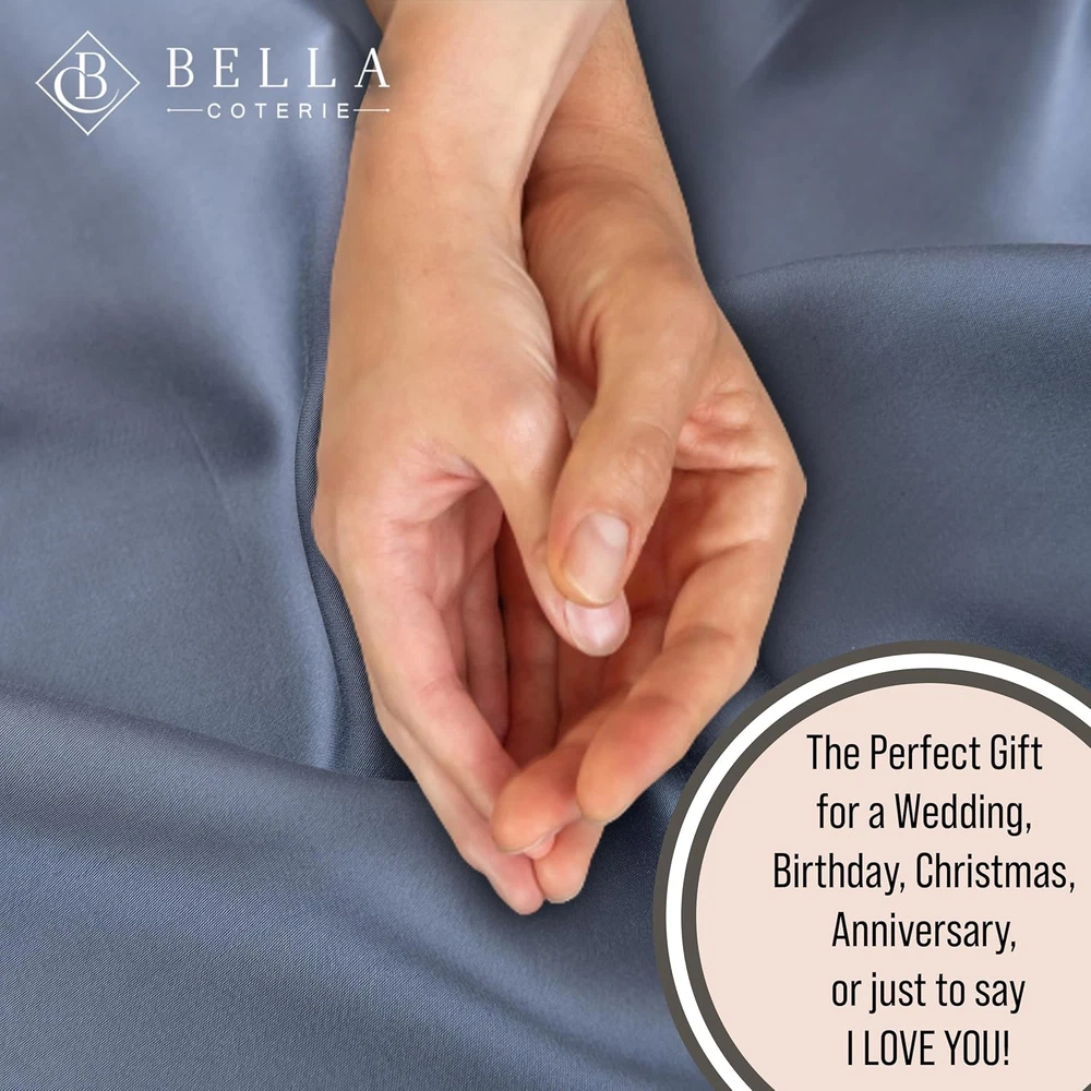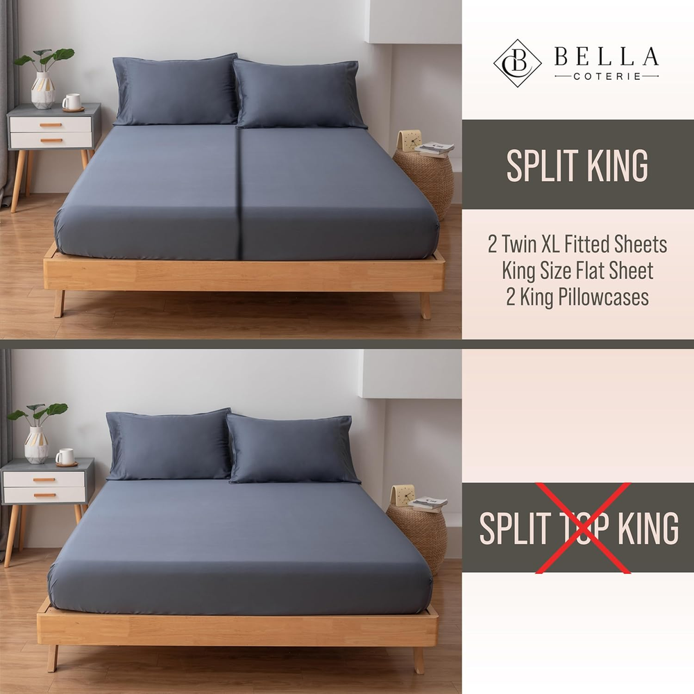 Store New Arrivals Add to Favorite View Feedback Contact Luxury Bamboo Split King Size Sheet Set | 100% Organically Grown Bamboo Viscose | Ultra Soft | Cooling for Hot Sleepers | 18" Deep Pocket [Slate Blue] Description Style Luxury Bedding Weave Type Sateen Pattern Solid Country of Origin China Theme Winter Number of Pieces 5 Unit Count 1.0 Count Pillowcase Quantity 2 Material Organically Grown | Viscose Made From Bamboo Item Display Dimensions 112 x 108 inches Age Range (Description) Adult Seasons Winter, Summer, Fall, Spring Package Dimensions 13.39 x 10.2 x 4.02 inches Closure Type Envelope Item Weight 7.11 pounds Occasion Everyday/Casual Fitted Sheet Pocket Depth 18 Inches Special Feature Cooling, 18" Extra Deep Pocket, Hypoallergenic, Sateen Weave, Moisture Wicking Color Slate Blue Thread Count 400 Pillowcase Closure Depth 2E+1 Inches Included Components 2 Pillowcases, 2- 18" Extra Deep Pocket Fitted Sheets, Flat Sheet Pillowcase Closure Width 38 Inches Product Care Instructions Machine Wash, Tumble Dry Size Split King RECHARGE YOUR SOUL- Embrace yourself in the luxury of 100% viscose made from bamboo sheets and you will wake up feeling renewed and refreshed. Lightweight and silky, hypoallergenic and moisture-wicking, these sheets keep you cool in summer and warm in winter. REDEFINE YOUR LIFESTYLE- With a 400 thread count, the superior quality of these 100% viscose derived from bamboo sheets are a dream to sleep on, getting softer with every wash. The 18" extra deep pocket fitted sheet will fit even the most plush pillow top mattresses. RENEW YOUR SLEEP - You can rest well in luxury bedding knowing that your sheets have been tested and certified to be free of over 100 harmful chemicals with the OEKO-TEX 100 certification. REINVIGORATE YOUR RELATIONSHIP - Enhance every part of your relationship as you cozy up with your loved one and enjoy the silky, soft, woven bliss of 100% viscose made from bamboo. ADD TO CART WITH CONFIDENCE in our 100% Customer Satisfaction Guarantee! Product Description Slip Into Luxurious Comfort With 100% Bamboo Viscose Bedding The video showcases the product in use. The video guides you through product setup. The video compares multiple products. The video shows the product being unpacked. How should I care for my Bella Coterie sheets to maintain their quality and durability? Simply wash and dry. Bella Coterie bamboo sheets are designed with durability in mind to resist fading and pilling. Are Bella Coterie sheets designed for a secure fit? From deep pockets that ensure a perfect fit, to non-slip straps that keep everything in place - Bella Coterie sheets are thoughtfully crafted for comfort and function. Are these sheets made from sustainable materials? Our 100% organically grown bamboo viscose sheets are OEKO-TEX Standard 100 certified, meaning every component has been tested for over 100 harmful chemicals. Rest easy knowing you're wrapped in sheets that are free from toxins and pesticides. Why choose Bella Coterie bamboo viscose sheets over cotton or synthetic? Bamboo is naturally cooling to reduce night sweats, hypoallergenic for sensitive skin, and is moisture wicking to keep your sheets dry and free of allergens.. Are Bella Coterie Sheets soft to the touch and breathable? Say goodbye to rough and scratchy sheets! Organically grown bamboo viscose offers unparalleled silky softness without synthetic fibers that can irritate skin. Experience cooling comfort - naturally breathable for temperature control. Bella Coterie Luxury Bedding Add to Cart Add to Cart Add to Cart Customer Reviews 4.4 out of 5 stars 3,685 4.3 out of 5 stars 97 4.5 out of 5 stars 422 4.5 out of 5 stars 287 Price $129.99 $ 129 . 99 $129.99 $ 129 . 99 $29.74 $ 29 . 74 — Material 100% Viscose from Bamboo 100% Viscose from Bamboo 100% Viscose from Bamboo 100% Pure 6A Mulberry Silk Secure Fit 18" Extra Deep Pockets 8 Corner Ties & Button Closure Envelope Sham Zipper Closure Fabric Feel Silky Smooth & Cool to Touch Silky Smooth & Cool to Touch Silky Smooth & Cool to Touch Ultra Soft & Breathable Temperature Regulating Breathable & Cooling Breathable & Cooling Breathable & Cooling Cozy & Cool Designer Color Collection 16+ Colors Available 14+ Colors Available 16+ Colors Available 10+ Colors Available Machine Washable ✔ ✔ ✔ ✔ Anti-Pilling / Anti-Fading ✔ ✔ ✔ ✔ OEKO TEX Certified ✔ ✔ ✔ ✘ ABOUT US We offer the best prices around on high quality products. Our E-store includes media such as books, movies, music and games while offering electronics, toys, sporting apparel, clothing, tools, general home, garden items and more. SHIPPING We are always working hard to ensure your package arrives as soon as possible. Please understand that some factors like weather, high postal traffic, and the performance of shipping companies are outside of our control. We offer free shipping to the lower 48 states and ship within 2 business days of payment, usually sooner. We do not accept P.O. Boxes. Please provide a physical address. For shipping outside of the continental USA, we only use eBay's Global Shipping Program.The item is shipped to KY and then sent to the rest of the world. International customers are responsible for all duties and taxes. Continue to check out in order to calculate costs for shipping the item to your country. Messages regarding eBay's Global Shipping Program MUST be directed at eBay EXCLUSIVELY. RETURNS We offer a 30-Day Return Policy on items which you are not completely satisfied with. You have the option for a full-refund or an exchange of the item. No returns are available on items shipped outside of the USA. PAYMENT We accept PayPal. CONTACT US This page content is yet to come Please ad us to your favorite seller and visit again later Thank You CUSTOMER SATISFACTION We try our very best to make sure every customer is completely satisfied. If there's a problem, message us! We're happy to help.