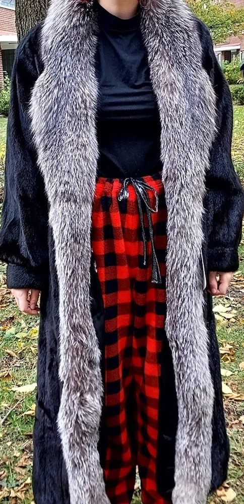 This vintage full-length mink coat with crystal fox tuxedo collar and lapels is a luxurious and stylish piece perfect for formal, casual, business, and/or festive occasions. Custom made for the owner by Abramson Furriers, the coat has been professionally maintained over the years. It is being sold as the owner now resides in a tropical climate and can no longer use it. Measurements are: 47” collar to hem 24” underarm to underarm 18” shoulder to shoulder 25” sleeve top of shoulder to cuff The lining is pristine, the pockets are lined in velvet, and the coat has a very large sweep.
