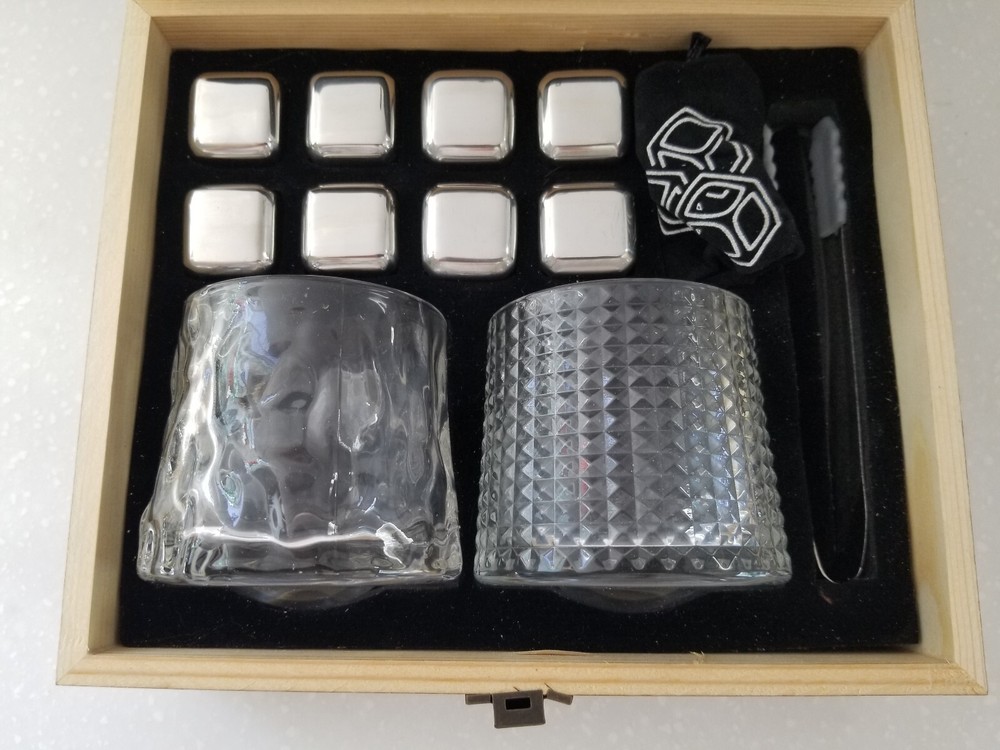 Elevate your whiskey drinking experience with this premium set of glass whiskey glasses and chilling stones. The set comes in a wooden hinged box and includes 2 glasses and tongs. The square shape of the stones ensures that they are easy to handle and store, while the stainless steel material guarantees durability. With 8 stones in the pack, you'll have enough to keep your drink cool without diluting it. Great Gift. Brand New. Please view photos.