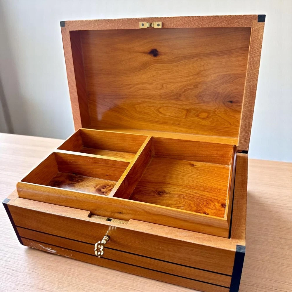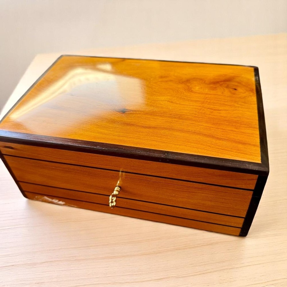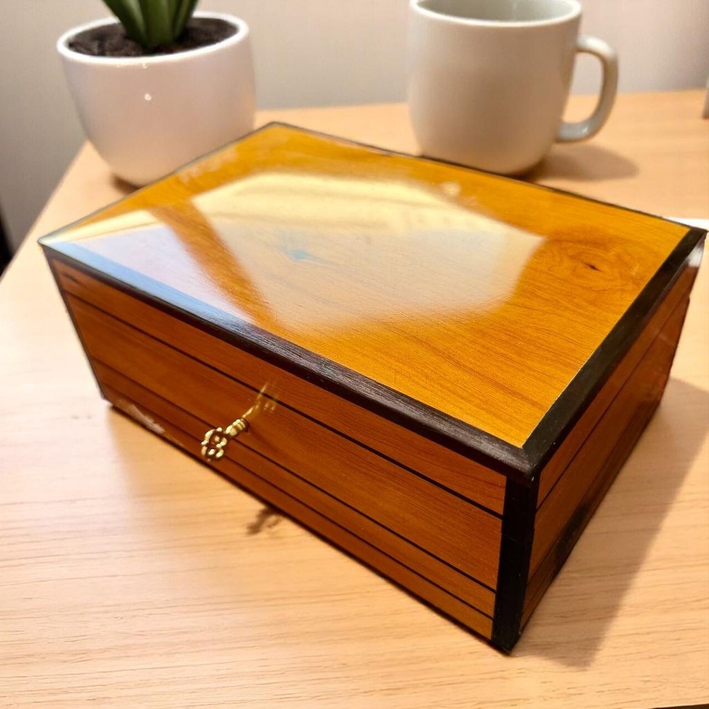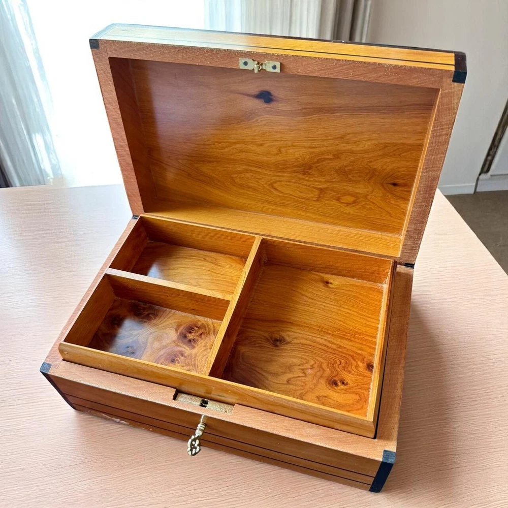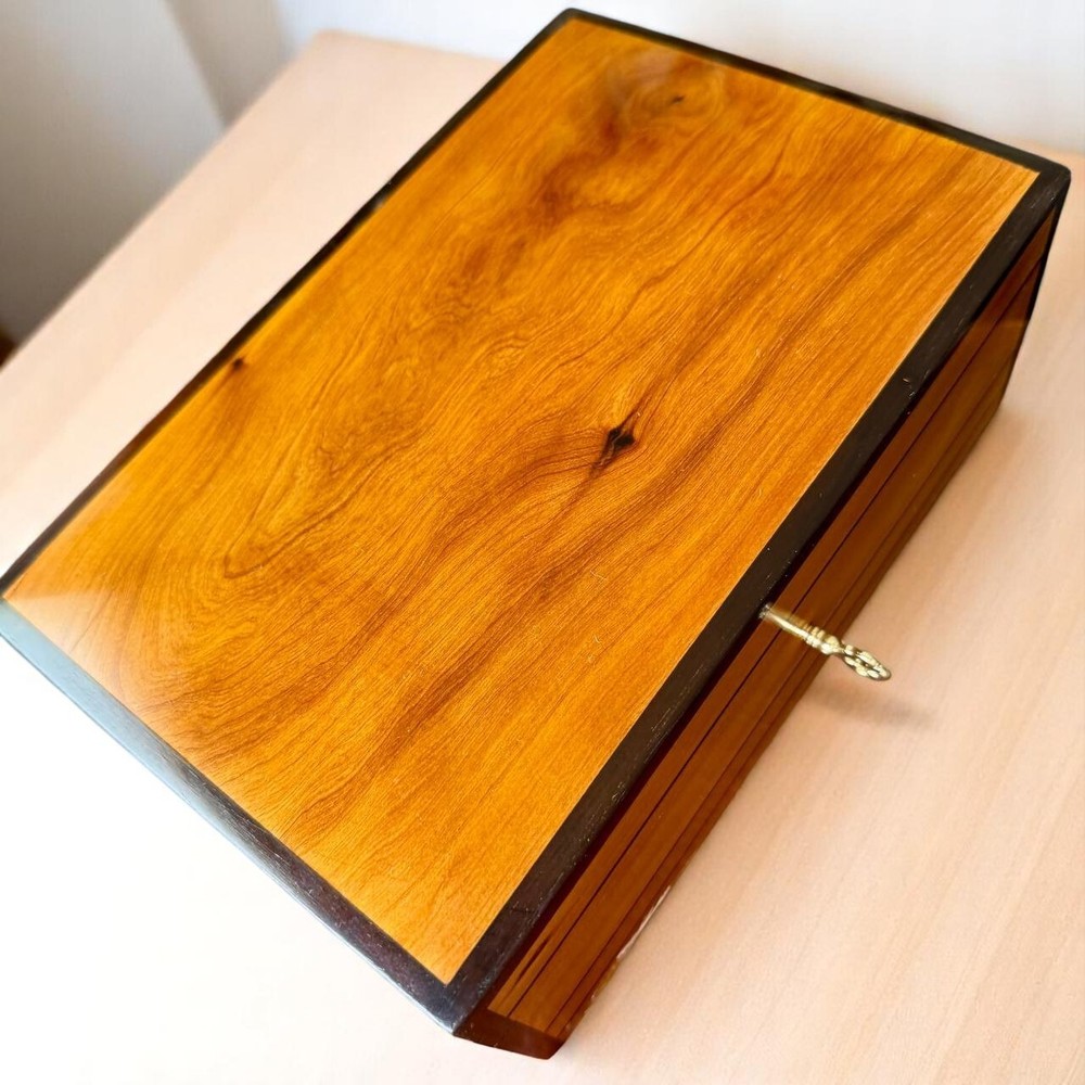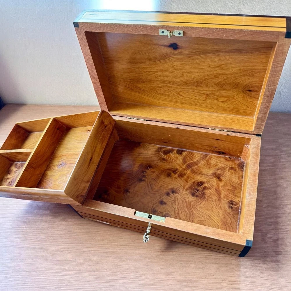 Experience the elegance and heritage of Moroccan craftsmanship with our Thuya burl wood jewelry box, meticulously handmade by skilled artisans. This exquisite piece is crafted from the rare Thuya burl — a fragrant, richly grained wood known for its natural beauty and strength. 🌿 Why Thuya Burl? Harvested from the buried root systems of long-deceased Thuya trees, this wood is prized for its density, durability, and aromatic oils. Every Thuya burl wood jewelry box carries a one-of-a-kind grain and scent, making it as unique as the treasures it holds. ✨ Key Features: ✔️ Made from authentic, sustainably harvested Thuya burl wood ✔️ Three internal compartments with two spacious storage levels ✔️ Lockable with a polished brass key ✔️ Customization available: lid engraving, leather or velvet interior ✔️ Perfect for jewelry, keepsakes, or as a premium gift 📏 Product Dimensions: • Length: 23 cm (9 in) • Width: 15 cm (5.9 in) • Height: 10 cm (4 in) 🎁 Ideal for birthdays, weddings, anniversaries, or special occasions, this Thuya burl wood jewelry box blends artisanal quality with practical elegance. 🚚 Shipping Information: Ships within 1 business day via DHL Express Estimated delivery: 3–5 business days worldwide 📩 Need a custom order? We’re happy to personalize your Thuya burl wood jewelry box with names, initials, or a special message—just let us know!