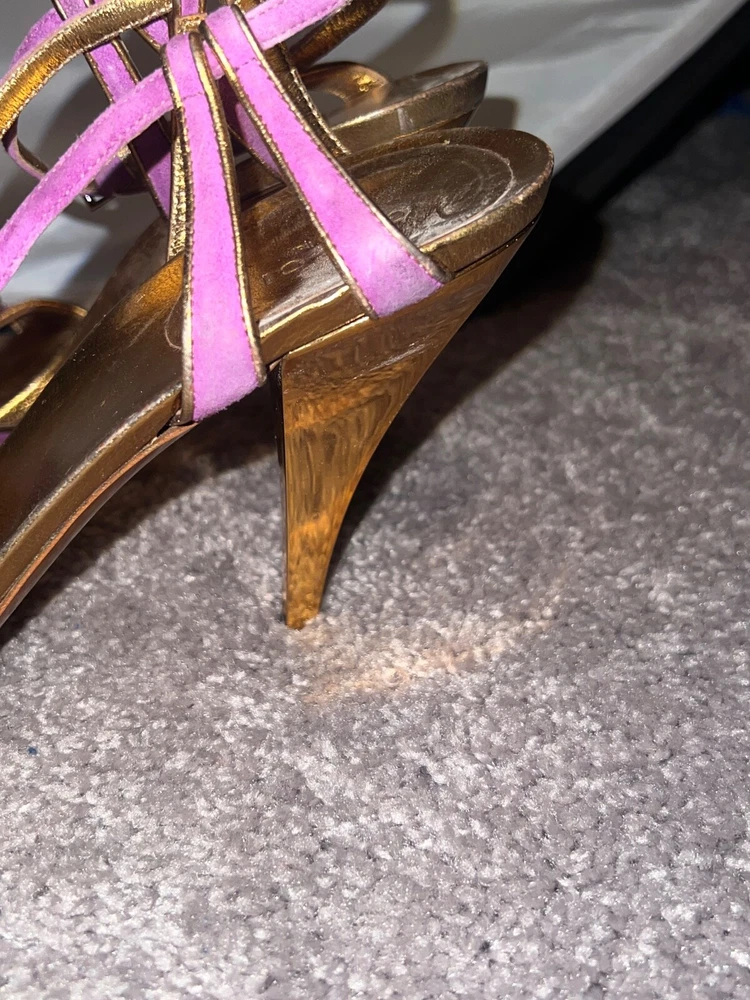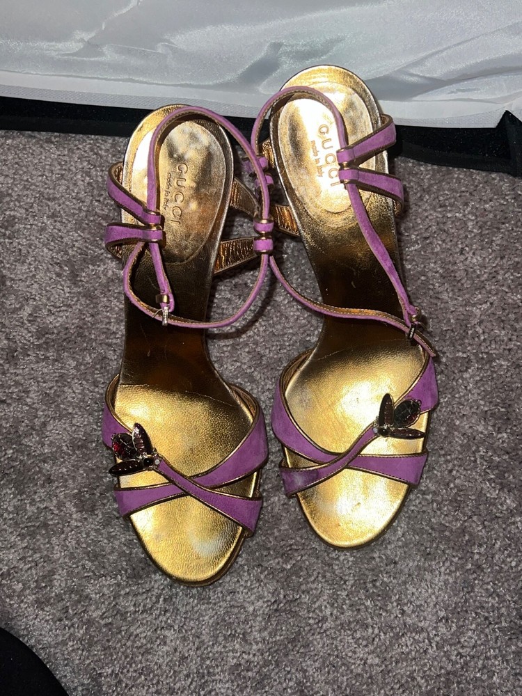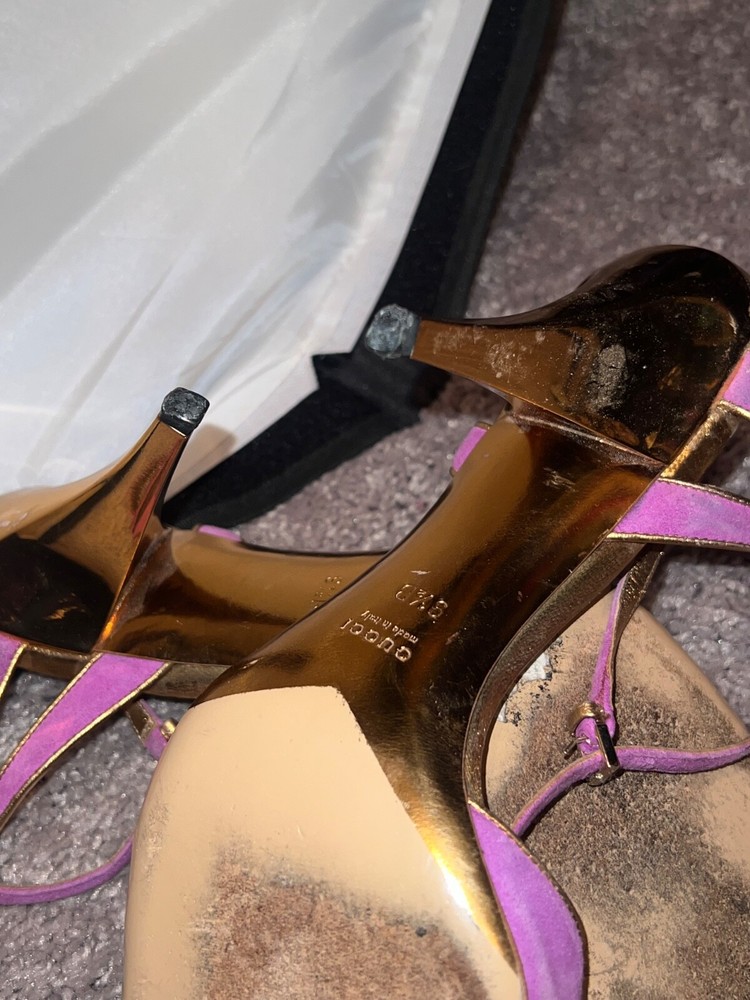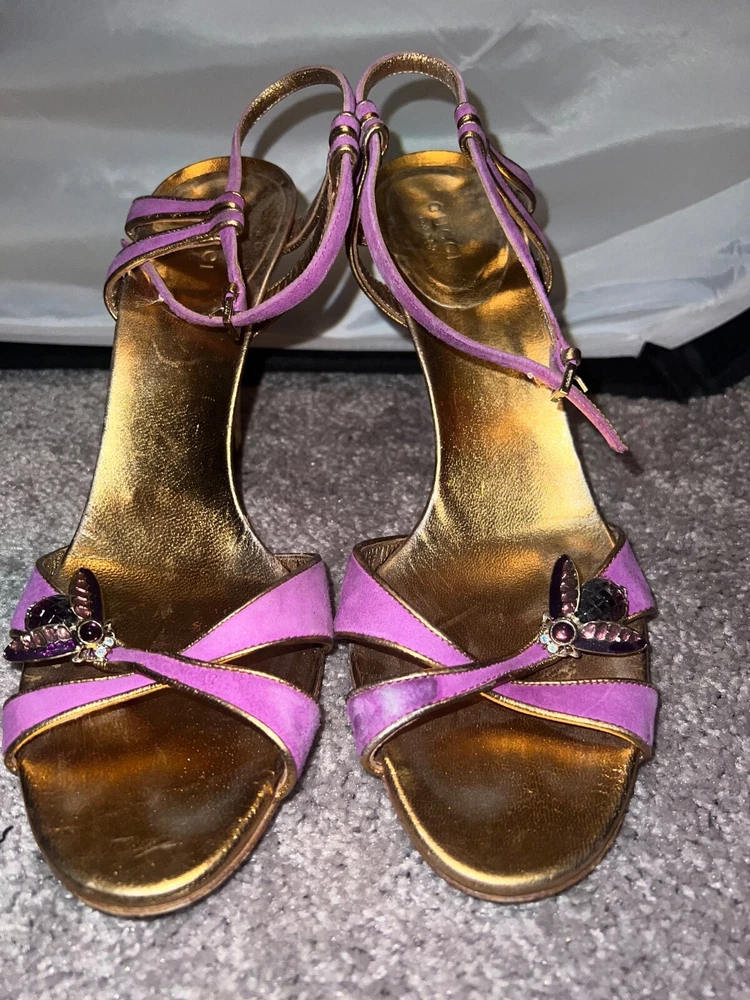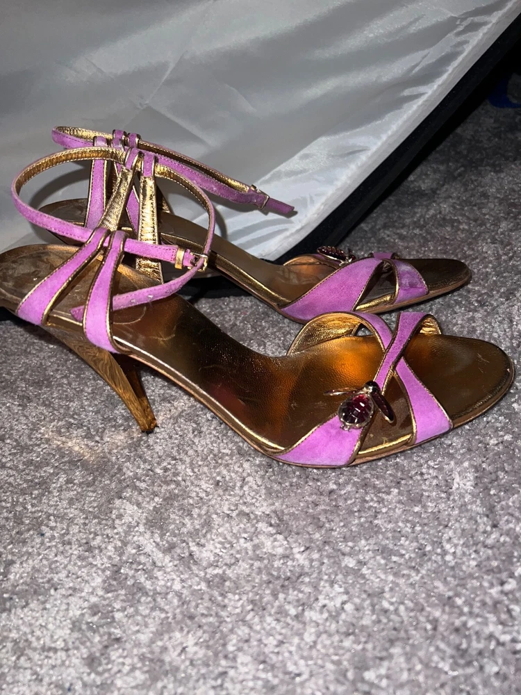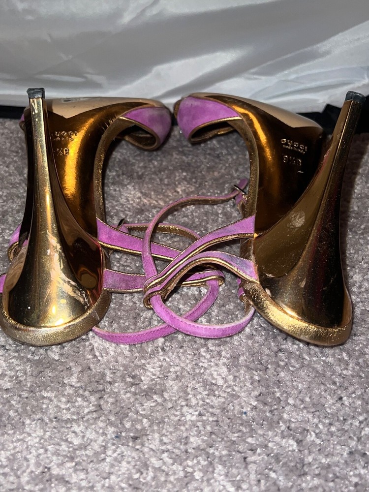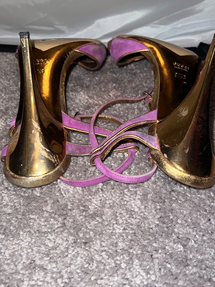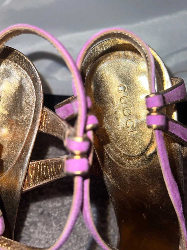 Step into a blend of luxury and comfort with these Gucci bumble bee emblem slippers, crafted for those who appreciate a touch of elegance in their everyday wear. The soft pink suede upper pairs effortlessly with the gold heel, creating a sophisticated and versatile look that's perfect for any occasion. Designed with a chic open-toe style and a flat type that promises all-day ease, these shoes are a must-have for any fashion-forward wardrobe. The distinguished Gucci brand ensures that every step taken is one of confidence and style, whether you're at home or out for a casual meet-up.