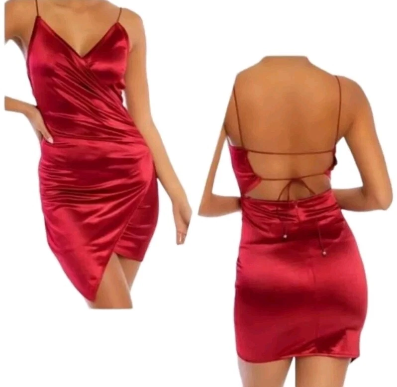 This beautiful wrap dress has a little bit of stretch. It looks like silk. It has a lace-up tie back. Asymmetrical hem with ruching at waist. Lined. Back zipper. "Please see the photos, which is a huge part of the description Adjustable straps. About 30" Length 17" across the chest In good preowned condition The red dress is used for reference only. Welcome ( TO MY LISTING ) We Strive for Excellence and our #1 Goal is to make our Customers Happy! Please Remember all Clothing Items may fit differently depending on Brand, Fit, Use or Prior customization. We strongly urge our customer's to check measurements or ask for measurements first to guarantee proper fitting. Shipping discounts will be provided for multiple purchases - Please Contact me after Multiple Purchases for a updated invoice. * Payment* Payment is expected as with eBay's policiy. If there is no prior arrangement to extend payment expectancy a nonpayment claim will be filed with EBay. *Returns* Returns are accepted for all items within the U.S.A ( No Returns for International Customer's ) unless otherwise noted in the listing. All items returned must be in original condition and may not have any additional flaws. If an item was sold "New with Tags" it must have all tags present. Please "SEE MEASUREMENTS" first to ensure proper fitting of garment. *Shipping* We ship the majority of our Products within 3 business day. We do not ship over the weekend. We will send you an updated invoice for purchasing multiple items at once from us. We ship our clothing items USPS Advantage Mail or Priority Mail. Tracking information will be provided with all purchases within the United States of America. We hold the right to refuse shipment to particular countries or buyers.