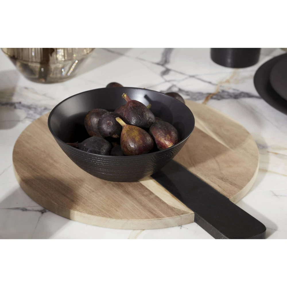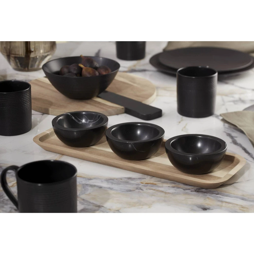 Simple meets sublime in these LX Collective dip bowls and serving tray. Juxtaposing modern marble bowls with an earthier wooden tray, the set comes together with a timeless appeal you'll appreciate for all your events.At , we strive to make the daily moments in your life a bit more special. Inspired by heritage and designed for now, we bring a rich history of craftsmanship to modern day life. We’ve been a part of homes for over 130 years. Each time you buy , you are buying a versatile and timeless piece crafted with our century-long commitment to quality, artistry and beauty. Whether you’re gathering the family for dinner, grabbing a midnight snack for yourself in front of the TV or having friends over, is for real moments that last on products that are meant for living. Materials: marble and wood Hand wash Includes (1) wooden serving tray and (3) marble dip bowls Tray measures 15"L x 5"D x 0.75"H; 4-oz bowl capacity Imported Promise