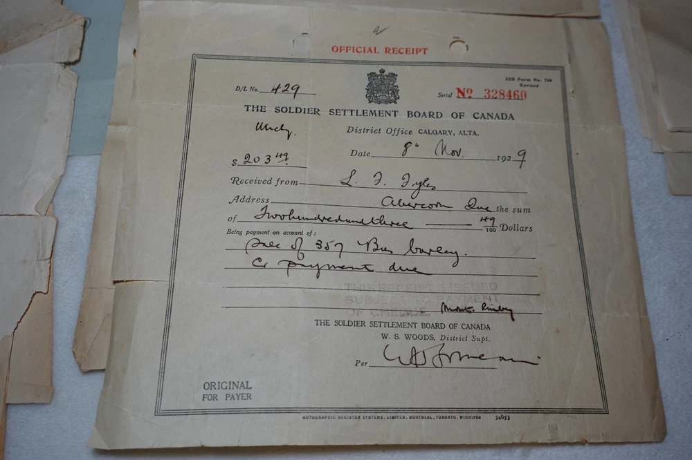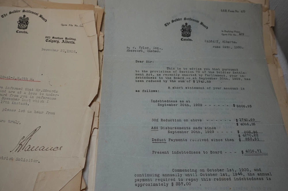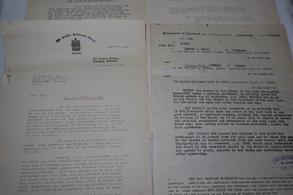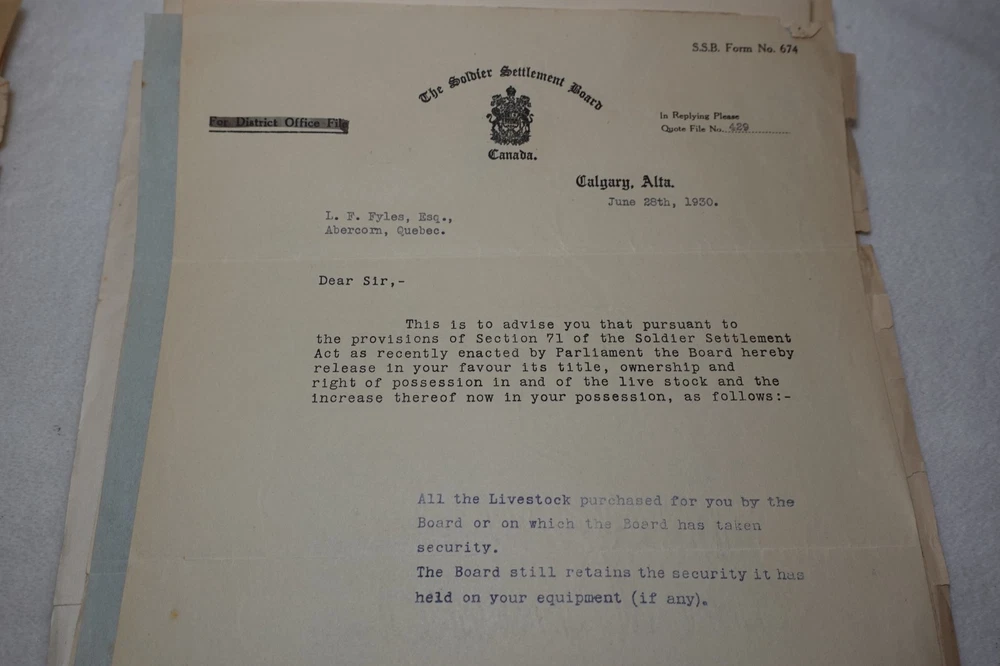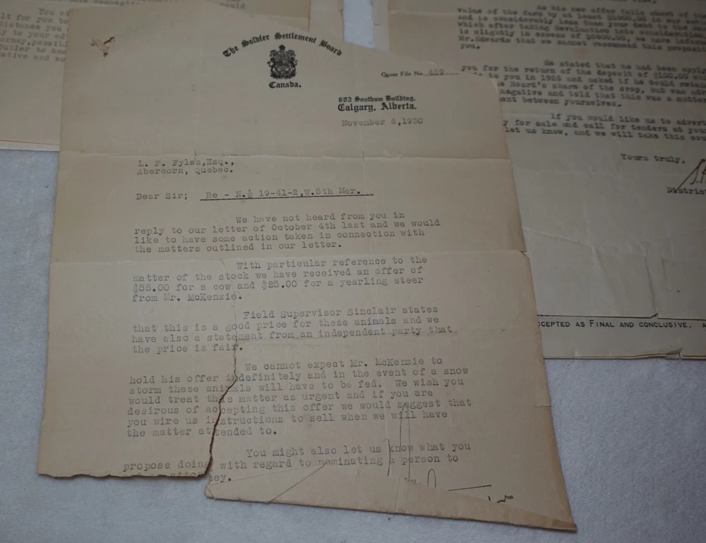 Lyndon F. Fyles Canada Soldier Settlement Board 1928-35 Abercorn Que Ephemera Papers Lot Papers related to Lyndon F. Fyles of Abercorn, Quebec. Fyles also appeared to have connections to Vermont. Years range from 1928 to 1935. Other cities mentioned on the papers are Calgary, Alberta, Rochester, Vermont, and Rimbey, Alberta. Fyles was born in 1891 and died in 1969. There are approximately 48 items (pages) in this lot. Pages range in size from 3 3/8" x 8" to 8" x 13". Documents mention the Soldier Settlement Board of Canada (Fyles was a World War I veteran), property, finances, and other topics. Included are a couple handwritten notes and letters. Some documents appear to be copies. Items are in weathered condition with heavy tearing, edge chipping, holes, folds, creasing, fading, dinged edges and corners, turned corners, staining, age discoloration and marks. Some documents have considerable tearing. Documents also have holes where staples or pins were removed. A couple of pages are stuck together. There is writing on the reverse side of documents, mainly arithmetic or notes. Please see photos for more information on condition and ask any questions you may have.